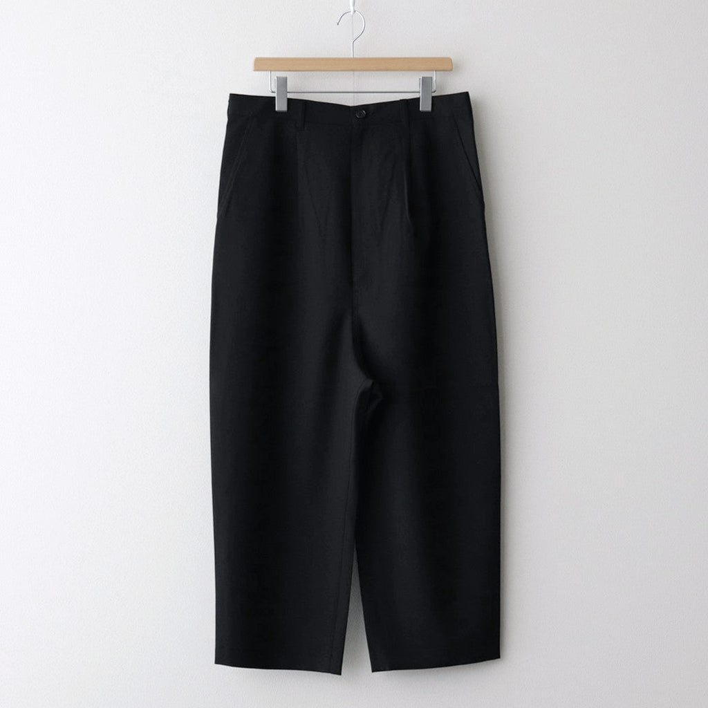 腿回りにゆとりを持たせ、裾に向けてわずかにテーパードをかけたワイドストレートシルエットの一着。ウエストはベルトループ付きでタックを一つ入れたゆったりとしたシルエットに。両サイドにスラッシュポケット、バックにもボタン付きのポケットを設計。