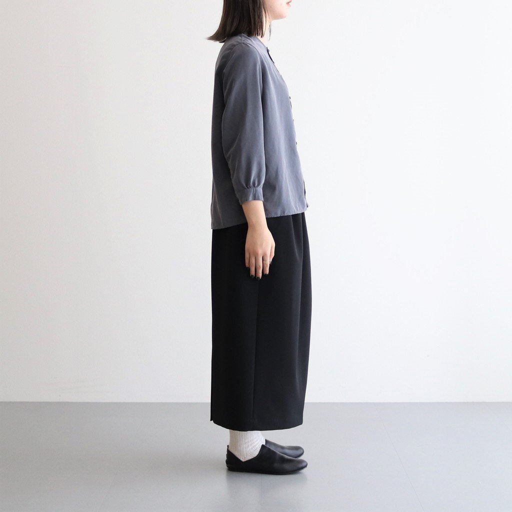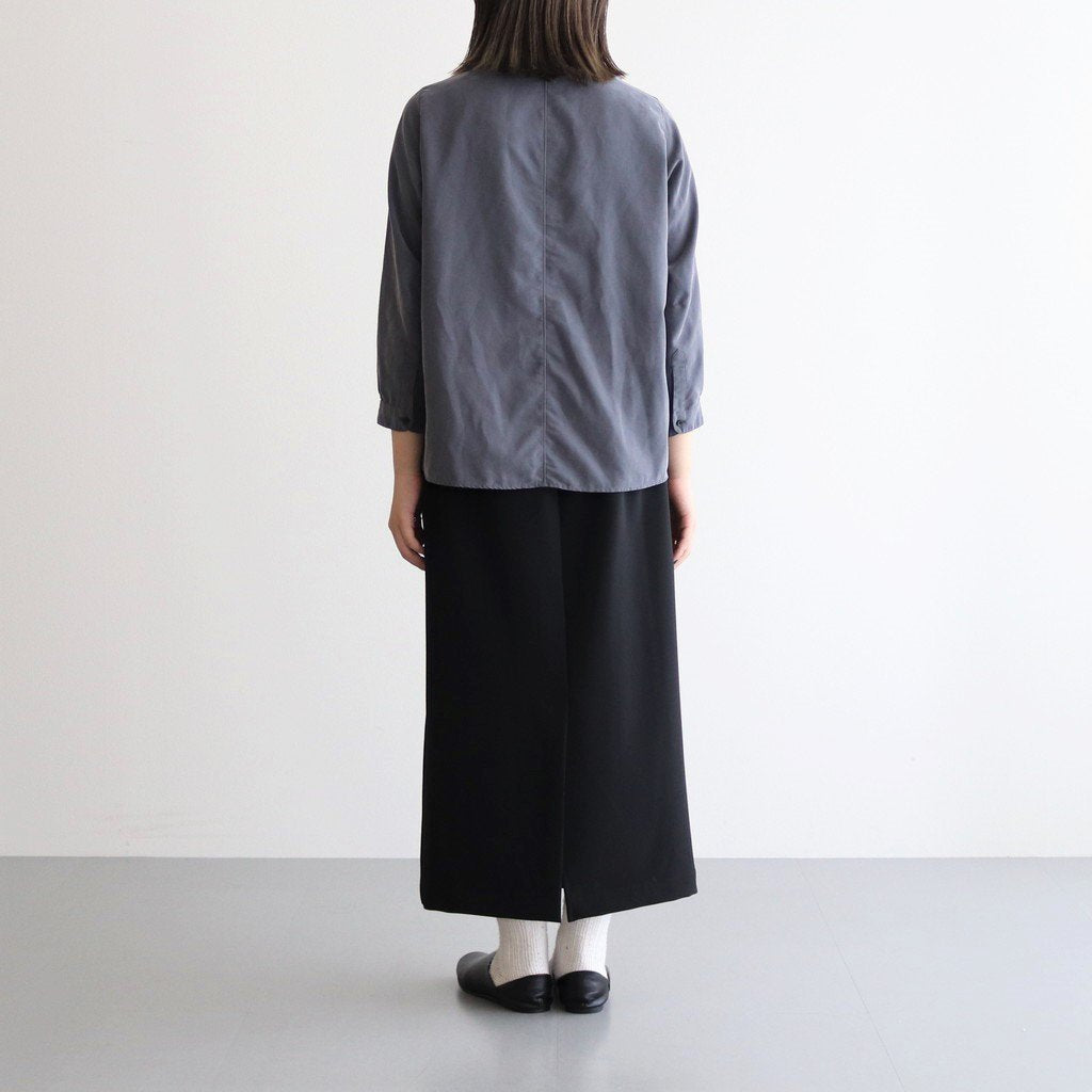 「フィブリルレーヨン&ポリエステル・シャツポプリン」テキスタイルを使用したセミワイドシルエットのノーカラーシャツ。経糸に30/1レーヨン糸、緯糸に100dのポリエステル糸を使った平織のシャツ生地を使用。レーヨンをフィブリル化させピーチタッチな触感にしており、ポリエステルとの混合素材のため手入れもしやすく扱いやすい生地です。仕上げに製品洗いとタンブラー乾燥させることで、膨らみと風合いを出しています。肩周りやアームはスッキリとさせ、身幅にゆとりを持たせたリラックスした印象で快適な着心地のシルエット。裾をほぼフラットの緩やかなラウンドにしてゆとりのある身幅とバランスをとった独自性のある形です。衿はノーカラーデザイン、袖口はシングルカフス仕様。袖先にギャザーを入れることでふんわりとした丸みを持たせると共に納まりを綺麗にしています。小さめのボタンがとても可愛いです。細かく整列した丁寧なステッチもこのシャツの良さです。ステッチはボディと同色にしてプレーンな印象に。コーディネートにも取り入れ易い長く愛用して頂ける一枚です。