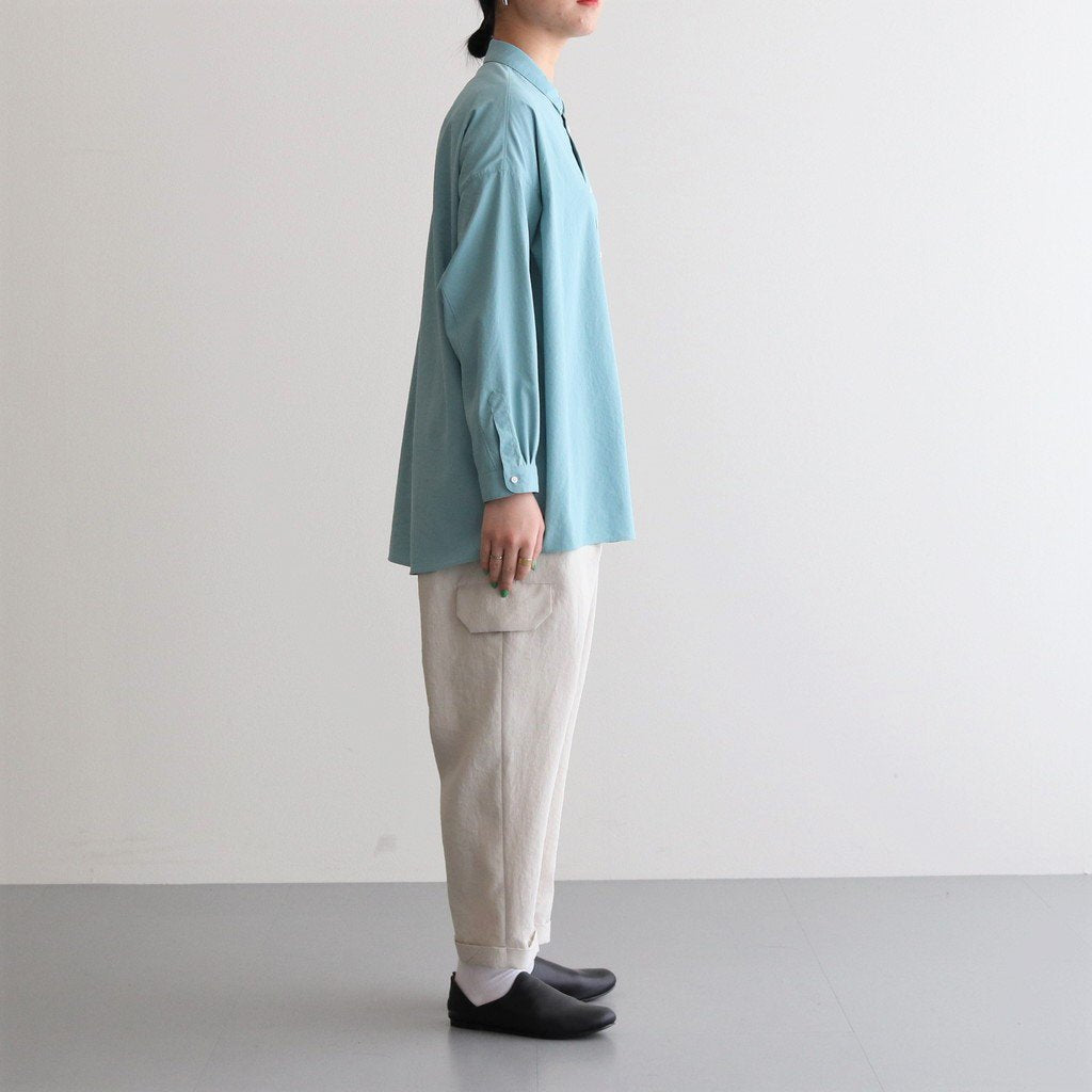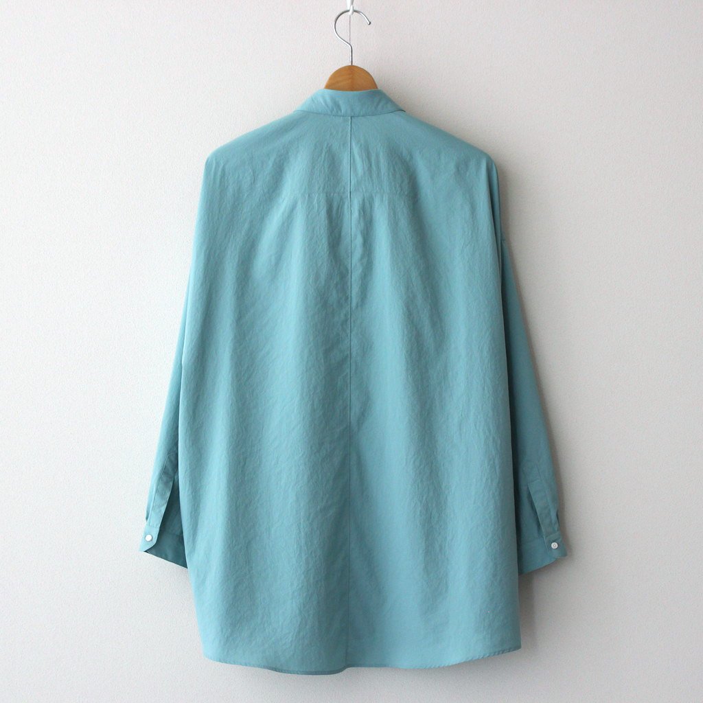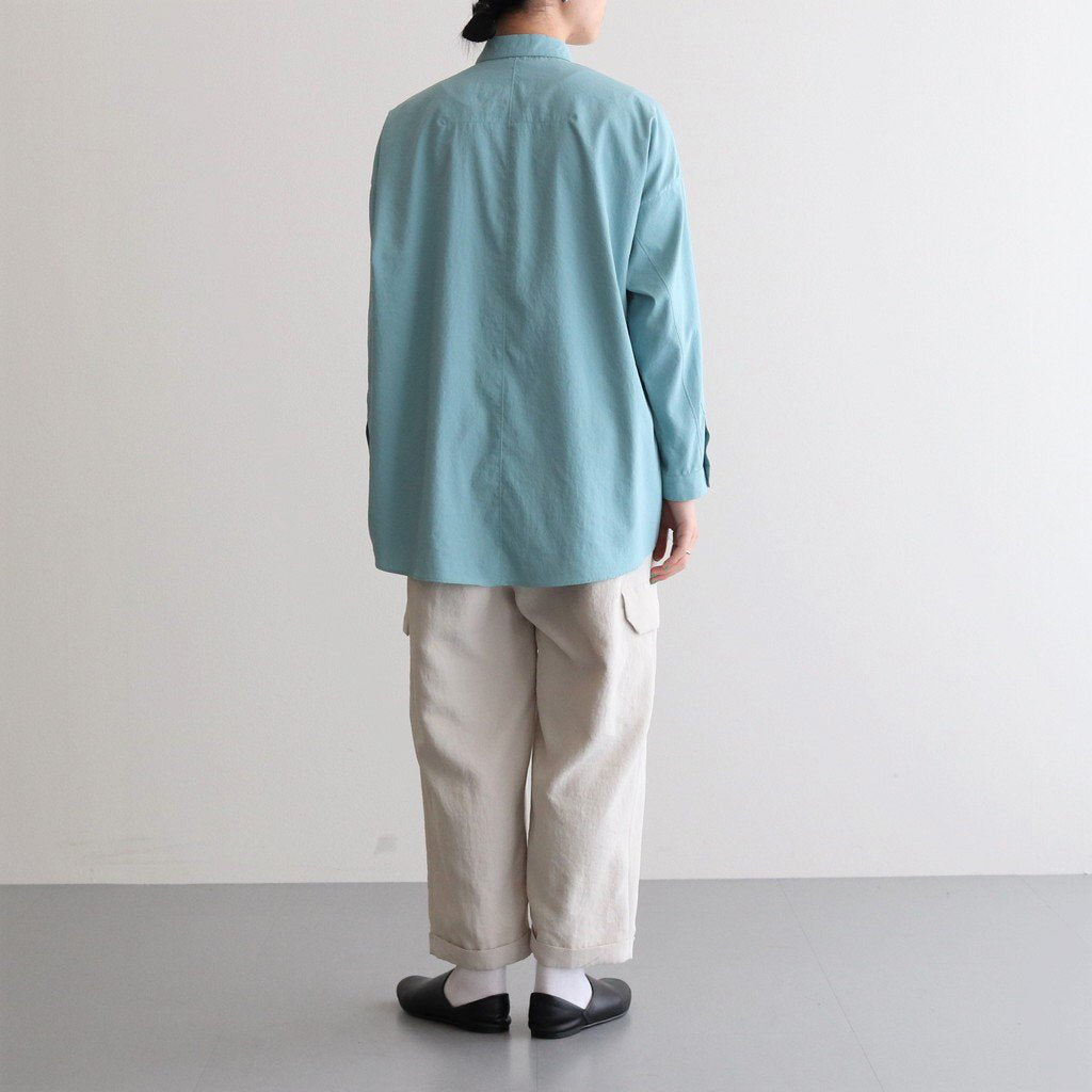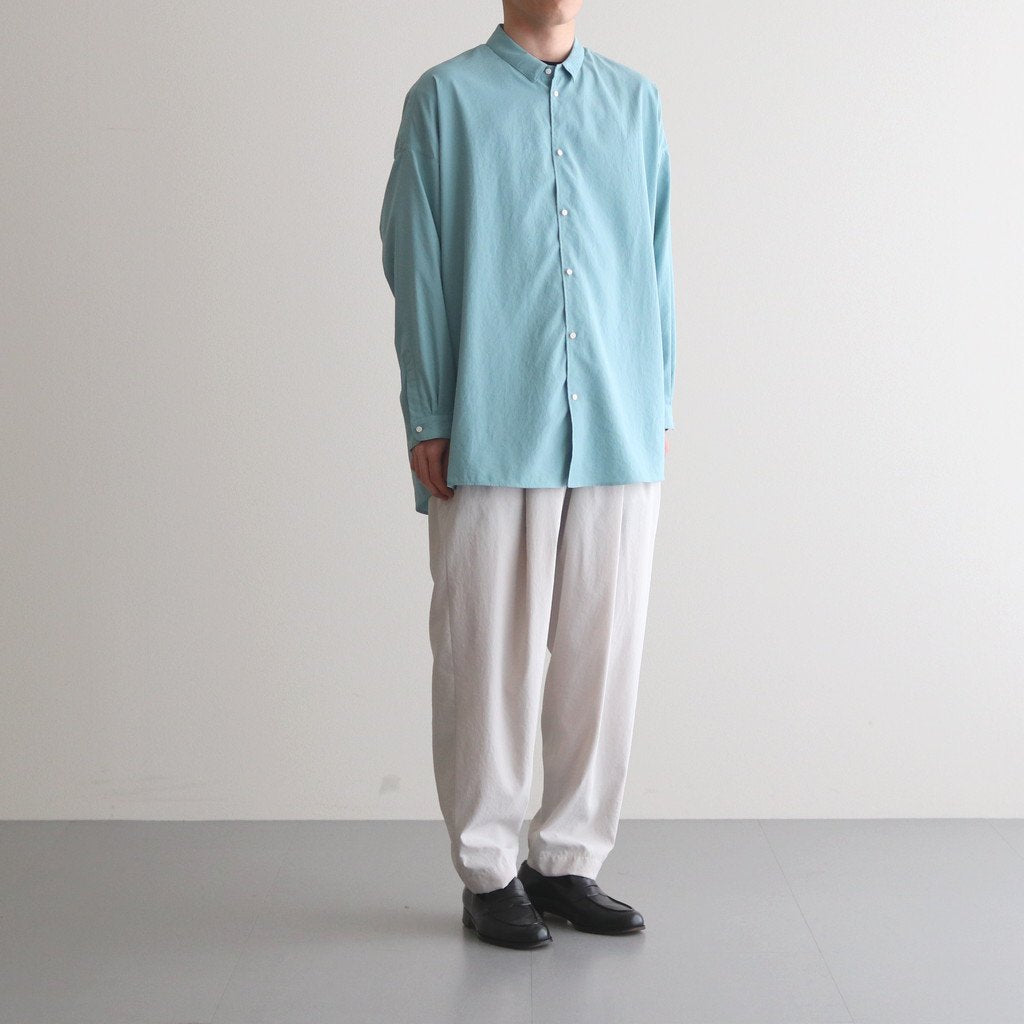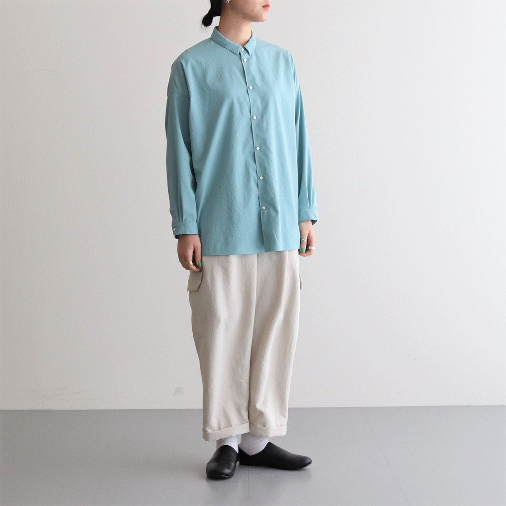 肩周りと身幅にたっぷりとゆとりを持たせ、袖丈と着丈でバランスを調整した、リラックスした印象で快適な着心地のワイドシルエットです。裾をほぼフラットの緩やかなラウンドにしてゆとりのある身幅とバランスをとった独自性のある形です。衿はスモールカラーデザイン、袖口はシングルカフス仕様。袖先にタックを入れることでふんわりとした丸みを持たせると共に納まりを綺麗にしています。釦には高級感のあるボタンを採用、小さめのボタンがとても可愛いです。細かく整列した丁寧なステッチもこのシャツの良さです。ステッチはボディと同色にしてプレーンな印象に。コーディネートにも取り入れ易い長く愛用して頂ける一枚です。