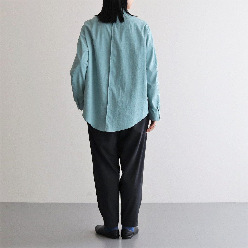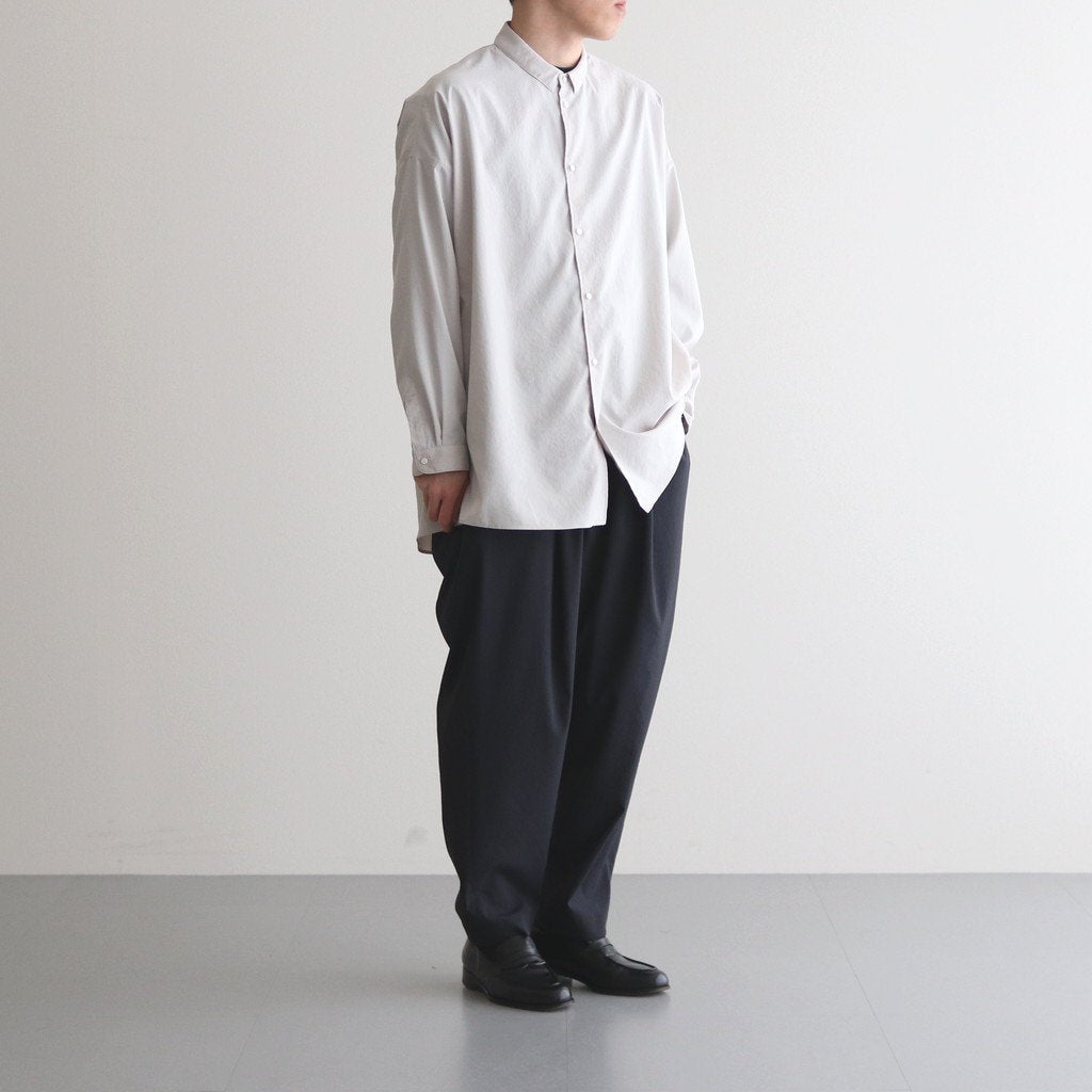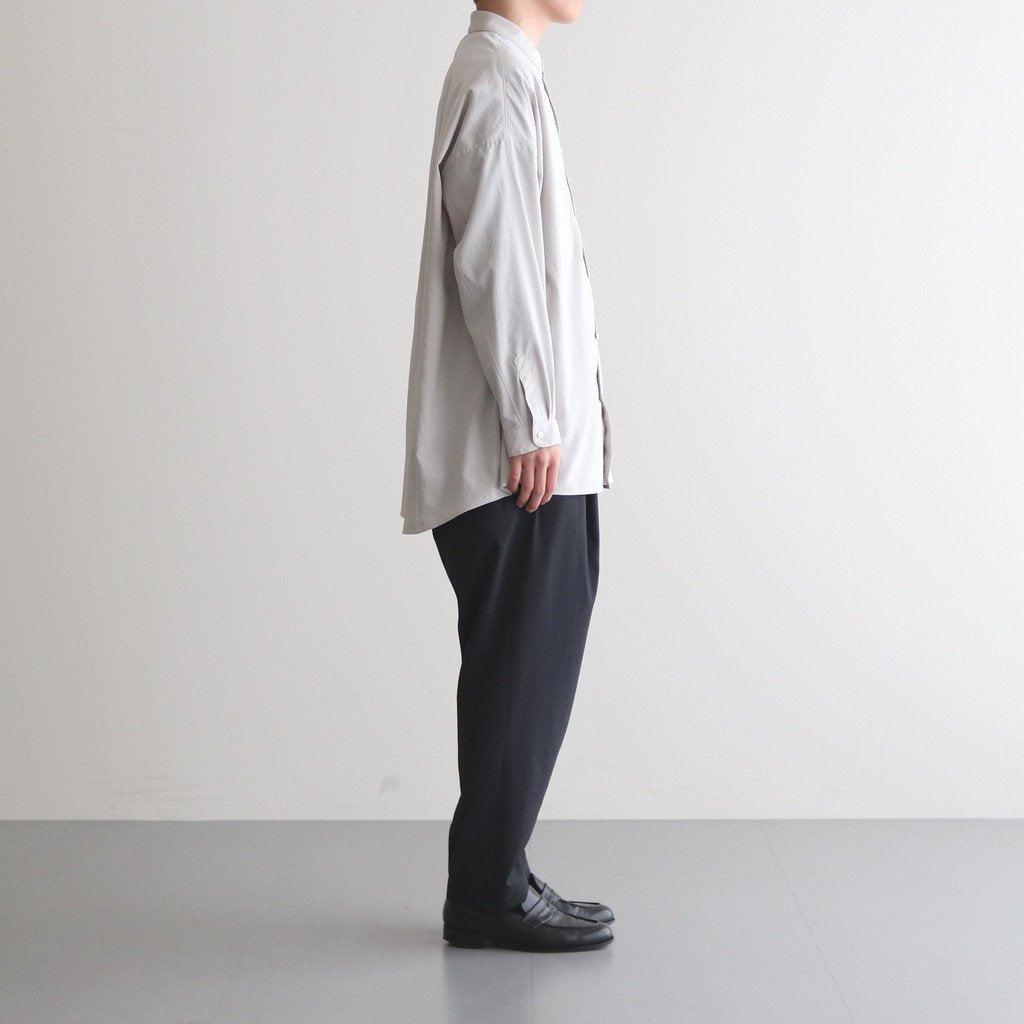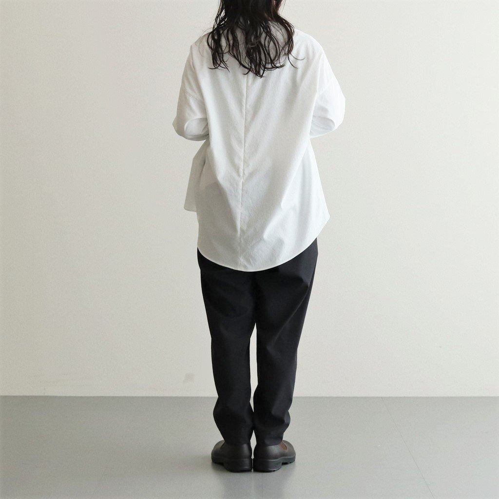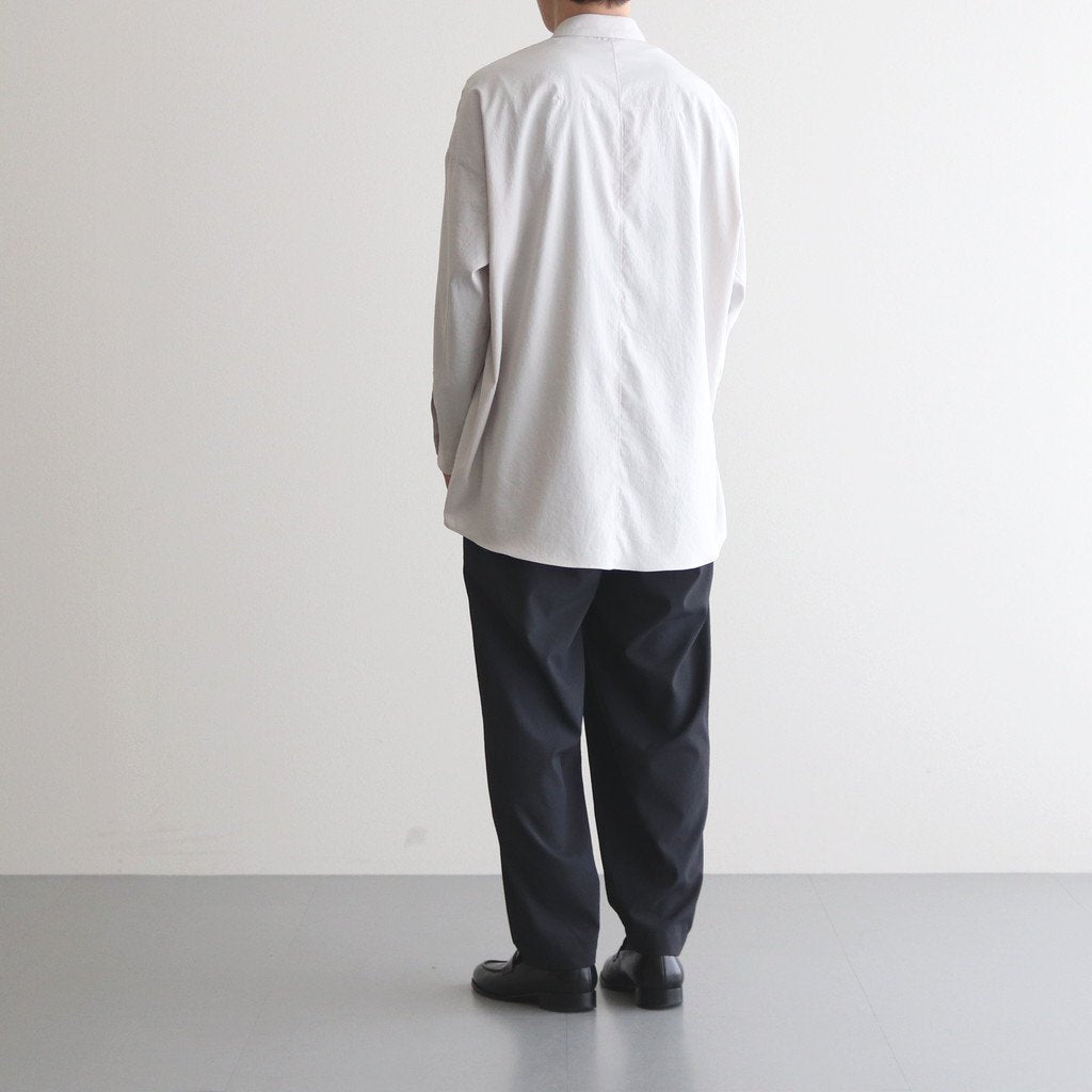 「マットポリエステル・タイプライター」テキスタイルを使用しています。光沢のないポリエステルのタスラン加工糸を高密度のタイプライターに織り上げた同生地は、特性として生地自体が透けにくいため薄めに仕上げることができ、軽快で爽やかな雰囲気となっています。SY加工を施し表面に細かなシワ感を出すことでナチュラルな風合いが特徴で、着用後も目立つシワの付かない非常に扱いやすい生地となっています。