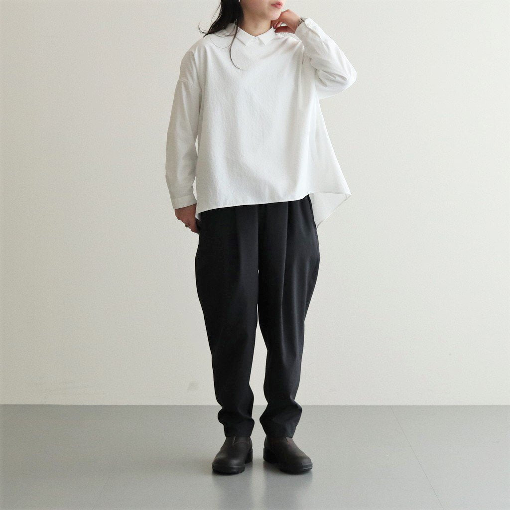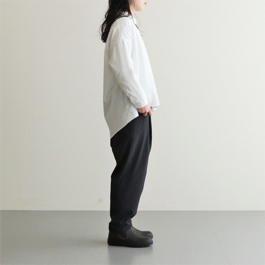 裾に掛けて強く絞りを入れたリラックスした印象のスッキリ細身のシルエット。フロントにアウトタックを入れ、独自のパターンニングにすることで丸みのある綺麗なシルエットを表現。長すぎず短すぎずのレングスに設定されているためウエストの穿く位置を調節することでシルエットのアレンジが可能。ステッチをボディと同色にしてプレーンな印象に仕上げています。