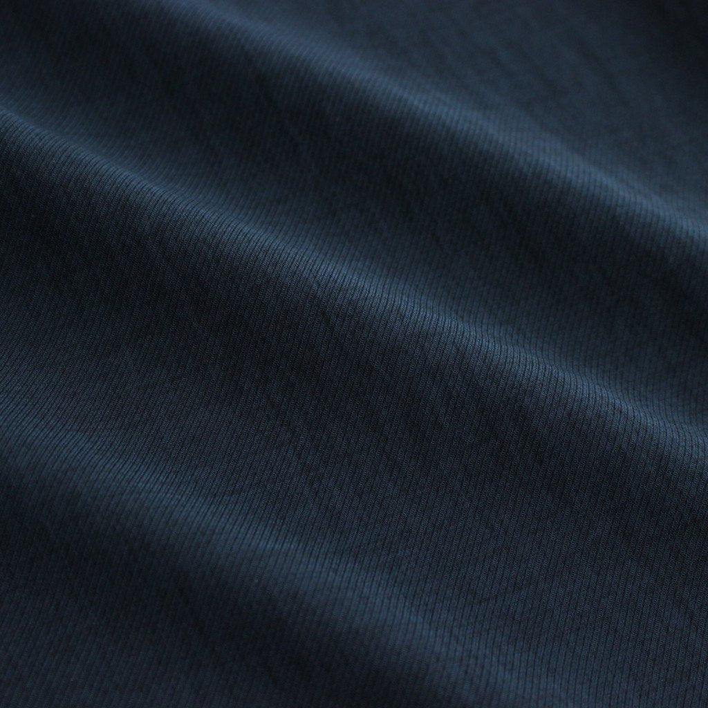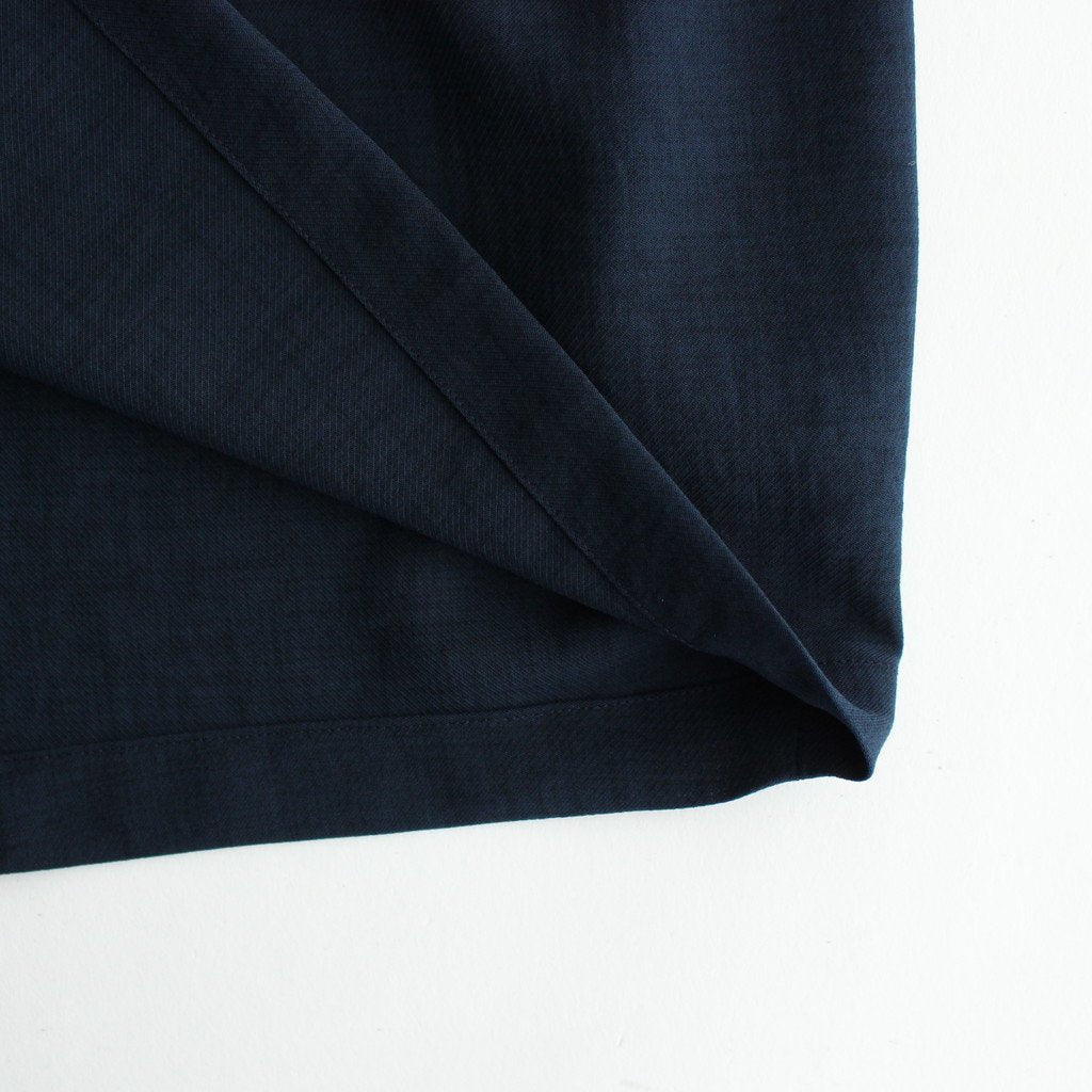 「スパンポリエステル・ドレープカルゼ」テキスタイルを使用。 生地全面に強撚のポリエステル糸を使用し、敢えて太い部分と細い部分がある不揃いの糸を使用することによって杢調の生地に仕上げています。一般的にはドライな生地感になる強撚糸ですが、特殊な加工によって柔らかくナチュラルな風合いを持ち合わせた生地に仕上げられています。ストレッチ性と落ち感がありシワにもなりにくく、一見繊細な生地にも見えますがご家庭でのお洗濯も可能なイージーケア素材です。