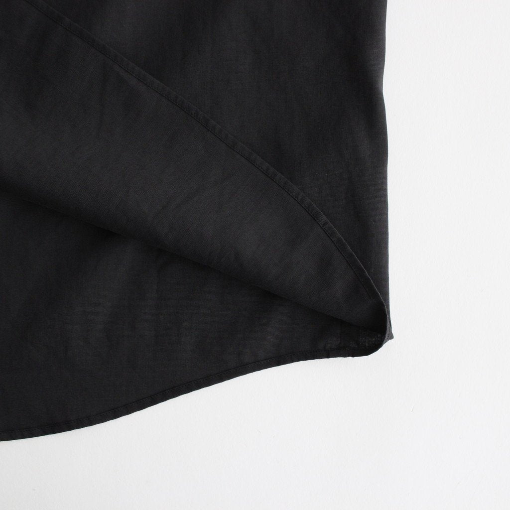 衿は前後で形が異なり、フロントをスモールカラー、バックをラウンドカラーとした女性らしいデザインです。背面中央のシームに沿ってコンシールファスナーが設計されていて着脱も容易に行える仕様に。肩周りと身幅にゆとりを持たせたボックスシルエット。裾をほぼフラットの緩やかなラウンドにして、ゆとりのある身幅とバランスをとった独特且つ収まりの良いパターンワークで仕上げられています。素材の落ち感によって生まれる品のある綺麗なシルエットが印象的な一着です。