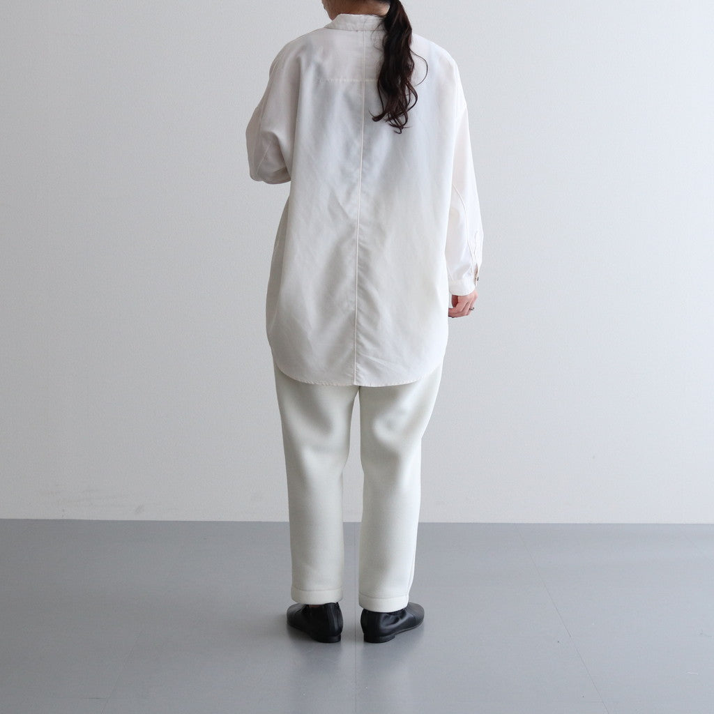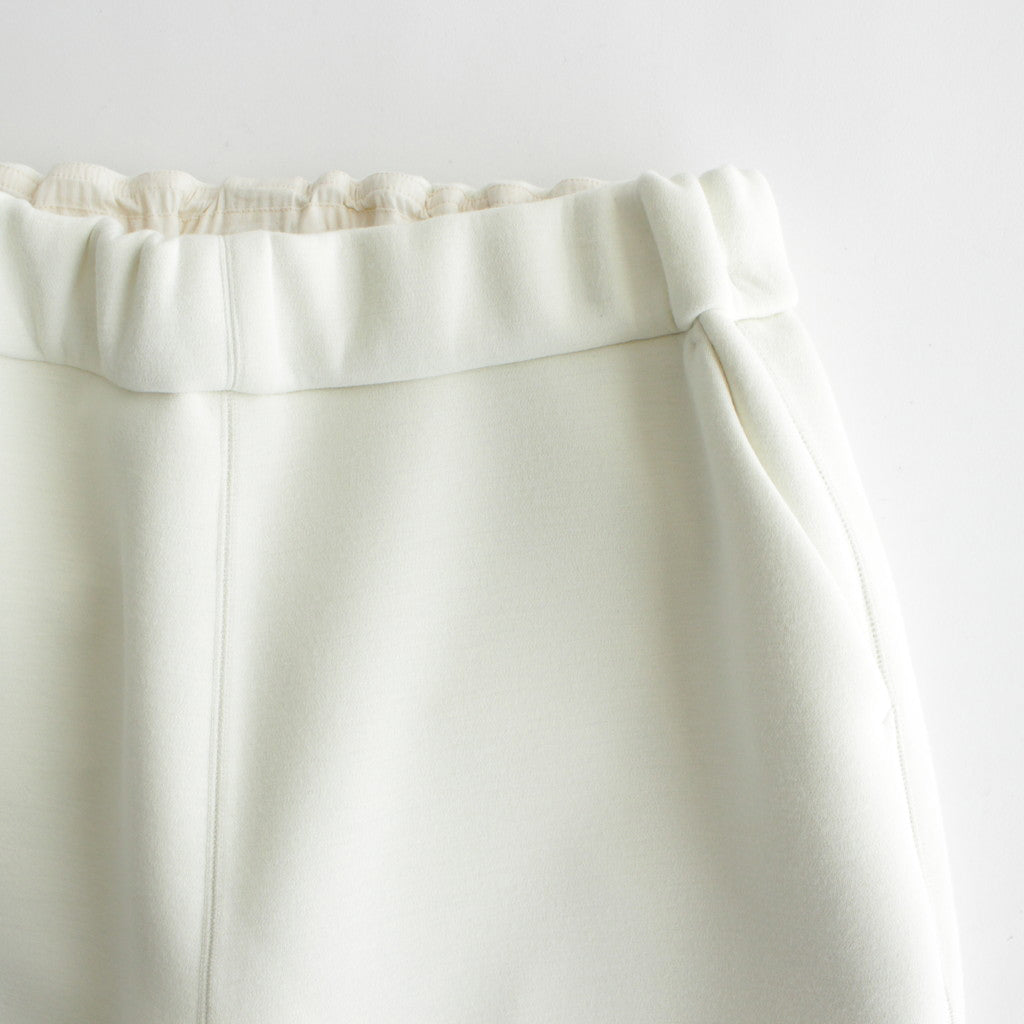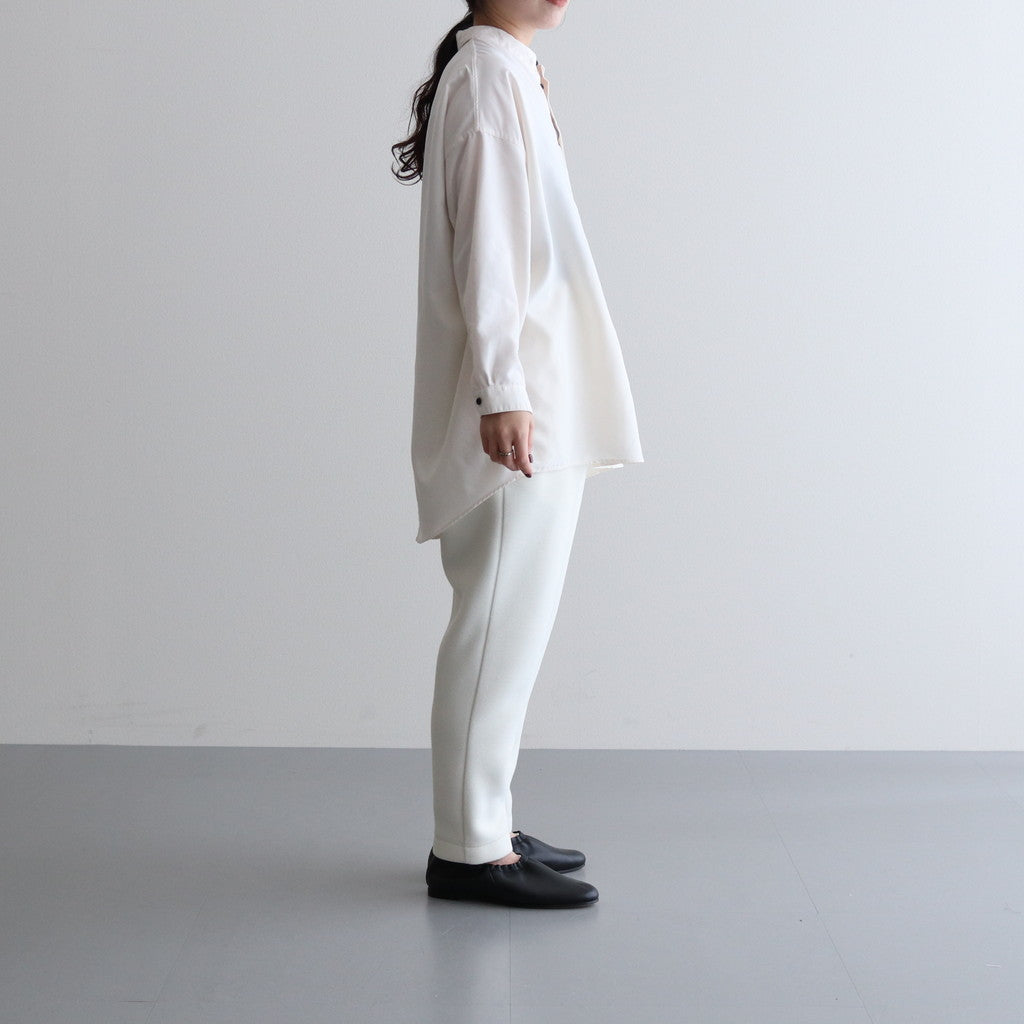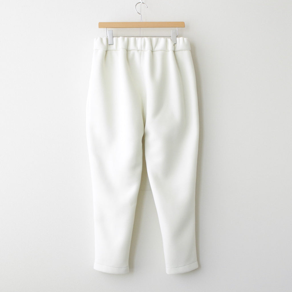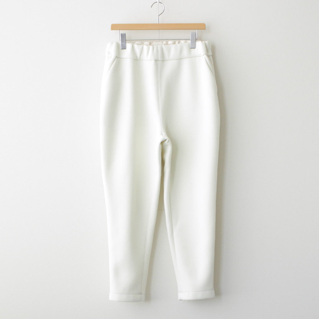 コンパクトなサイズ感のスリムテーパードシルエットで製作。レングスも9分程度に調整することですっきりとした印象に仕上げています。ウエストはゴムが入ったイージー仕様。脇線に合わせて両サイドにポケットを配置。ほどよいリラックス感ときちんとしたシルエットを組み合わせた快適で便利な一本です。