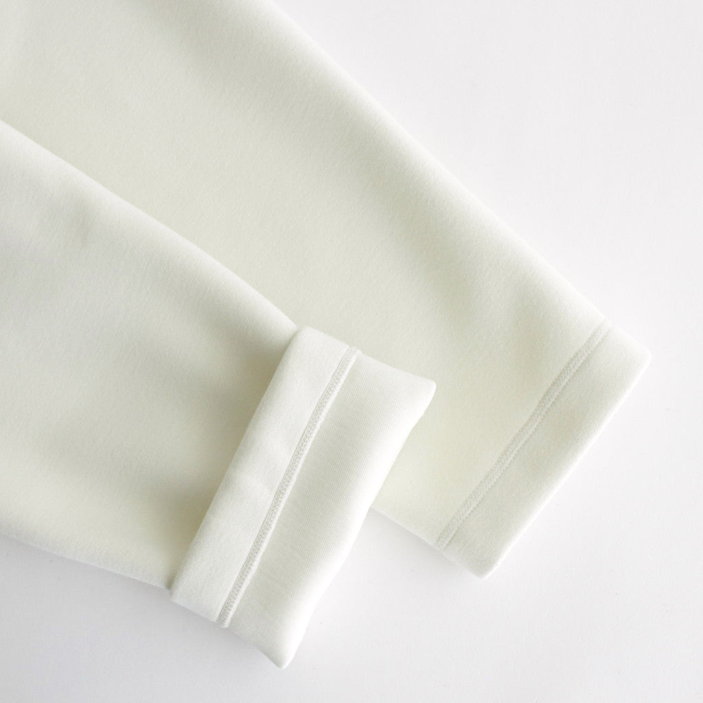 毛玉のできにくいポリエステル製のスパン糸を使用したダンボールニットを使用。かなり肉厚ですが着心地が軽く、保温性の高さも魅力の生地です。またご家庭で洗濯できるのも便利な点。スパン糸なのでポリエステル特有の嫌な光沢感もなく独特な風合いの素材です。
