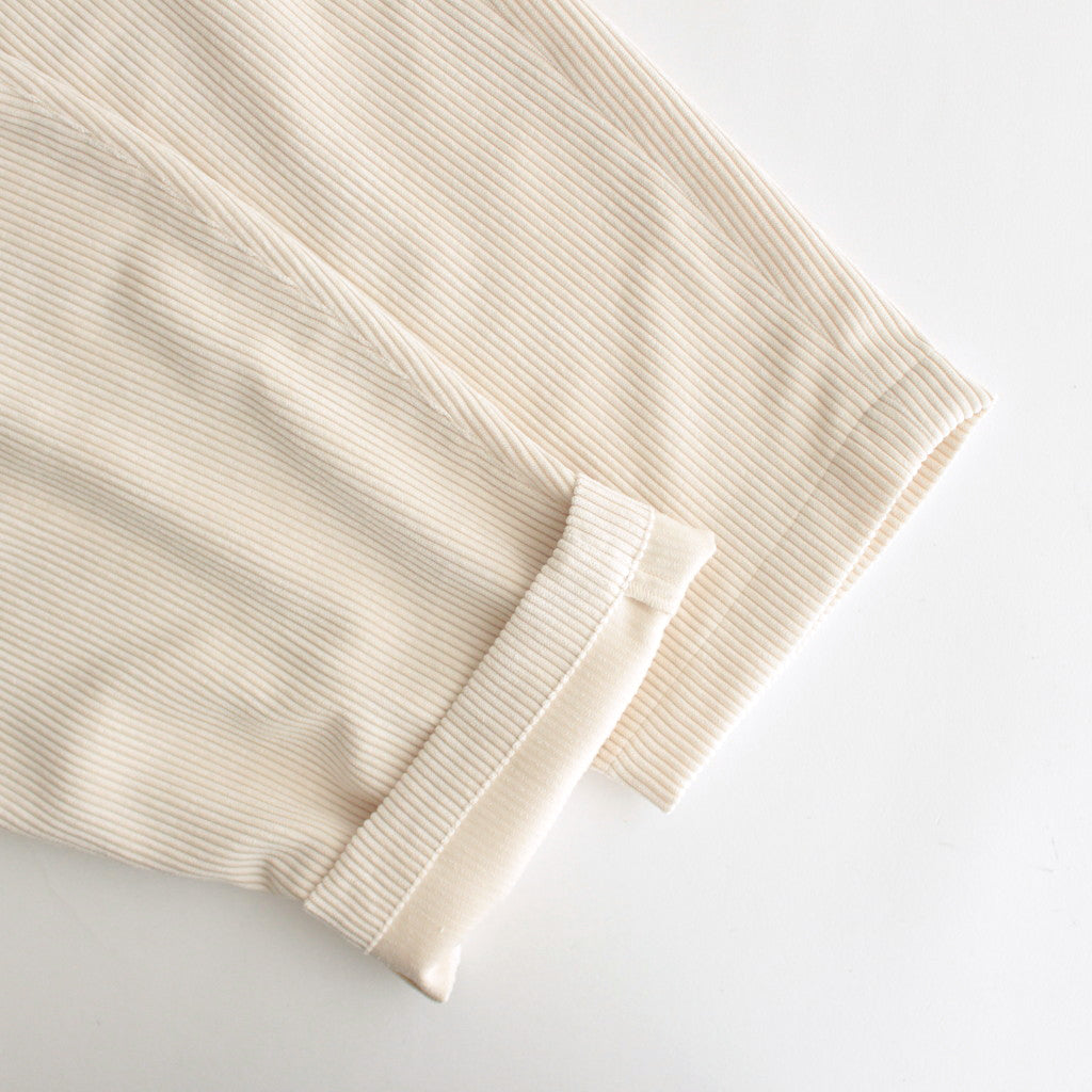 縦糸に細めのポリエステル糸を、横糸にはポリエステルとナイロンをミックスした中太の糸を使用して織り上げたコーデュロイ生地です。一般的なコットンのコーデュロイに比べてコシがなく、程よい生地厚がありながらも柔らかさや落ち感がお楽しみいただける生地となります。