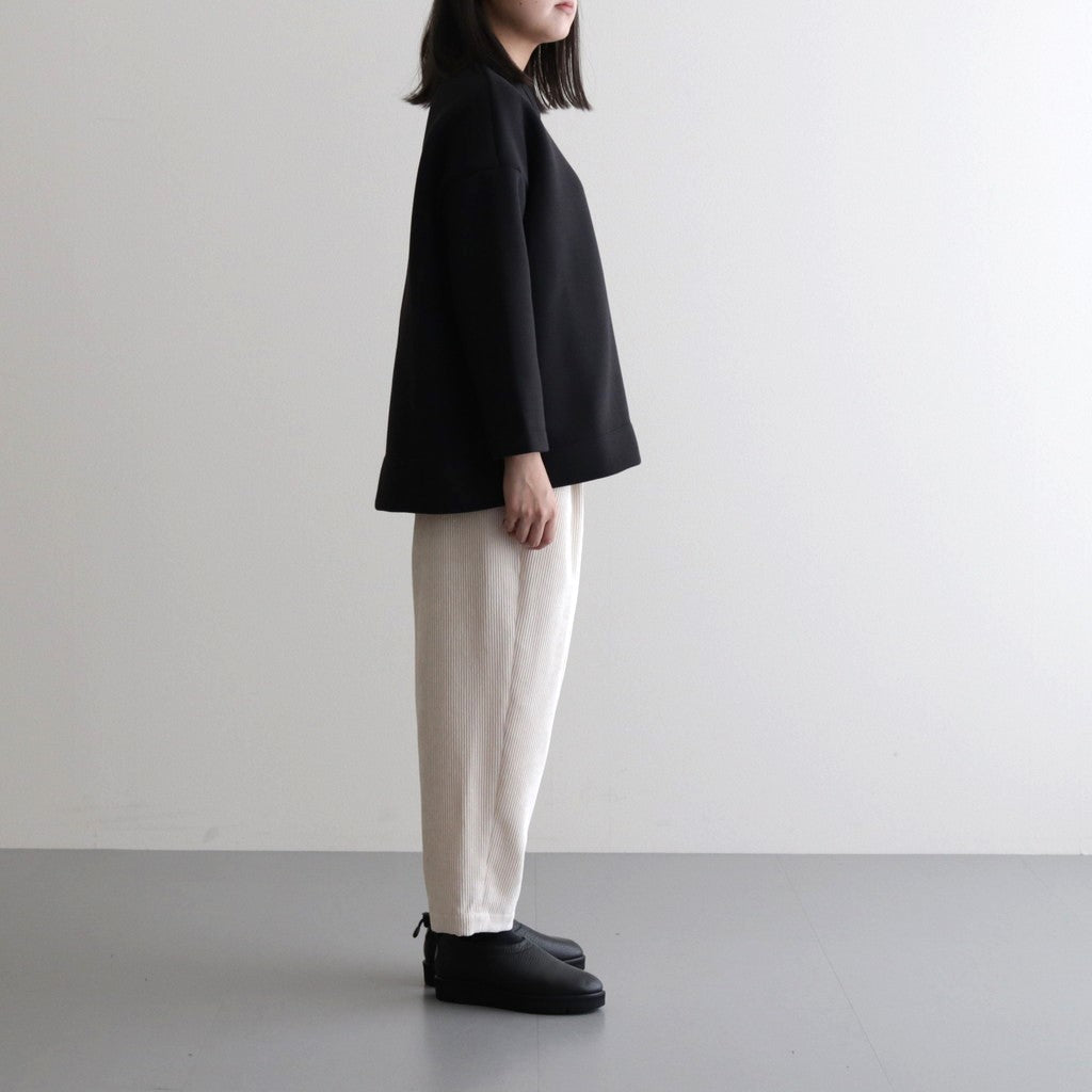 ウエストはゴムとドローコードで微調整が可能なイージーパンツデザイン。股上を深めにとることで腰周りに程良くゆとりを持たせ、裾に掛けて絞りを入れたリラックスした印象のテーパードシルエット、アンクル丈~フルレングス程度の長さです。フロントに2本のアウトタックを入れ、独自のパターンにすることで丸みのある綺麗なシルエットを表現。ウエストの穿く位置を調節することでシルエットのアレンジが可能。腰の位置にハンドポケット付き、バックは右側のみフラップポケットを配置しています。