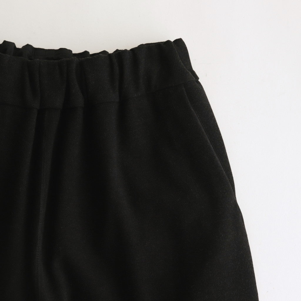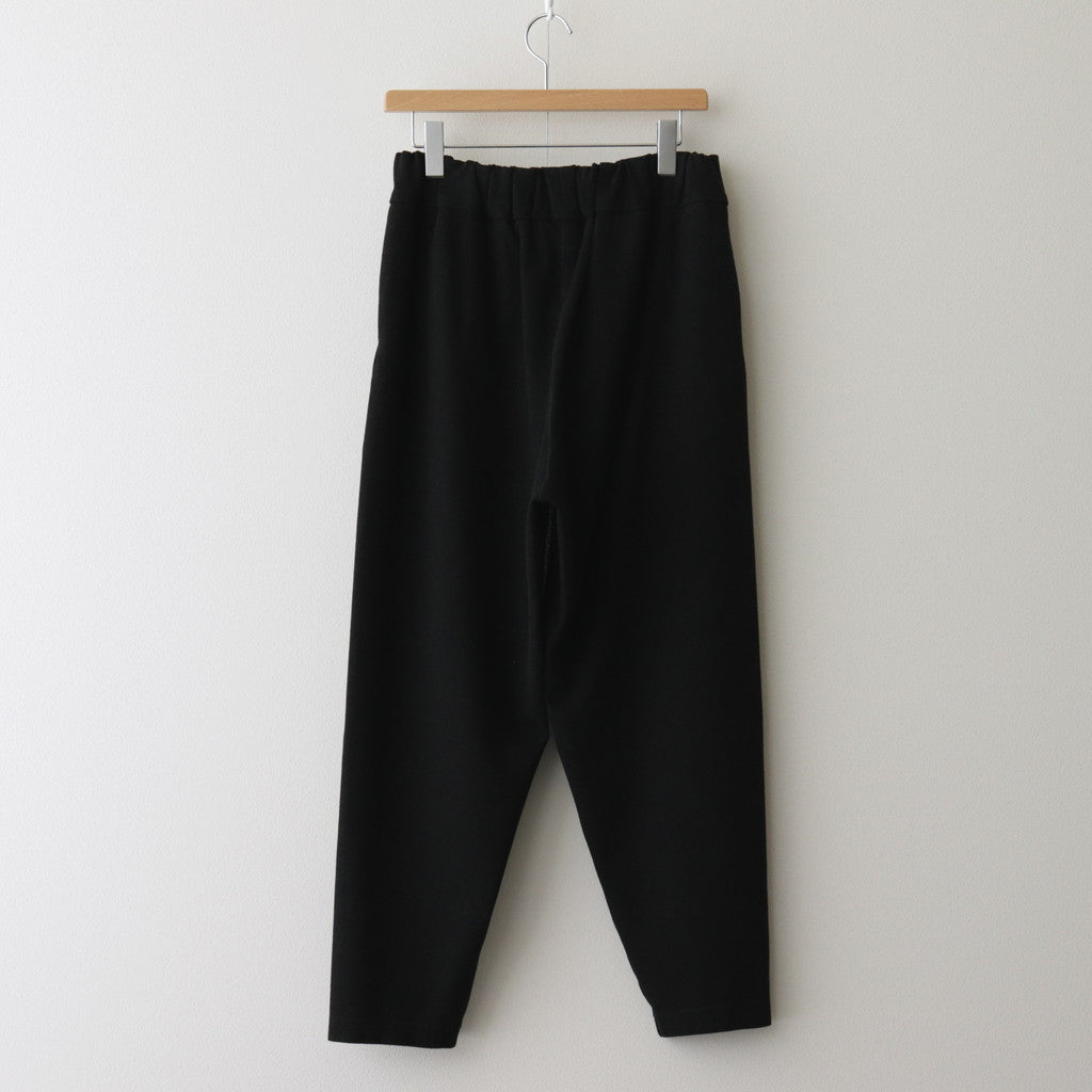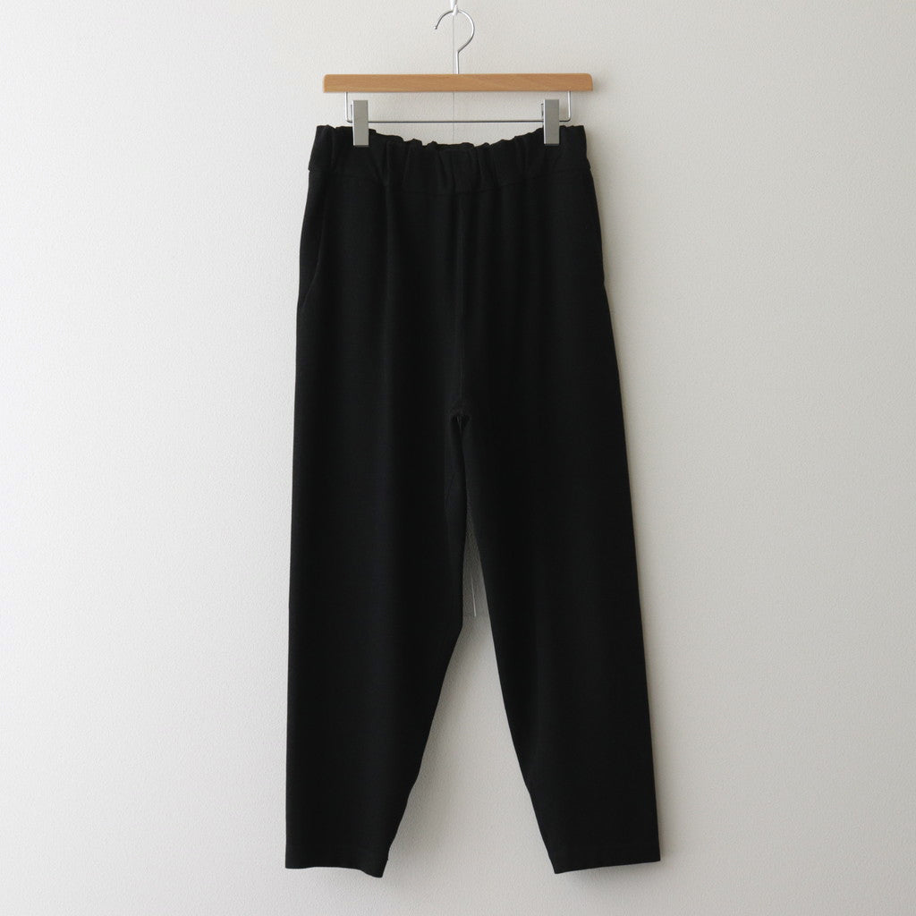 裾に掛けて強く絞りを入れたリラックスした印象のスッキリ細身のシルエット。フロントにはウエストのゴムによるギャザー、独自のパターンニングと脇ハギを無くすことで丸みのある綺麗なシルエットを表現。長すぎず短すぎずの9分丈にレングスを設定しているため、ウエストの穿く位置を調節し、シルエットのアレンジが可能。フロントにスラッシュポケット、ウエストにはドローコードでイージーパンツ仕様。ステッチをボディと同色にしてプレーンな印象に仕上げています。