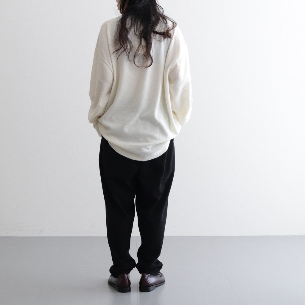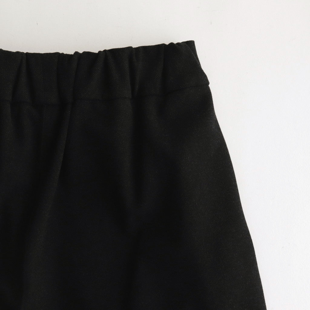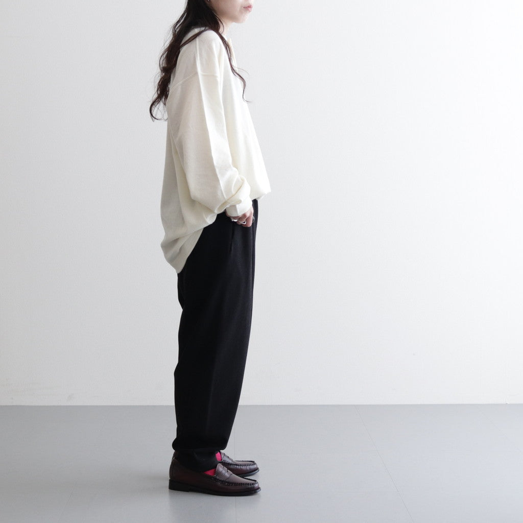 裾に掛けて強く絞りを入れたリラックスした印象のスッキリ細身のシルエット。フロントにはウエストのゴムによるギャザー、独自のパターンニングと脇ハギを無くすことで丸みのある綺麗なシルエットを表現。長すぎず短すぎずの9分丈にレングスを設定しているため、ウエストの穿く位置を調節し、シルエットのアレンジが可能。フロントにスラッシュポケット、ウエストにはドローコードでイージーパンツ仕様。ステッチをボディと同色にしてプレーンな印象に仕上げています。