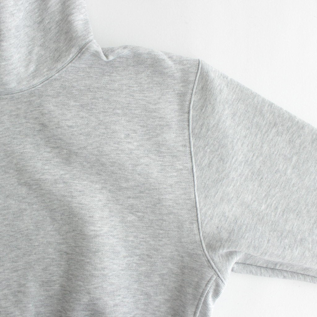 スパンポリエステルを使用した肉厚の裏起毛スウェット素材を使用。しっかりと重量感があり、コットンのような肌触りとふっくらした起毛の膨らみ感が特徴です。起毛加工を強めにかけていることによるフリースのような暖かさも嬉しい点。脇下は伸縮性のあるフライスに切り替え、着心地と強度を向上させています。