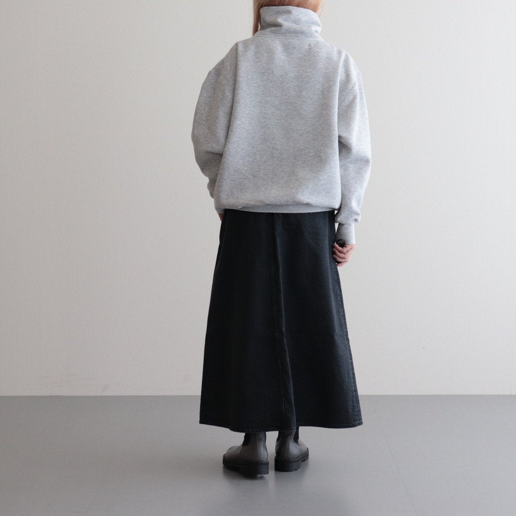 全体をゆったりとしたビッグシルエットで製作。ネックや袖口のリブは少しきつめに調整し、日常生活の邪魔にならないよう細かくフィッティングされています。首元はゆとりを持たせたタートルネック型。一枚で着用した際にもほどよく主張があり、コートのインナーなどでも活躍しそうな一着です。