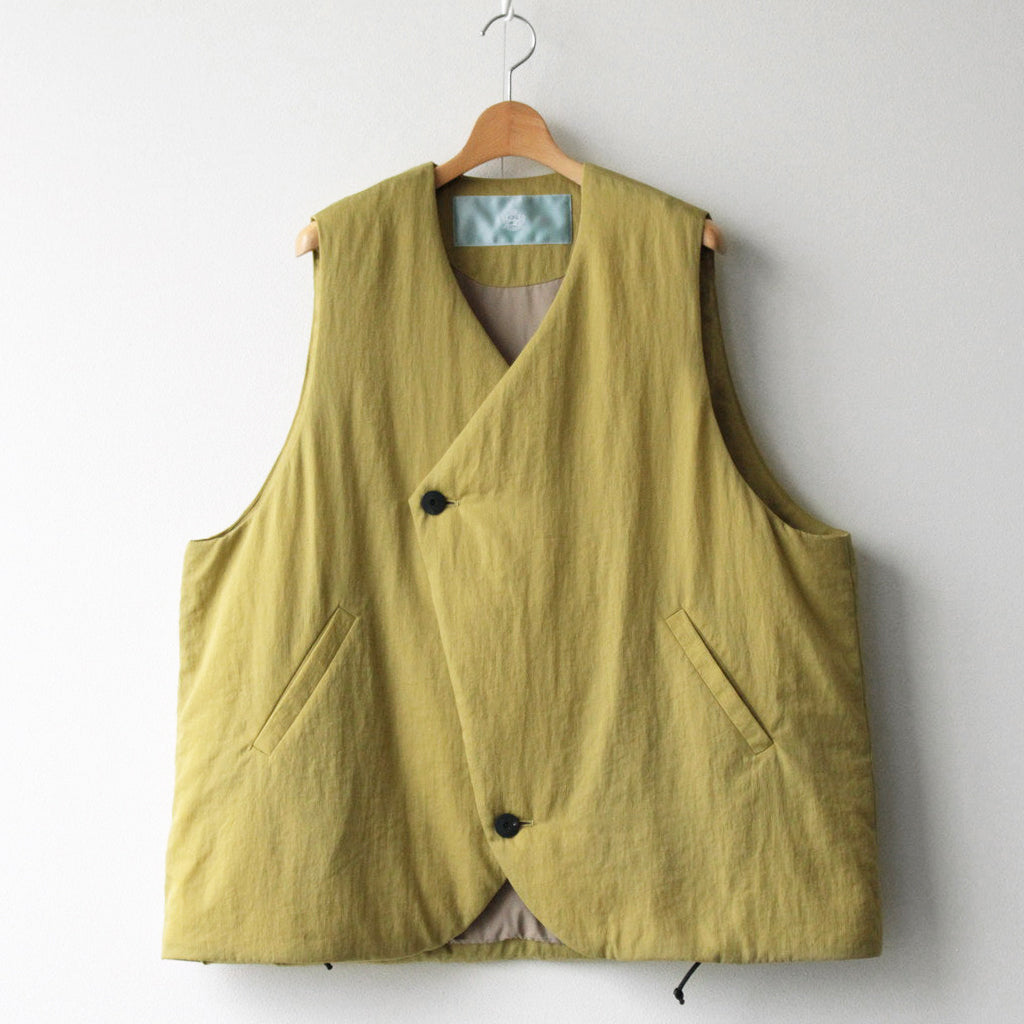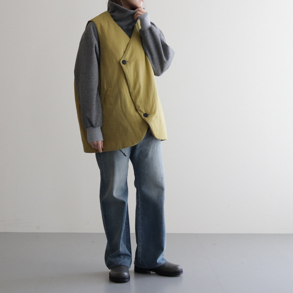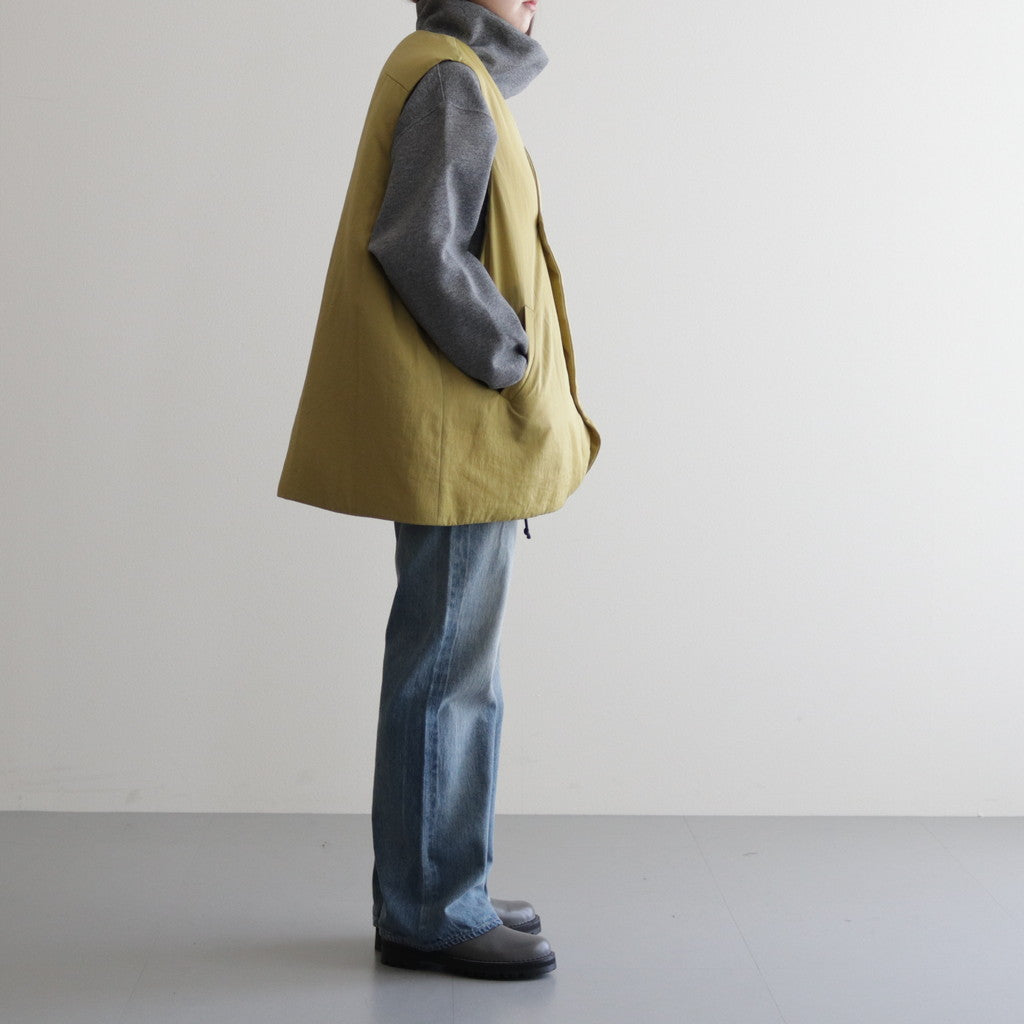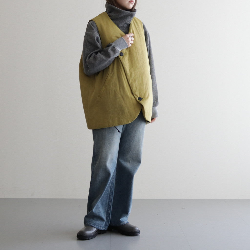 身幅をワイドにとったDulcamaraらしいシルエットの中綿入りベスト。フロントは前合わせのようなデザインとなっており、上部は横並びのボタン2つ、下部はボタン一つで留める仕様に。前身頃両サイドにアームウォーマーポケット付き。アームホールを大きめに作ることでインナーダウンとしてもアウターの上からでも着用できるような作りに。裾にはドローコードが搭載されており、絞ることで冷気をシャットアウトすることも可能です。