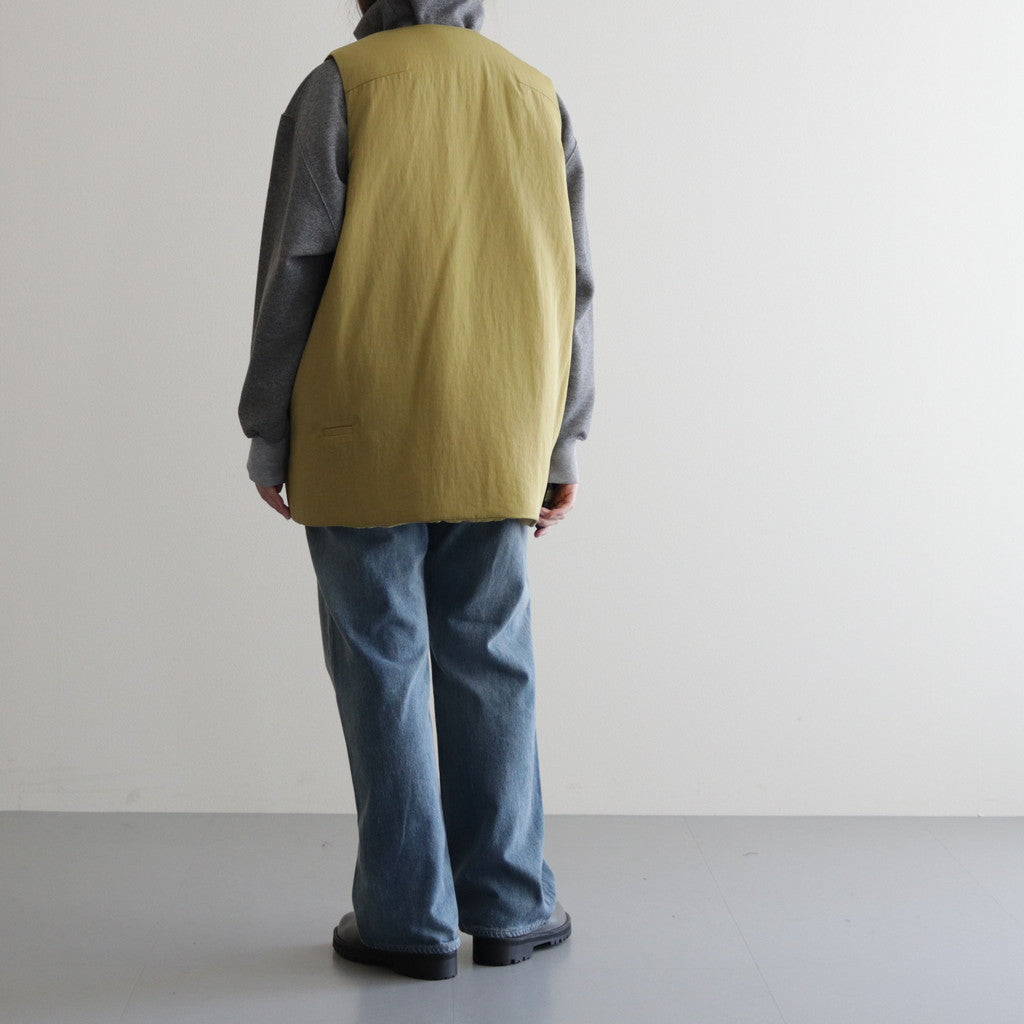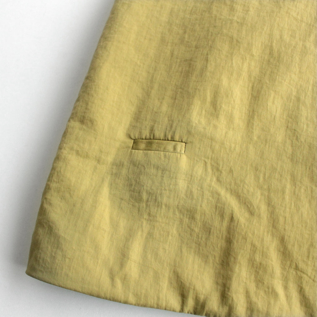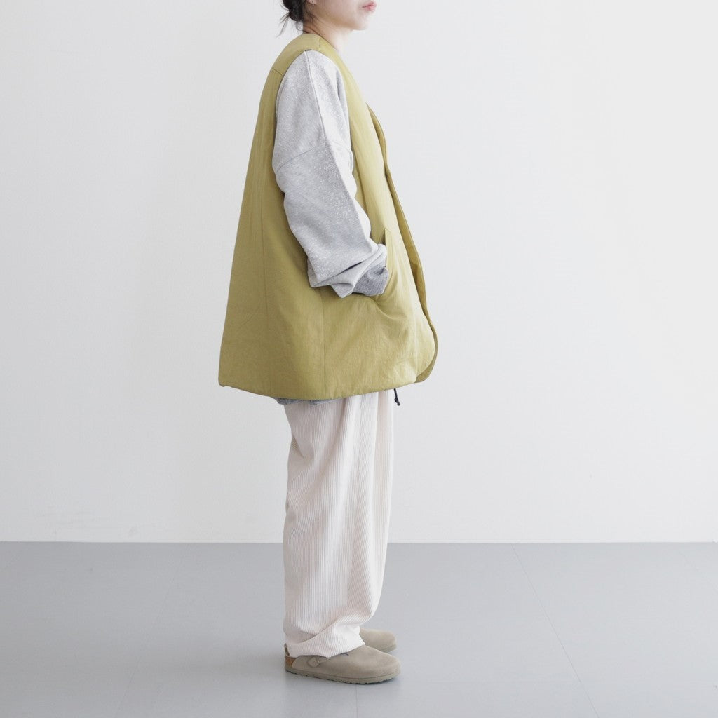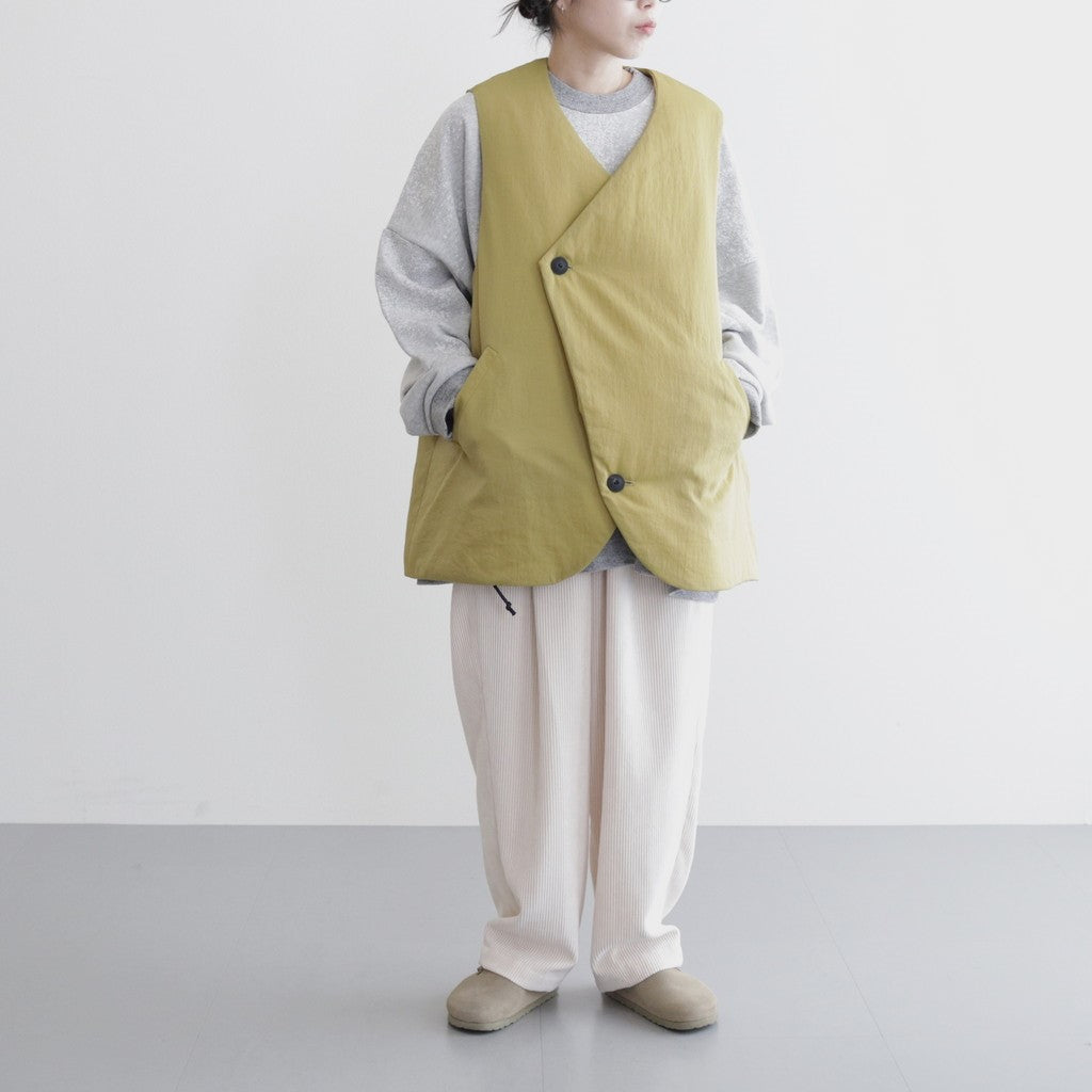 身幅をワイドにとったDulcamaraらしいシルエットの中綿入りベスト。フロントは前合わせのようなデザインとなっており、上部は横並びのボタン2つ、下部はボタン一つで留める仕様に。前身頃両サイドにアームウォーマーポケット付き。アームホールを大きめに作ることでインナーダウンとしてもアウターの上からでも着用できるような作りに。裾にはドローコードが搭載されており、絞ることで冷気をシャットアウトすることも可能です。