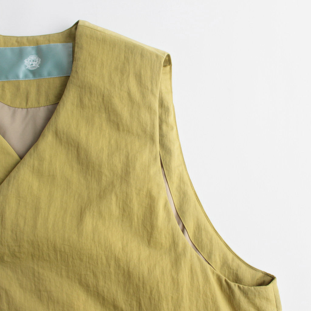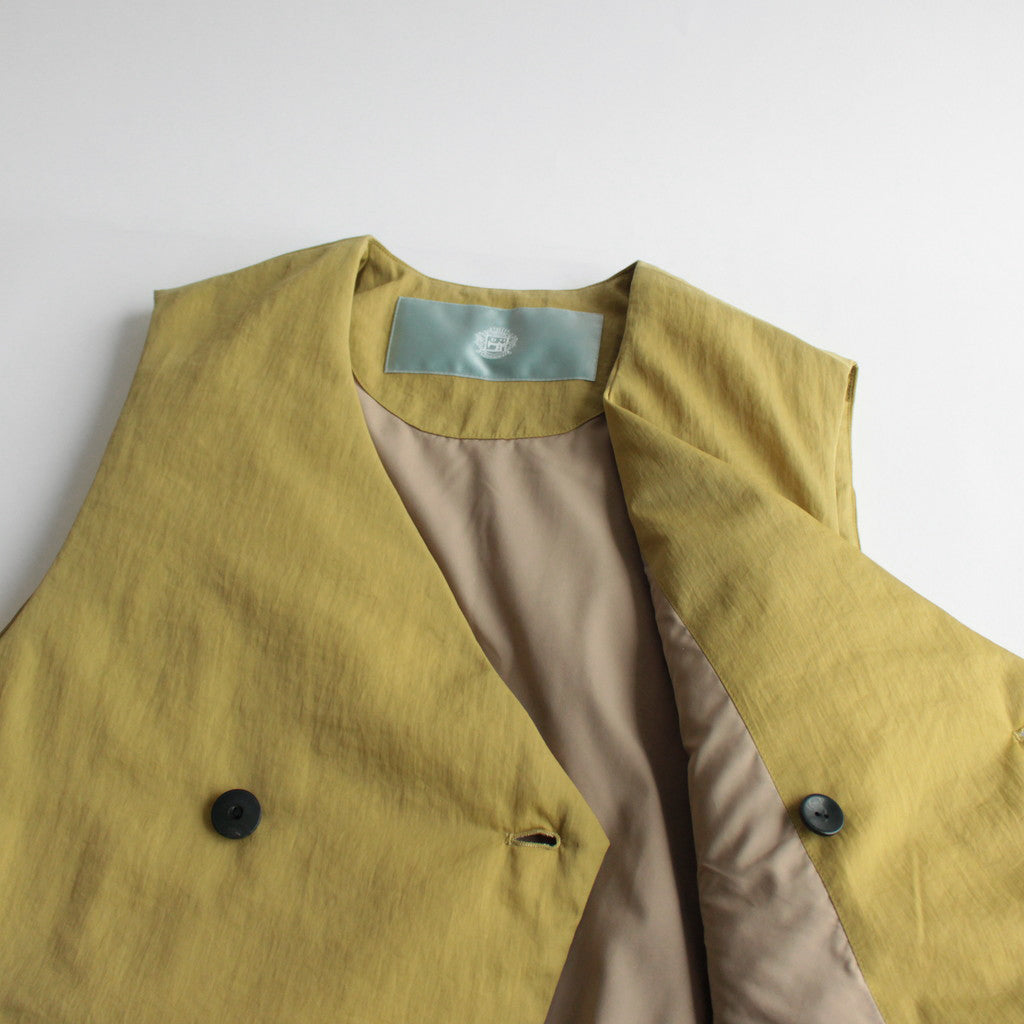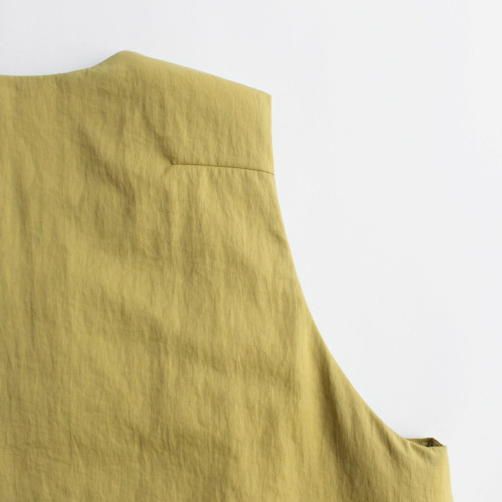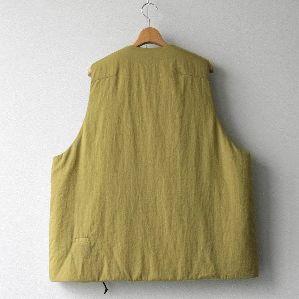 身幅をワイドにとったDulcamaraらしいシルエットの中綿入りベスト。フロントは前合わせのようなデザインとなっており、上部は横並びのボタン2つ、下部はボタン一つで留める仕様に。前身頃両サイドにアームウォーマーポケット付き。アームホールを大きめに作ることでインナーダウンとしてもアウターの上からでも着用できるような作りに。裾にはドローコードが搭載されており、絞ることで冷気をシャットアウトすることも可能です。