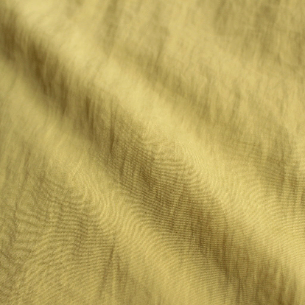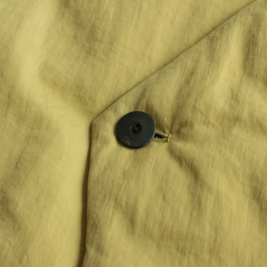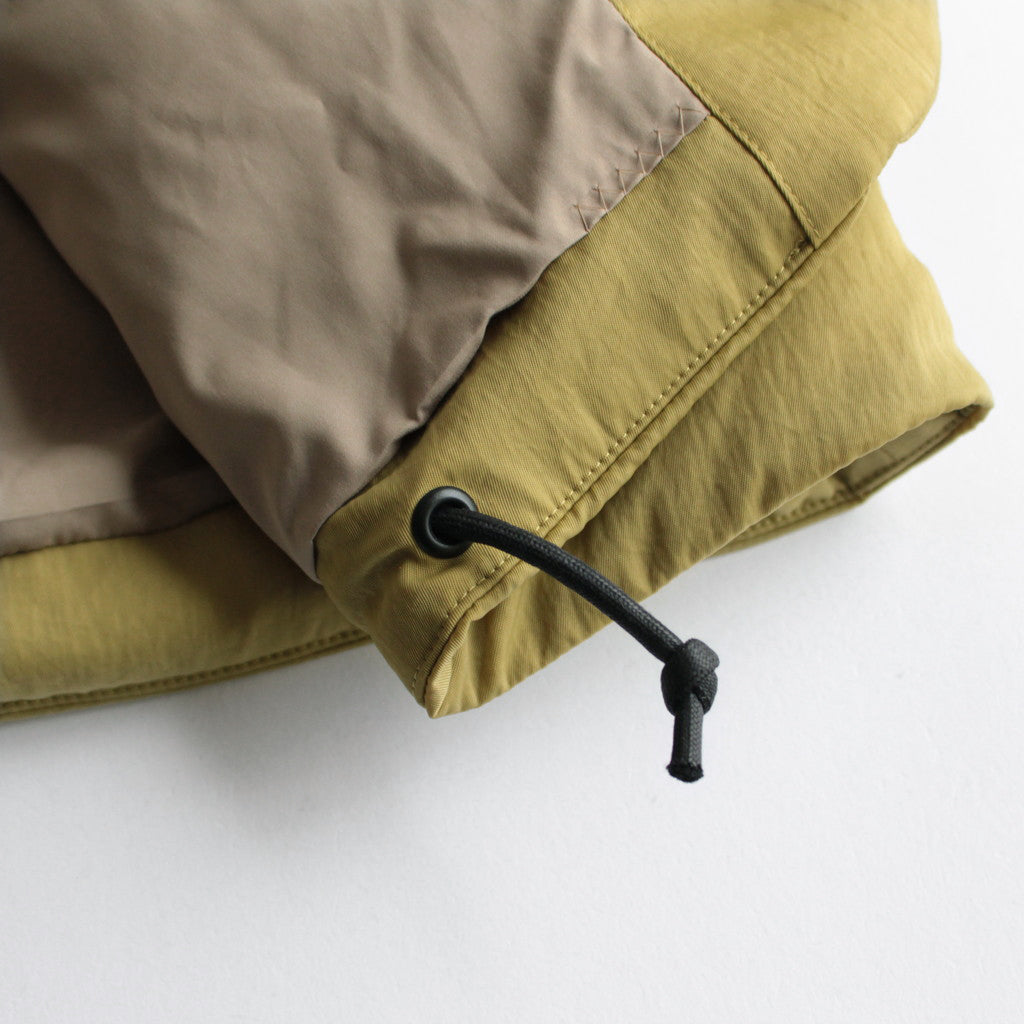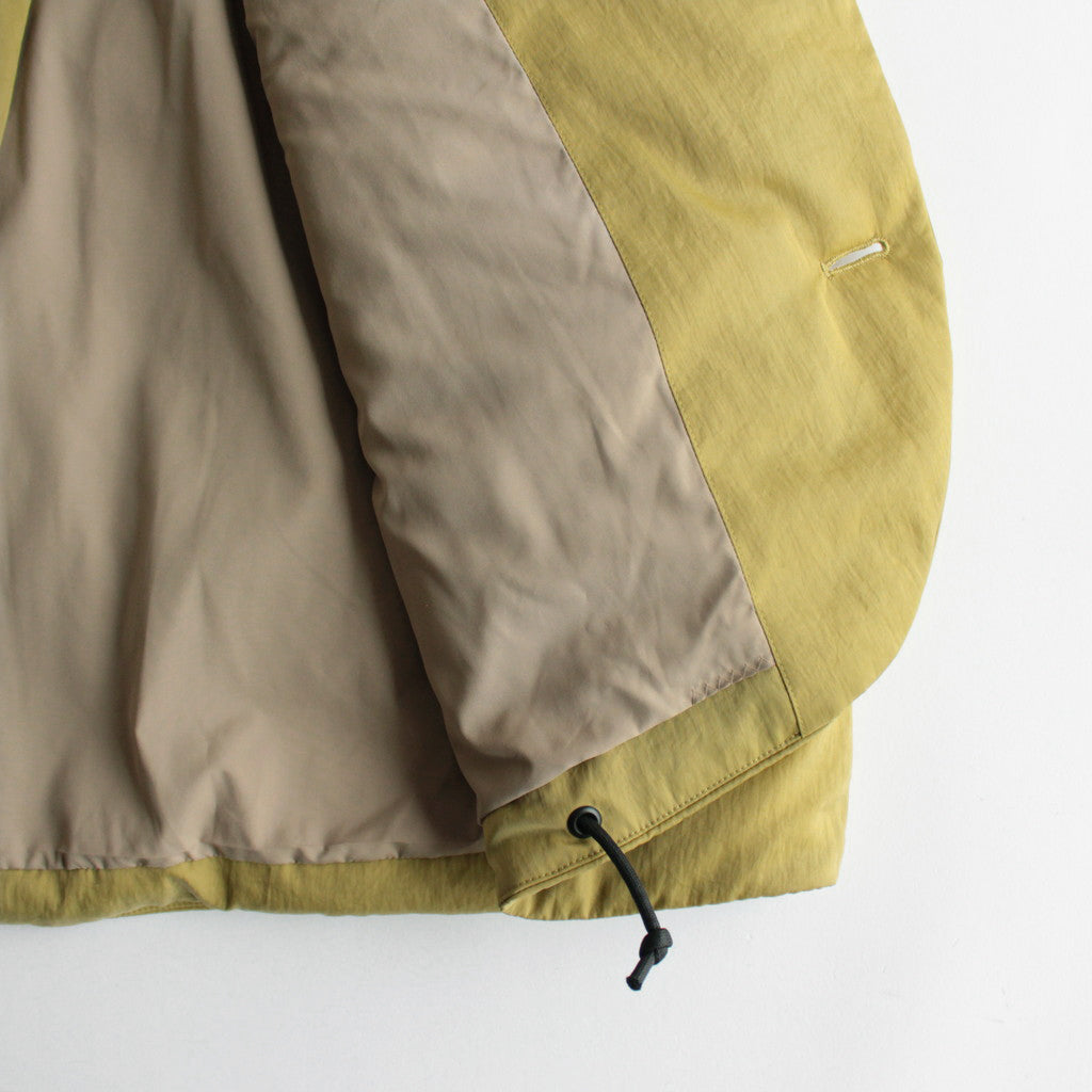 全体に洗いをかけることによってムラとシワ感を出した風合いのあるナイロン素材を使用。撥水加工がかけられているため雨や汚れにも強い仕様となっています。中綿に適度な保温性と軽量感を持ち合わせたポリエステル素材を封入。裏地は滑りの良い平滑な質感のポリエステルファブリックを採用しています。