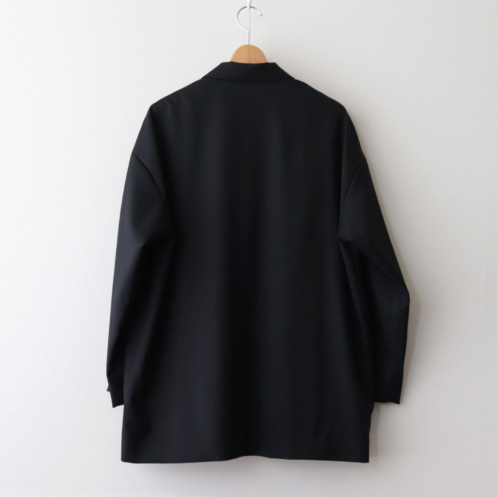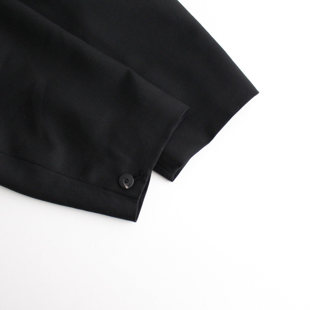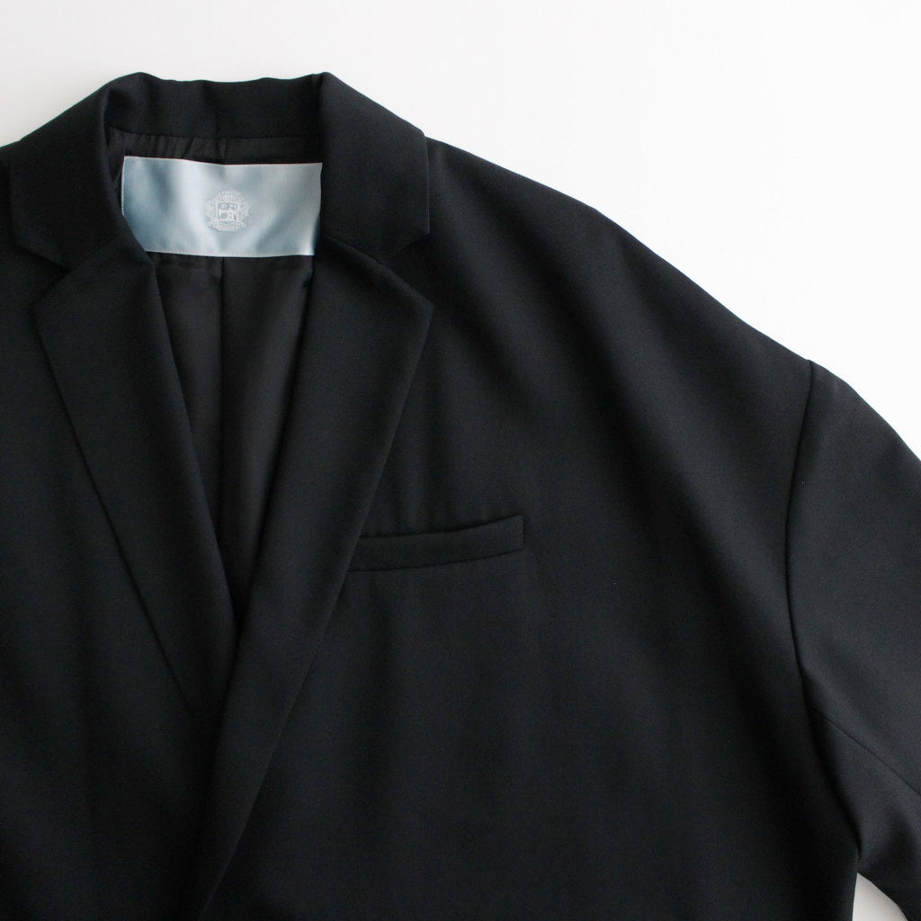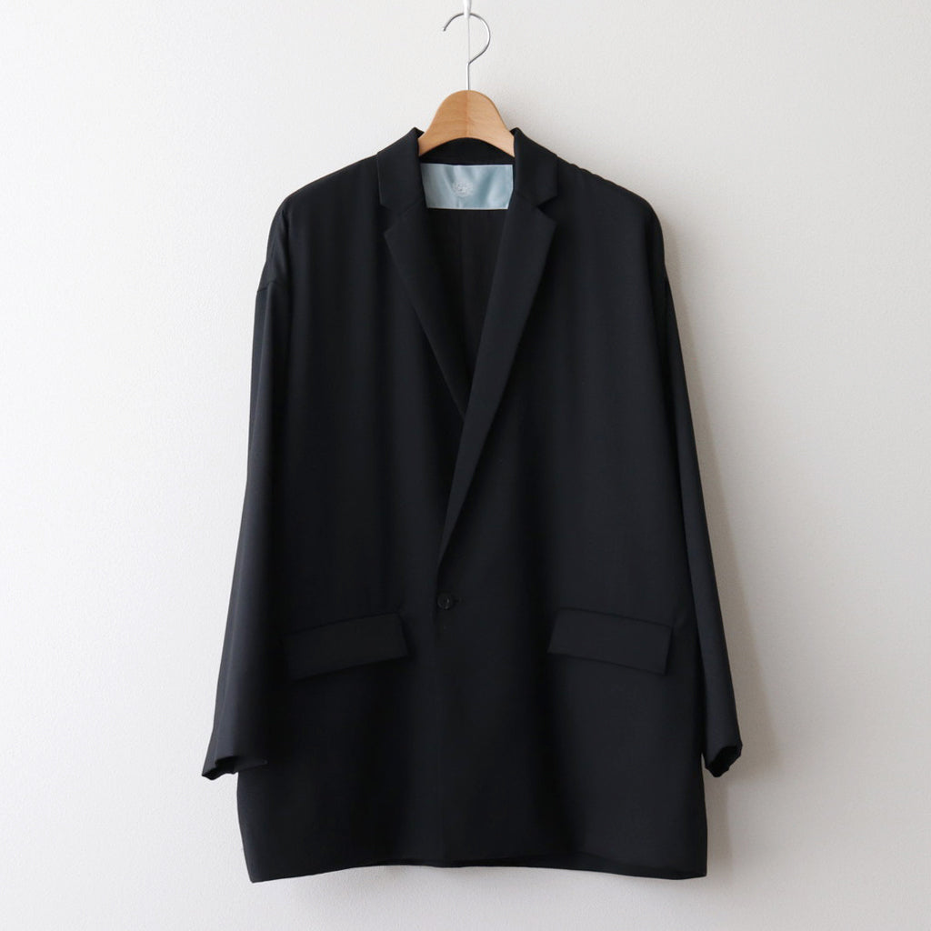 ゆったりとしたオーバーシルエットで製作されたダブルブレストジャケット。身幅を広くとったワイドシルエット。フロントはボタンが1つだけ見えるようにデザインされています。身頃両サイドの低い位置にフラップ付きのポケットを配置。ゆるさもありながら美しさも感じることのできるブランドらしいシルエットの一着。