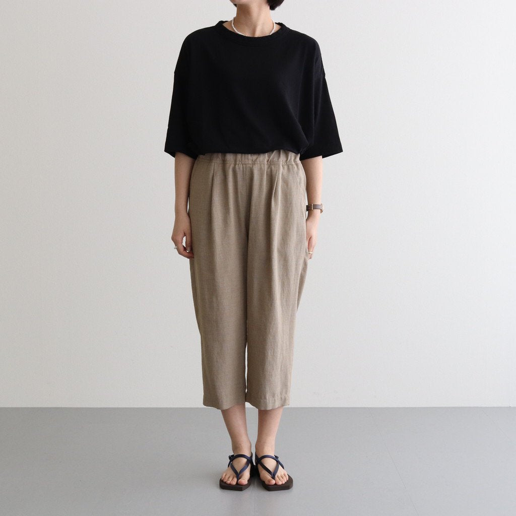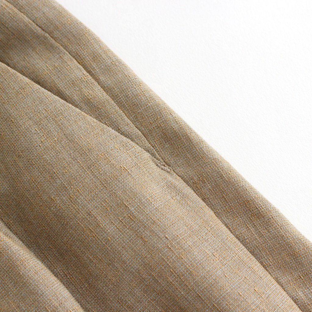 「メランジマルチリネン・平織」テキスタイルを使った8分丈イージーパンツ。4つの素材をミックスし染着差や染料差で深いメランジ調に染めた平織生地。スラブ感やネップ感がありいろんな色がミックスされた少し古臭くヴィンテージ感を持った風合いです。素材としてはポリエステルやトリアセテートが原料の大半を占めるため 軽く薄い生地でありながらも皺にもなりにくく安定感があり着やすい生地です。仕上げに製品洗いとタンブラー乾燥させることで、膨らみと風合いを出しています。ウエストはゴムとドローコードで微調整が可能なイージーパンツデザイン。腰の位置にハンドポケット付き、バックはフラップポケットを配置しています。股上をたっぷりと深めにとることで腰周りにゆとりを持たせ、裾に掛けて緩やかに絞りを入れたリラックスした印象のワイドストレートシルエットです。フロントにアウトタックを入れ、独自のパターンニングにすることで丸みのある綺麗なシルエットを表現しています。