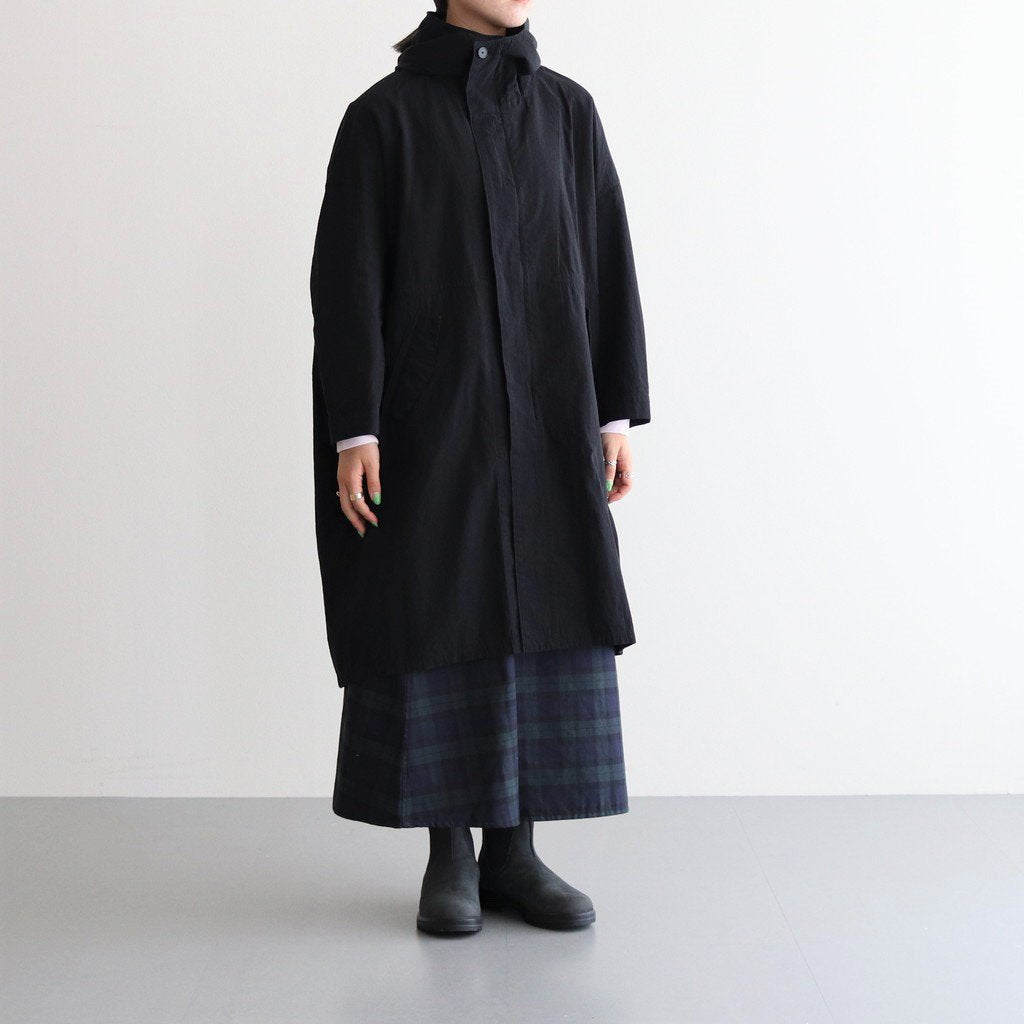 「40/1オーガニックコットン・強撚ウェザー」テキスタイルを使ったオーバーサイズのモッズコート。素材には強撚したオーガニックコットン100%の40番単糸を使用した平織のやや甘めのウェザーを使用。整理加工をせずに生機の状態から直接水洗いとタンブラー乾燥させることで、荒い質感と皺感を強めに出しています。強撚糸特有のドライなタッチでありながら、やや柔らかな風合いが特徴です。この生地の特徴として、生折れ皺や雷皺といったアイロンをかけても取れない強い皺やアタリが生地全体に現れます。肩周りや身幅、袖幅に大きくゆとりを持たせたゆったりとしたオーバーサイズのビッグシルエット。ウエストに配したドローコードを絞る事でシルエットをアレンジ可能。ゆったりとしていながらも野暮ったさの無い、FIRMUMならではのシルエットに仕上がっています。袖付けはセットインスリーブながらも袖山を低くする事で肩から袖にかけて自然に流れるような滑らかなシルエットが印象的。フロントは比翼仕立て、ジップで開閉する仕様です。背面の裾にはフィッシュテールのデザイン。腰の位置にフラップ付きのパッチポケットとハンドポケットを配置。質の良さとシンプルなデザイン、シルエットの良さで長く愛用して頂ける一着です。
