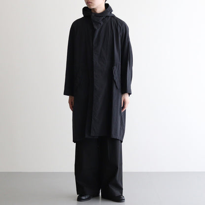 肩周りや身幅、袖幅に大きくゆとりを持たせたゆったりとしたオーバーサイズのビッグシルエット。ウエストに配したドローコードを絞る事でシルエットをアレンジ可能。ゆったりとしていながらも野暮ったさの無い、FIRMUMならではのシルエットに仕上がっています。袖付けはセットインスリーブながらも袖山を低くする事で肩から袖にかけて自然に流れるような滑らかなシルエットが印象的。フロントは比翼仕立て、ジップで開閉する仕様です。背面の裾にはフィッシュテールのデザイン。腰の位置にフラップ付きのパッチポケットとハンドポケットを配置。
