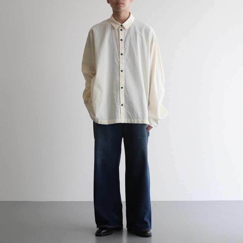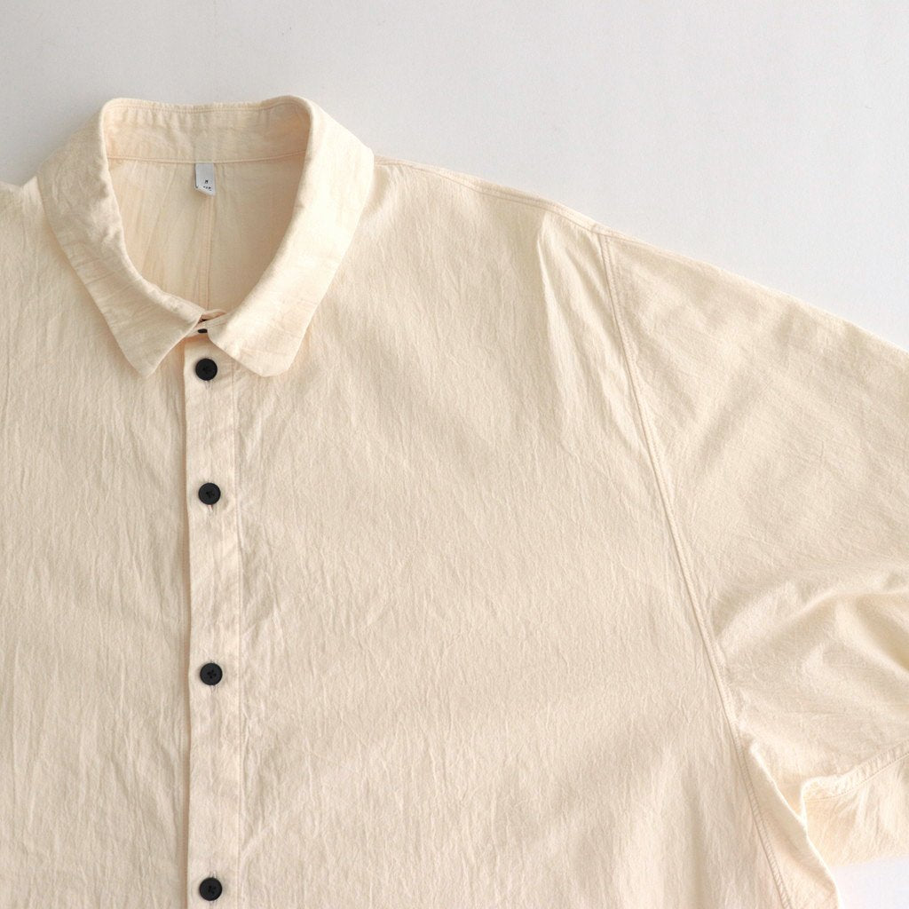 体を覆うようなビッグシルエットで製作されたレギュラーカラーシャツ。ネックは台襟付きのレギュラーカラー仕様。ボリュームのある袖はラグランとピボットスリーブを合体させたような形となっており、腕の可動に合わせた立体成型に。裾の両サイドにはスリットが入り着丈に前後差をつけたデザインとなっています。
