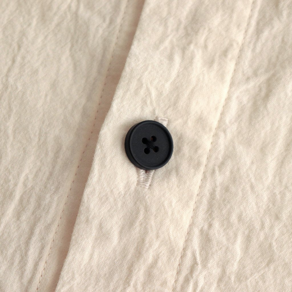 強撚したオーガニックコットン100%の40番単糸を使用したウェザークロスを使用。生機の状態から直接水でもみ洗いを行い、タンブラー乾燥をすることで粗い質感と皺感を強く出した仕上がりに。強撚糸特有のドライなタッチでありながら、やや柔らかな風合いが特徴です。