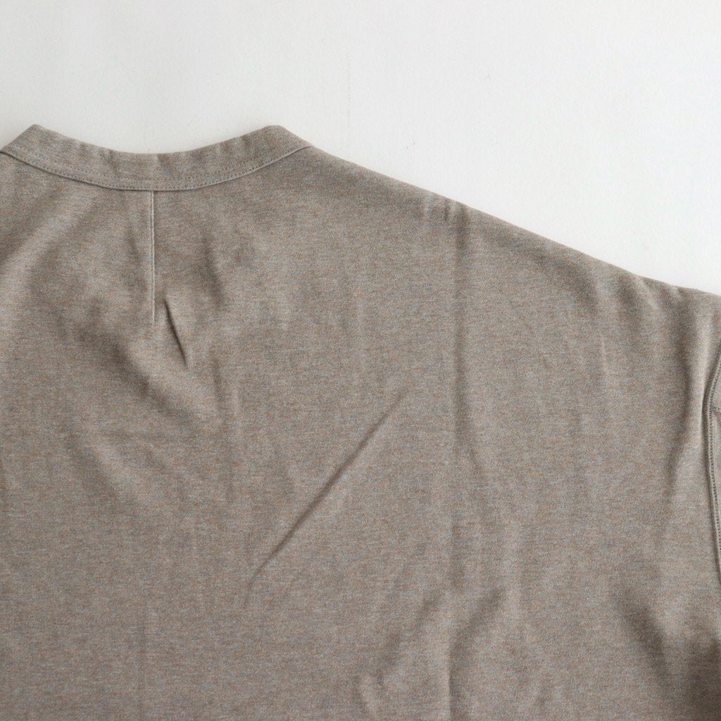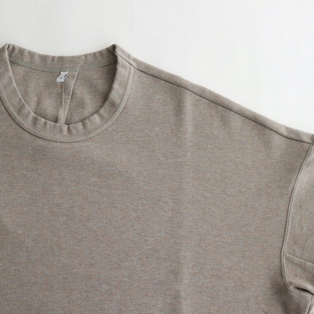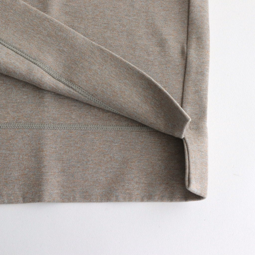 肩幅、身幅にゆとりを持たせたリラックス感のあるシルエットで製作。ネックはバインダー処理が施されたクルーネック仕様となっています。アーム部分は二枚袖で製作しており腕の可動域に合わせた設計に。裾の両サイドにはスリットが入り、着丈に前後差をつけることで体を覆うような設計としています。