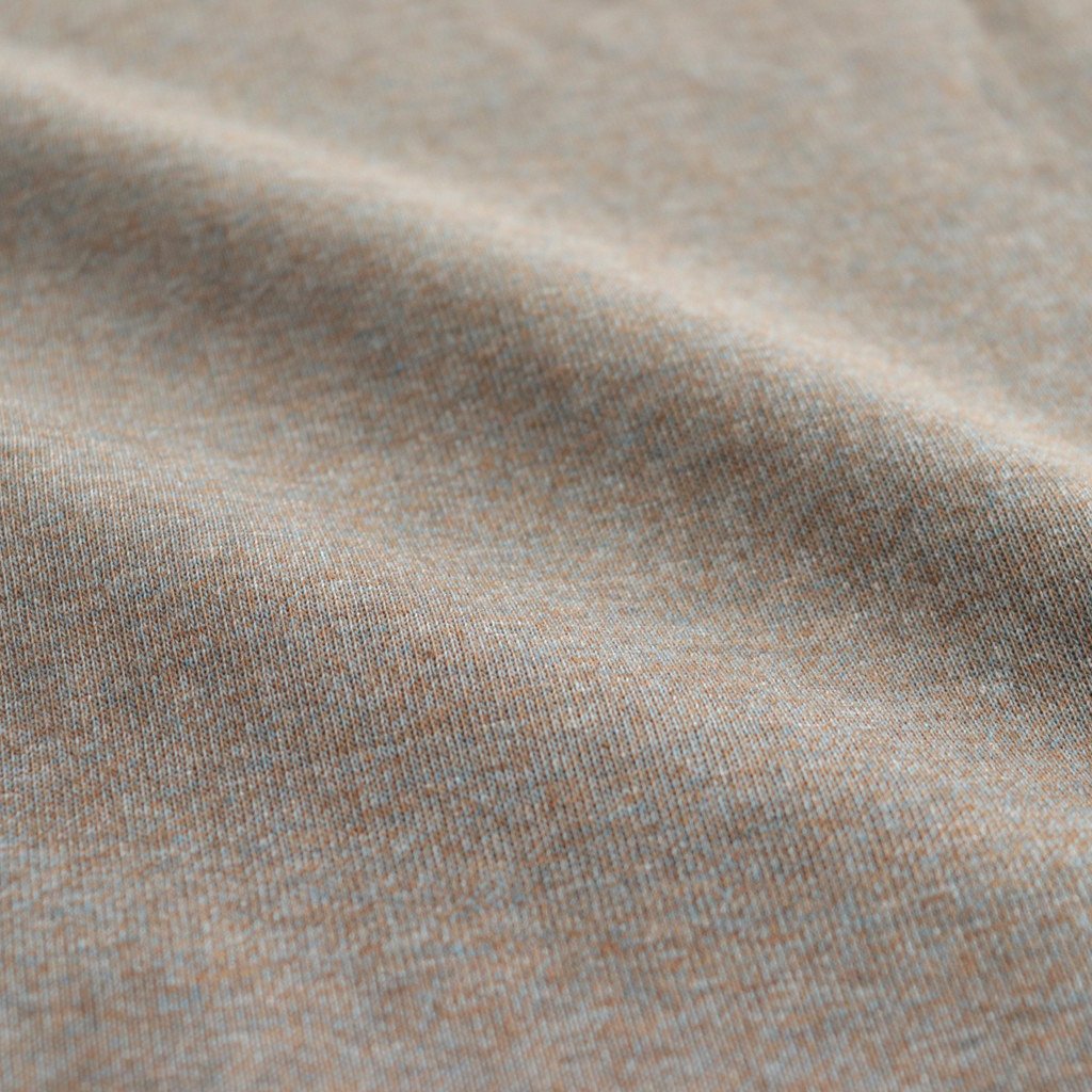 20番のコットン糸で表裏を編み、細いポリエステル糸でつないだ二重編みのニットです。見た目は裏毛のようですが、しっかりとした張り感があり、カットソーでありながらしっかりと形が出る素材です。最後にバイオ加工を施すことで生地表面の毛羽を除去し平滑な風合いに。