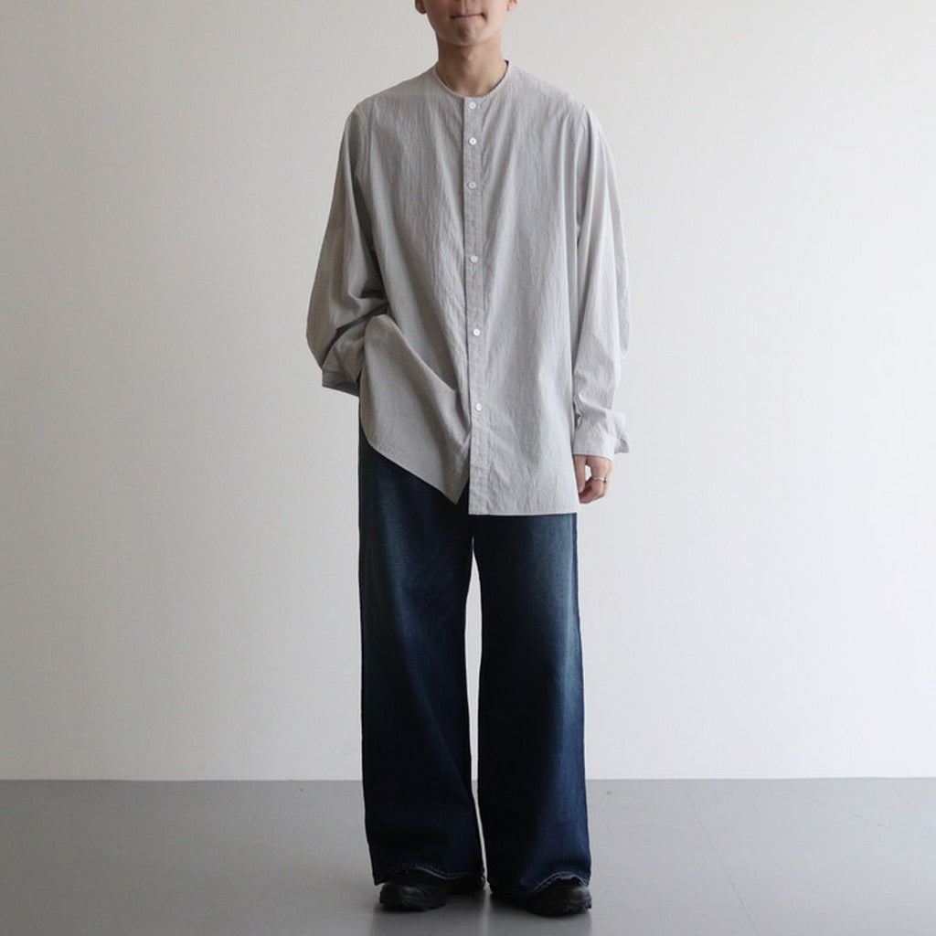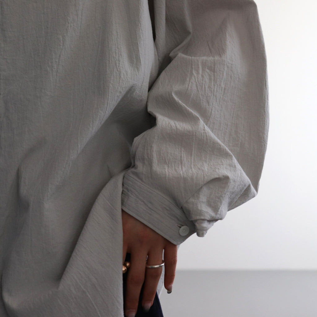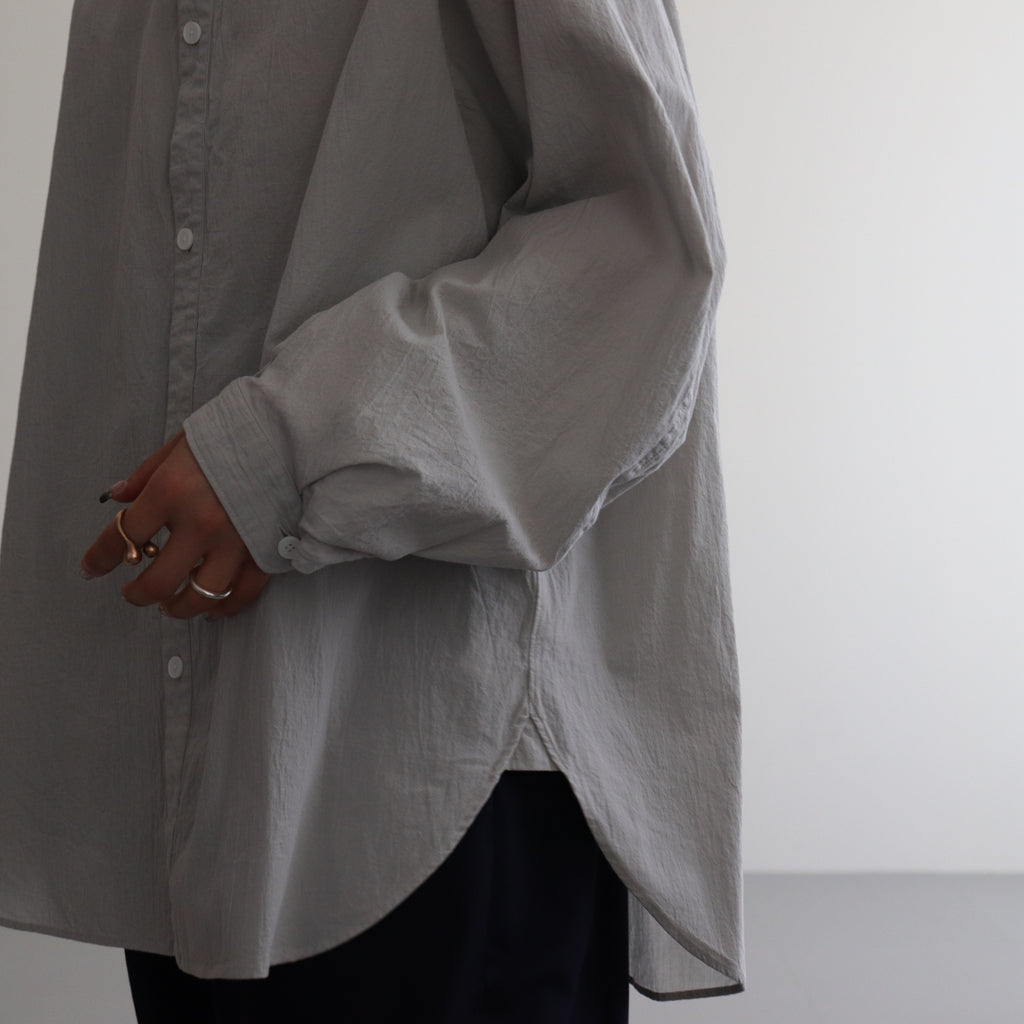 立体的な曲線デザインのノーカラーシャツ。袖をラグランとピボットスリーブを合体させた独特の袖付けで設計し立体的なカーブを描くパターンに。肩や身幅にはほどよくゆとりを持たせたシルエットに。脇下にガゼット付きのスリットを入れ、裾は着丈に前後差をつけたラウンドカットで仕上げています。