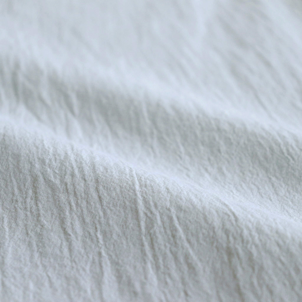 強撚したオーガニックコットン100%の40番単糸を使用。やや甘めに織り上げたウェザークロスです。生機の状態から直接水でもみ洗いし、タンブラー乾燥をすることで粗い質感と皺感を強く出した仕上げにしています。強撚糸特有のドライなタッチでありながら、柔らかみも感じることのできる風合いが特徴です。