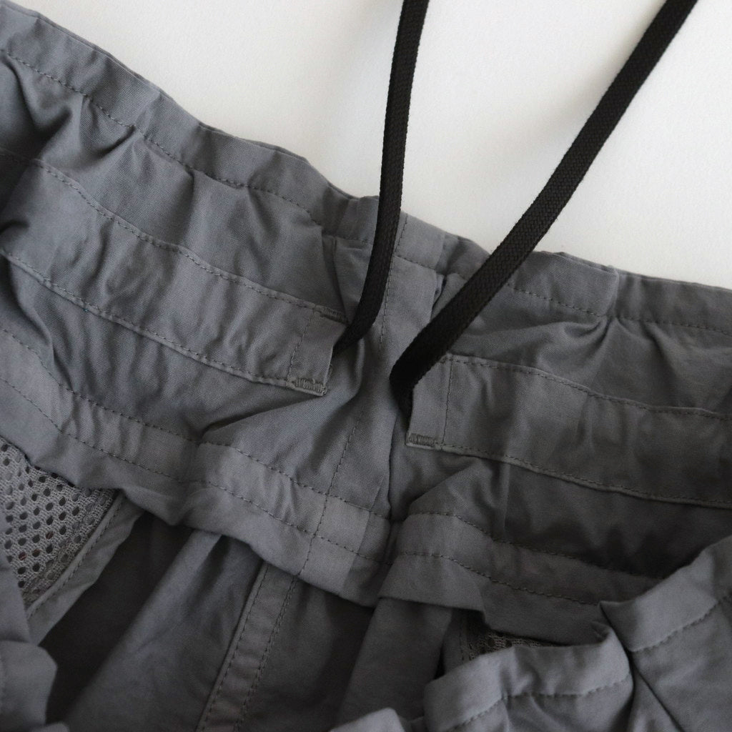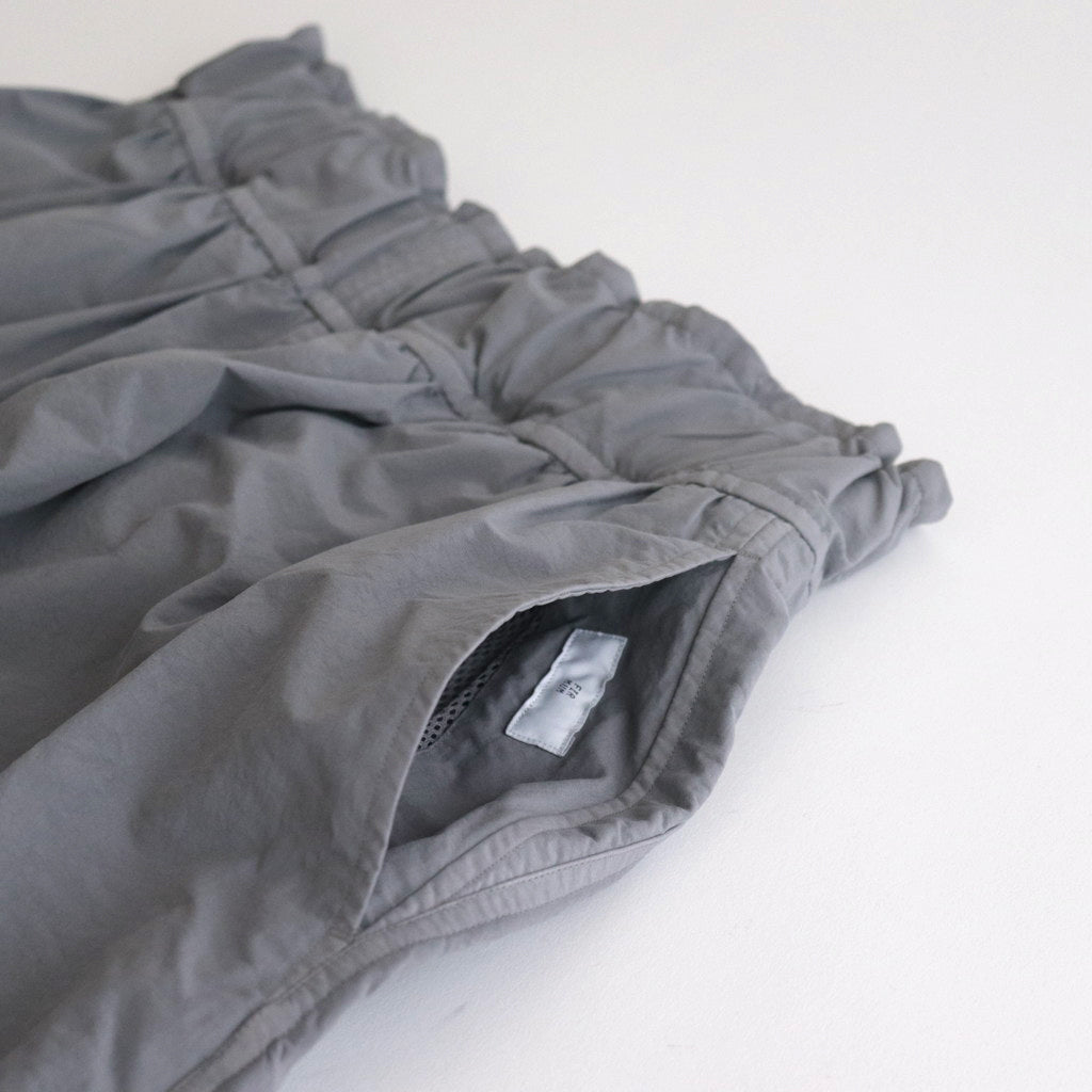 膝周りにタックを作り、全体にボリュームを持たせたオーバーパンツ。ウエストは幅広く対応可能なイージーパンツ仕様でゴムとドローコードで細かく調整が可能。両サイドにさりげなくシームポケットを設計。バック右側にもフラップ付きのポケット付き。裾もゴムのコードが配されておりお好みで絞ってシルエットの調整が可能。