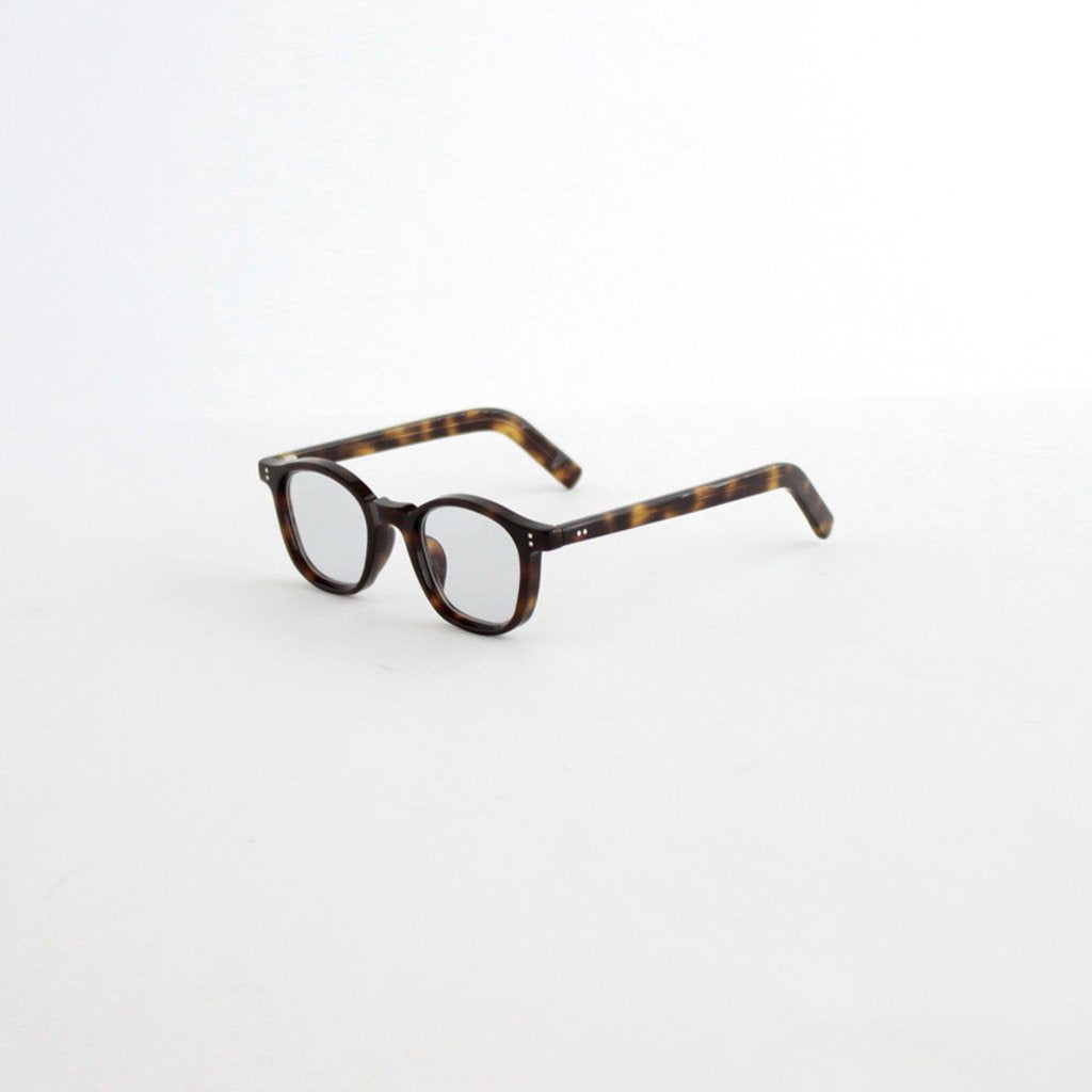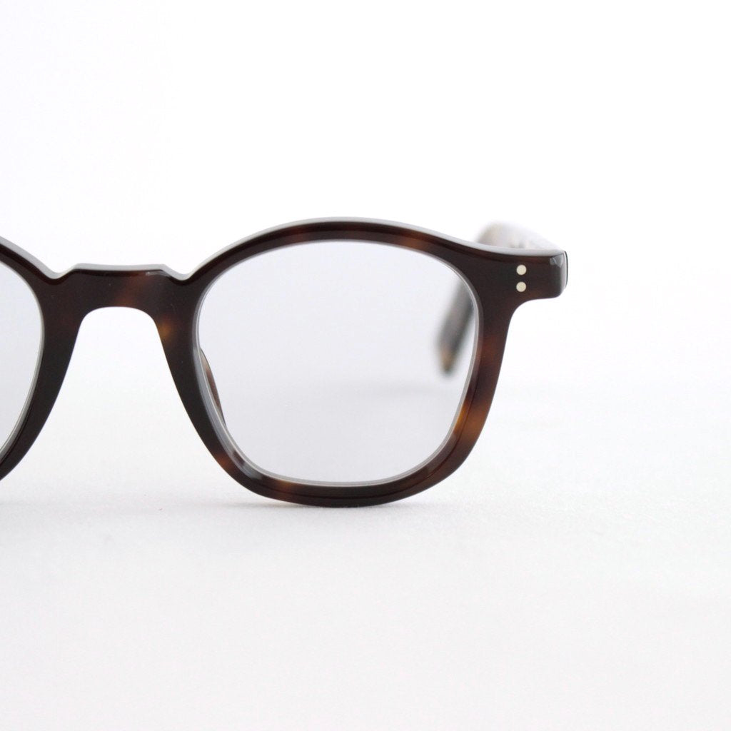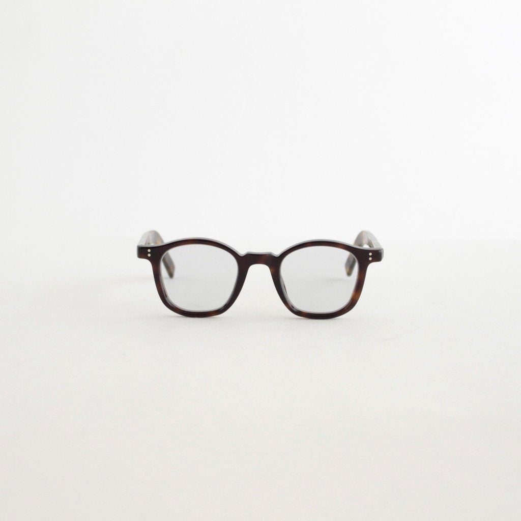 現代においても世界最高品質と称される1940年代から50年代のフレンチヴィンテージフレームをベースに、サイズ感などを現代風に微調整して展開するアイウェアブランド、guepard.のGP-01。クラシックな印象の強いヴィンテージグラスの中でも、様々な顔形の方に愛用頂きやすいエントリーモデル的な位置づけの一本となります。guepardではマテリアルに比較的お手頃にご愛用いただけるアセテート素材を使用しており、現代的に微調整したデザインと相まってヴィンテージフレームのエントリーに最適な設定となっています。レンズはスクエア型のウェリントンタイプで、一般的なものより若干レンズ幅を小さくすることによってフレンチヴィンテージらしいクラシカルな雰囲気を残したシルエットとなっています。レンズはデモレンズではなく初期の状態からguepardが特別に製作したフラットレンズを装着しているためそのまま伊達メガネとしての使用が可能。レンズは裏面にだけマルチコーティングを施すことによって、レンズ表面はコーティング技術が無い時代の光沢感が残った雰囲気を再現した仕様となっています。