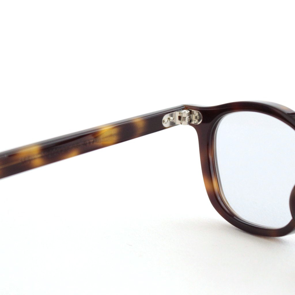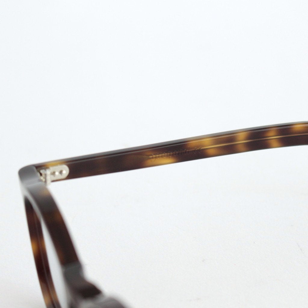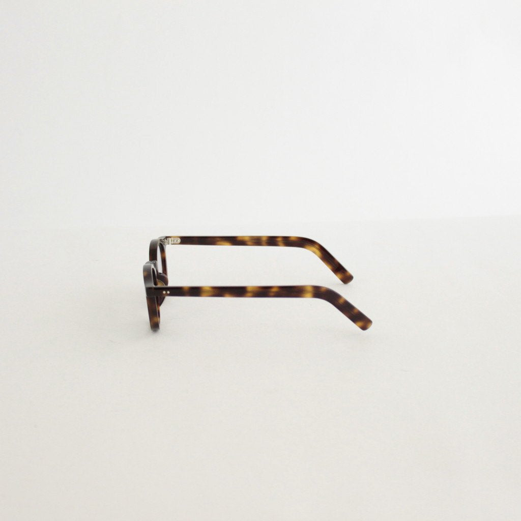 現代においても世界最高品質と称される1940年代から50年代のフレンチヴィンテージフレームをベースに、サイズ感などを現代風に微調整して展開するアイウェアブランド、guepard.のGP-01。クラシックな印象の強いヴィンテージグラスの中でも、様々な顔形の方に愛用頂きやすいエントリーモデル的な位置づけの一本となります。guepardではマテリアルに比較的お手頃にご愛用いただけるアセテート素材を使用しており、現代的に微調整したデザインと相まってヴィンテージフレームのエントリーに最適な設定となっています。レンズはスクエア型のウェリントンタイプで、一般的なものより若干レンズ幅を小さくすることによってフレンチヴィンテージらしいクラシカルな雰囲気を残したシルエットとなっています。レンズはデモレンズではなく初期の状態からguepardが特別に製作したフラットレンズを装着しているためそのまま伊達メガネとしての使用が可能。レンズは裏面にだけマルチコーティングを施すことによって、レンズ表面はコーティング技術が無い時代の光沢感が残った雰囲気を再現した仕様となっています。