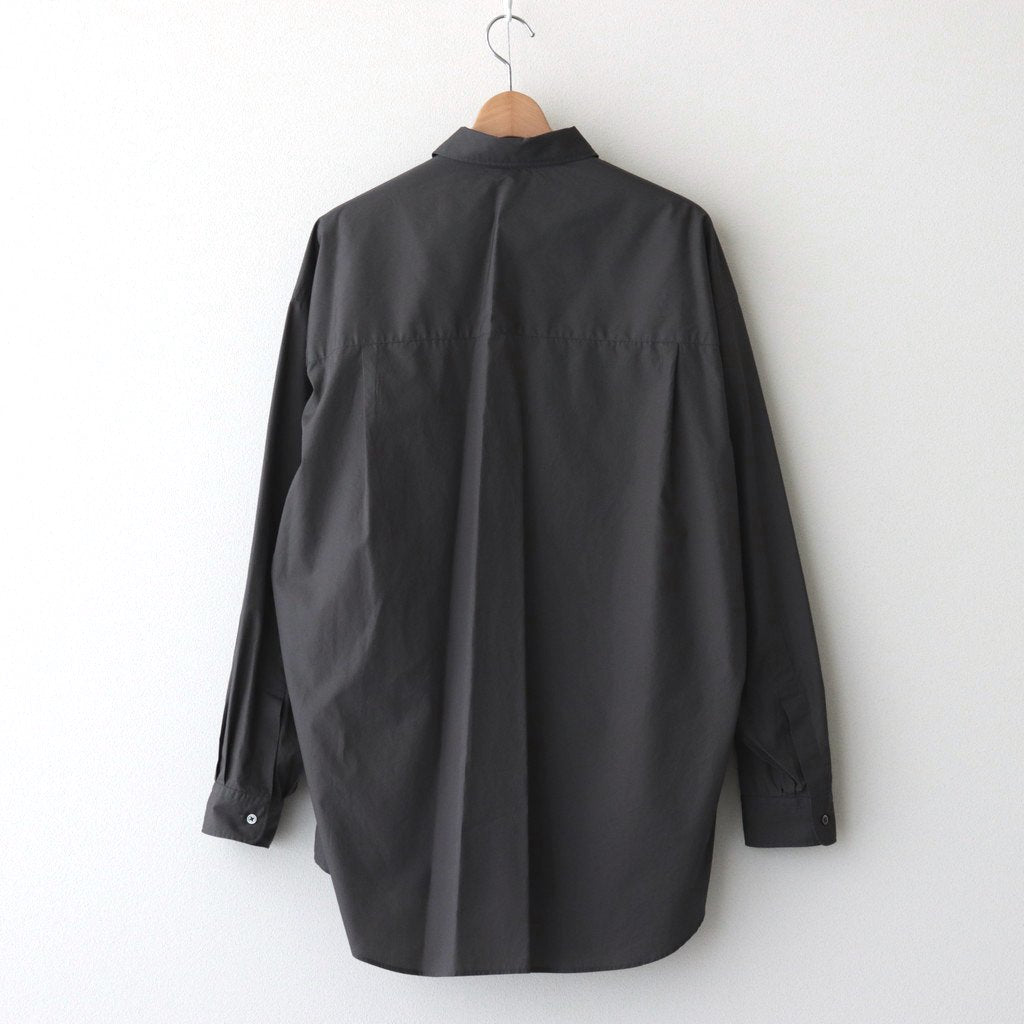 身幅と肩幅を広くとり、肩を落として着るオーバーサイズのボックスシルエット。ゆとりを持たせた心地の良い着用感と、自然で綺麗なラインが特徴の一着です。衿はレギュラーカラー仕様。袖口はシングルカフス、袖先にタックを入れることで丸みを持たせ納まりの良いシルエットに。バックヨークの左右にタックを入れ、肩周りにゆとりを持たせることで動き易さを考慮した作り。各部分のボタンにはシェルボタンを採用、左胸にポケット付き。