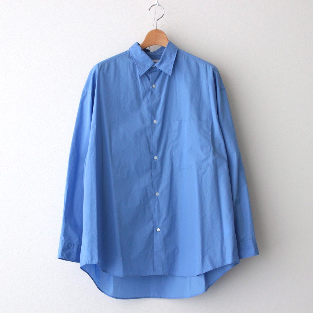 身幅と肩幅を広くとり、肩を落として着るオーバーサイズのボックスシルエット。ゆとりを持たせた心地の良い着用感と、自然で綺麗なラインが特徴の一着です。衿はレギュラーカラー仕様。袖口はシングルカフス、袖先にタックを入れることで丸みを持たせ納まりの良いシルエットに。バックヨークの左右にタックを入れ、肩周りにゆとりを持たせることで動き易さを考慮した作り。各部分のボタンにはシェルボタンを採用、左胸にポケット付き。