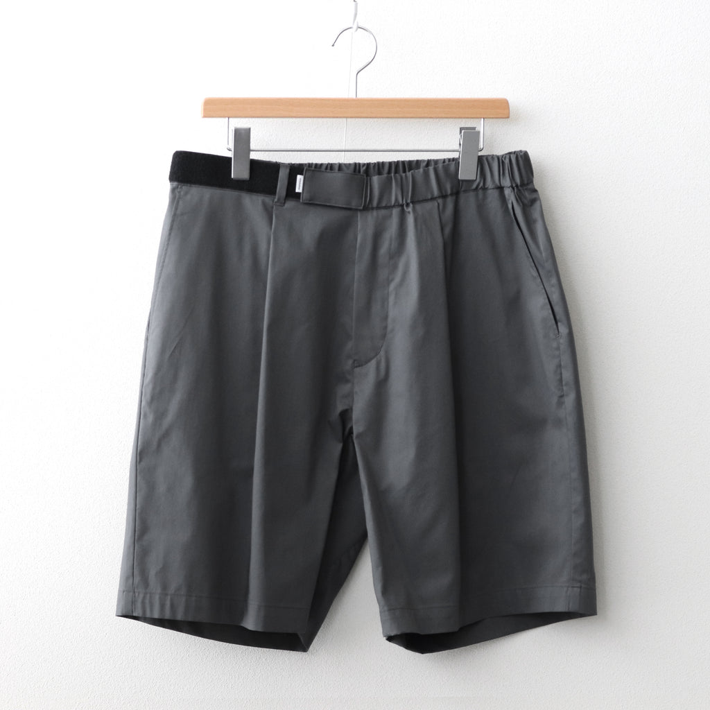 フランスの料理人が着用している通称「シェフパンツ」から着想を得てデザインされたワイドショーツ。ウエストやヒップ部分にゆとりを持たせ、裾に向かってボリュームを持たせたワイドシルエット。ウエストはアジャスターを使用することで自由にフィッティングを変えられる為、どんな体型の方でも綺麗にフィットします。4ポケット仕様。フロントはジッパーフライ。