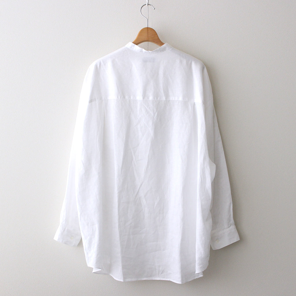 身幅と肩幅を広くとったオーバーサイズのボックスシルエット。バンドカラー仕様で袖口はシングルカフス、袖先にタックを入れ納まりの綺麗なシルエットに。バックヨークの左右にタックを入れ、肩周りにゆとりを持たせた動き易い作り。各部分のボタンにはシェルボタンを採用。左胸にポケット付き。