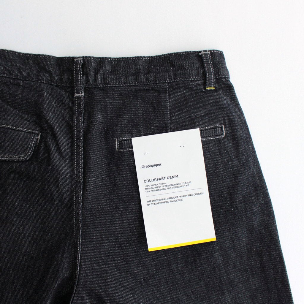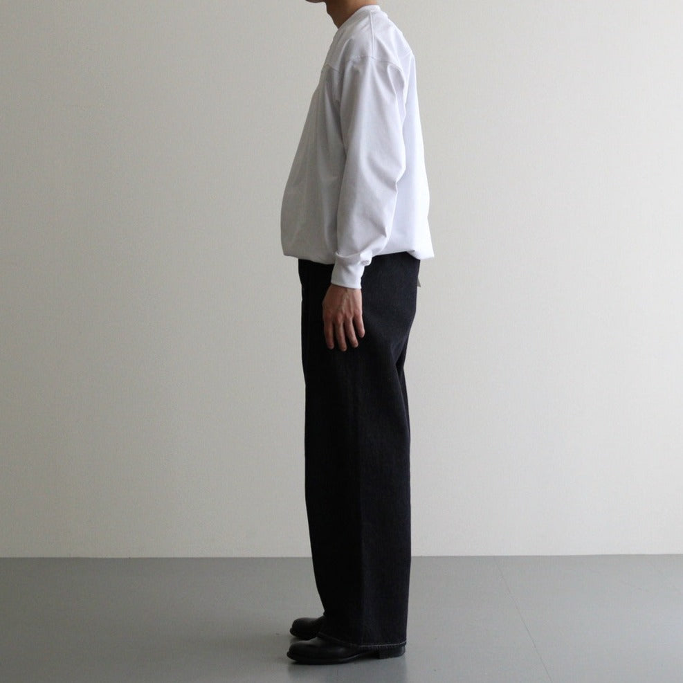 スラックスと5ポケットデニムをミックスした仕様の2タックパンツ。ヒップや太腿周りに大きくゆとりを持たせ、裾に向かってテーパードを強調させる事ですっきりとした収まりの良いラインに仕上げています。ボリューム感のあるシルエットですが、とても上品でモダンな印象を持つ綺麗なシルエット。フロントはジッパーフライ仕様。腰の位置に実用性に優れたスラッシュポケット、バックに片玉縁ポケットを配置。