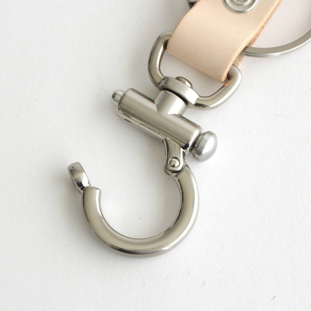 Hender Schemeのキーフロック。ミニマルな佇まいのプロダクトで、引っ張ることで開くリングとフック付きのキーリングに鍵を何層も付けられる仕様。厚手で上質なカウレザーを使用しており、コバなども綺麗に磨いて処理されています。レザー部分はドットボタンで留めるデザイン、ベルトループに通したり、手持ちやバッグに取り付けられます。Hender Schemeの型押し入り。お手持ちのカギやキーホルダーと組み合わせて自分だけのアイテムにアレンジしてみて下さい。
