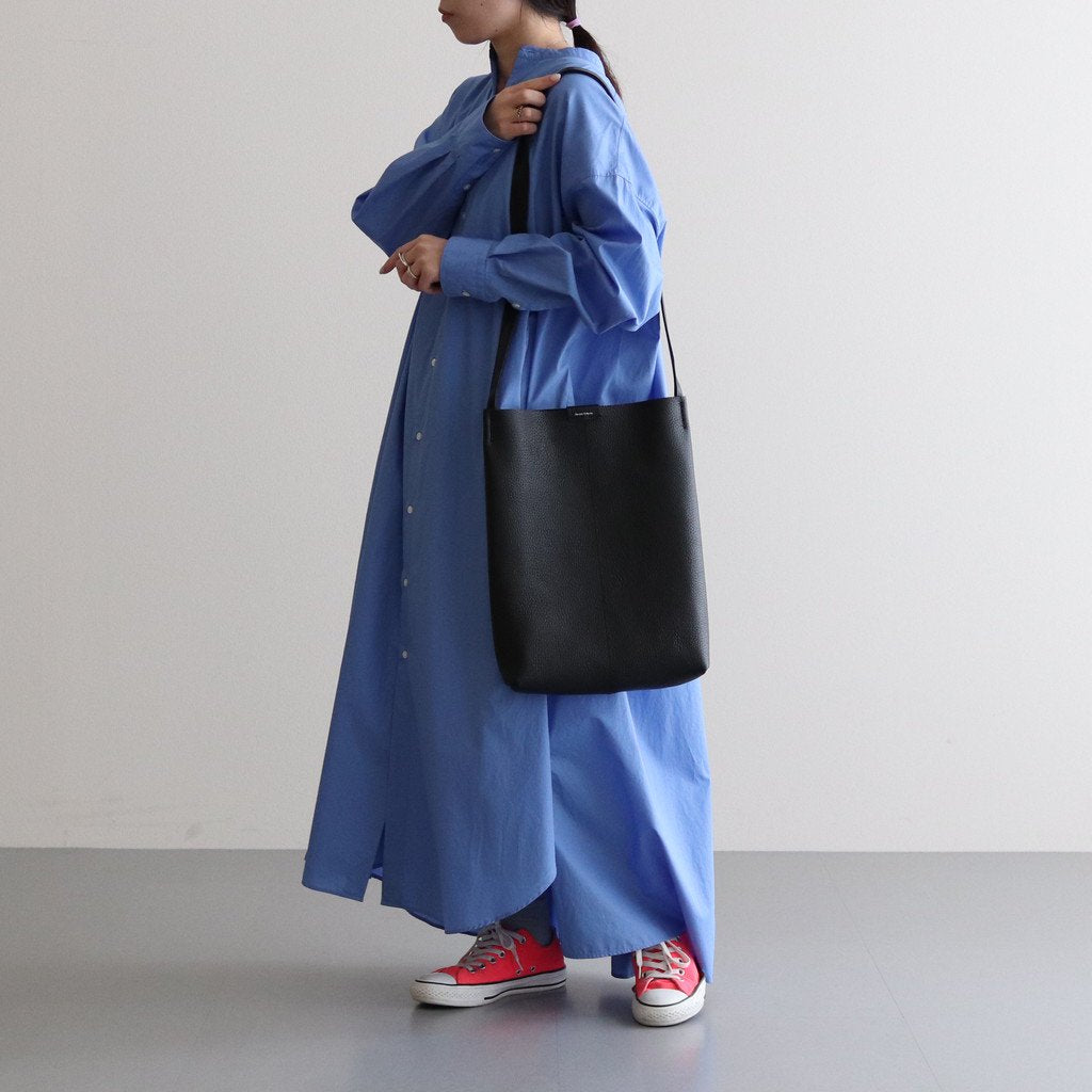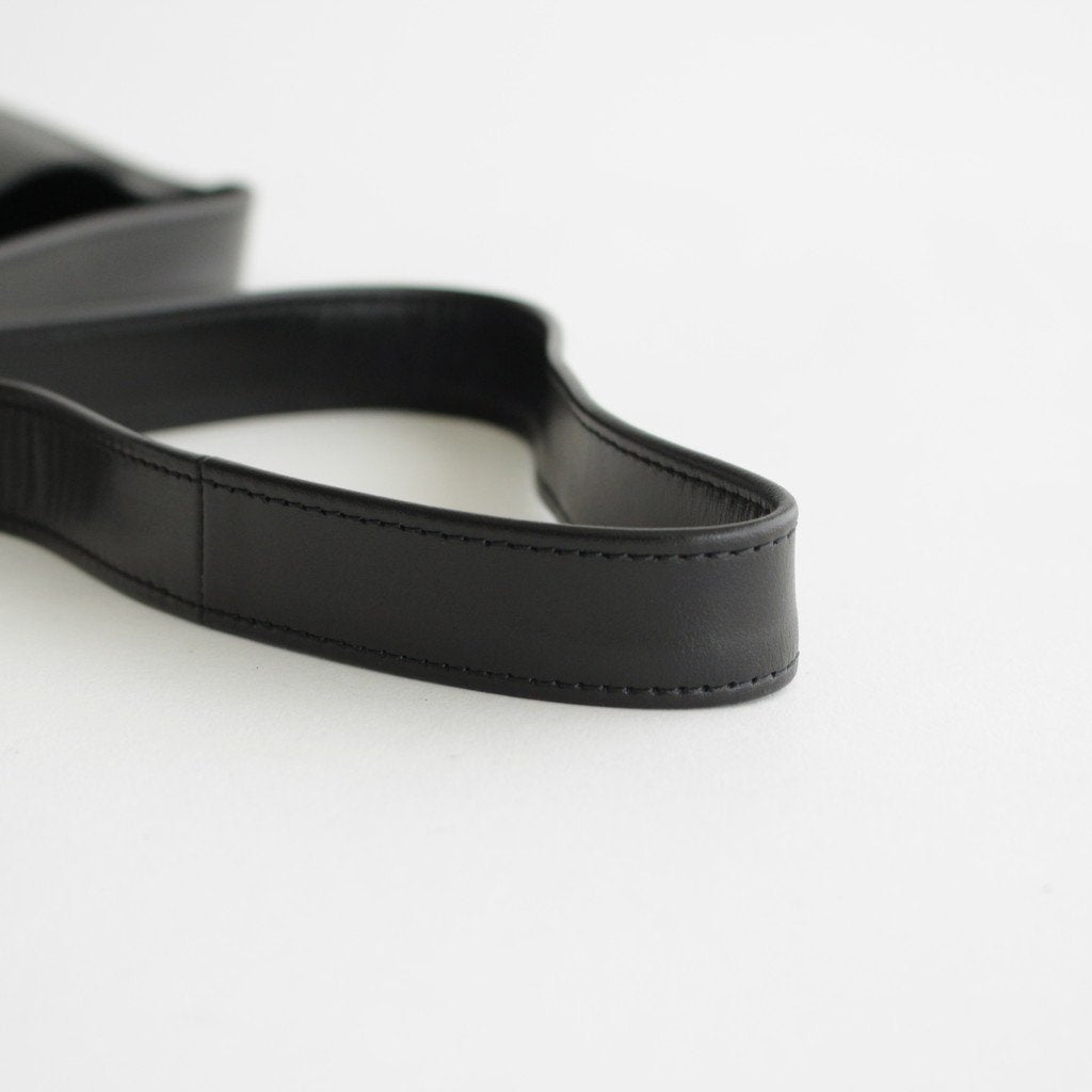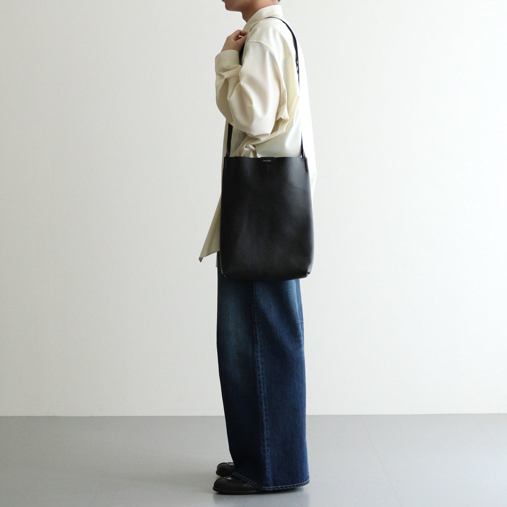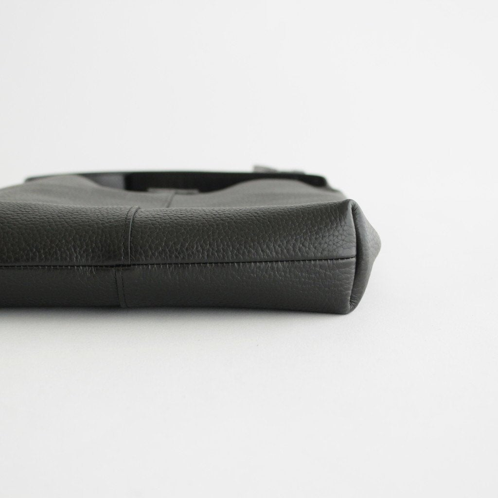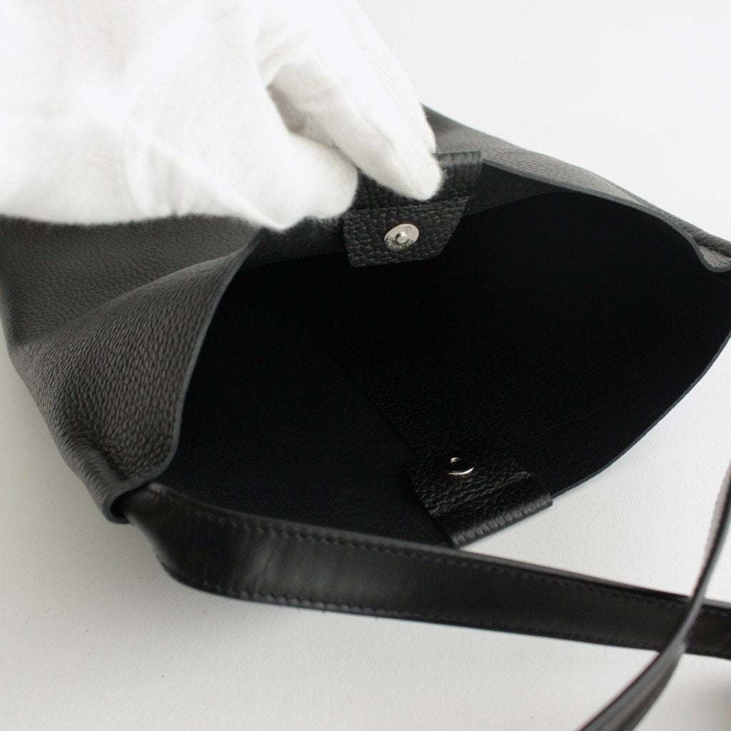 バッグ本体にはシボ感のあるカウレザーを使用。ボリュームが出過ぎないよう床処理を施して一枚仕立てで使用しています。ストラップには質感の違うレザーを使用しており上品な光沢感のある仕上がりに。