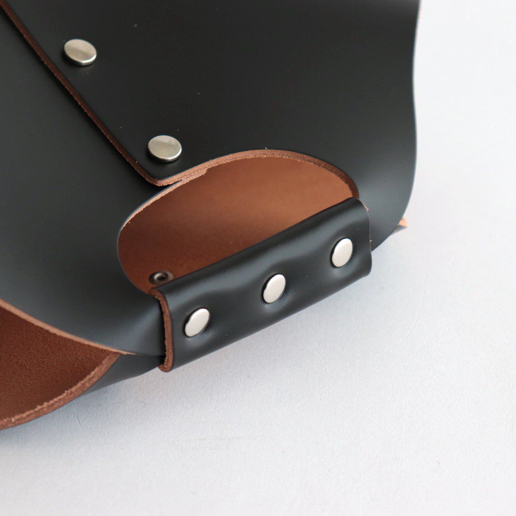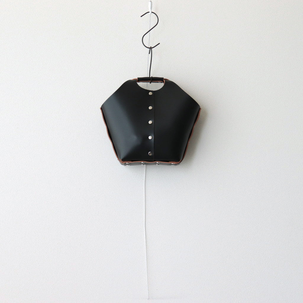 リベットでレザーを繋いだ独特の見た目と、一切縫製を使用しない特殊な製法が特徴的なassemble(アッセンブル)シリーズのケージ型バッグ サイズS。