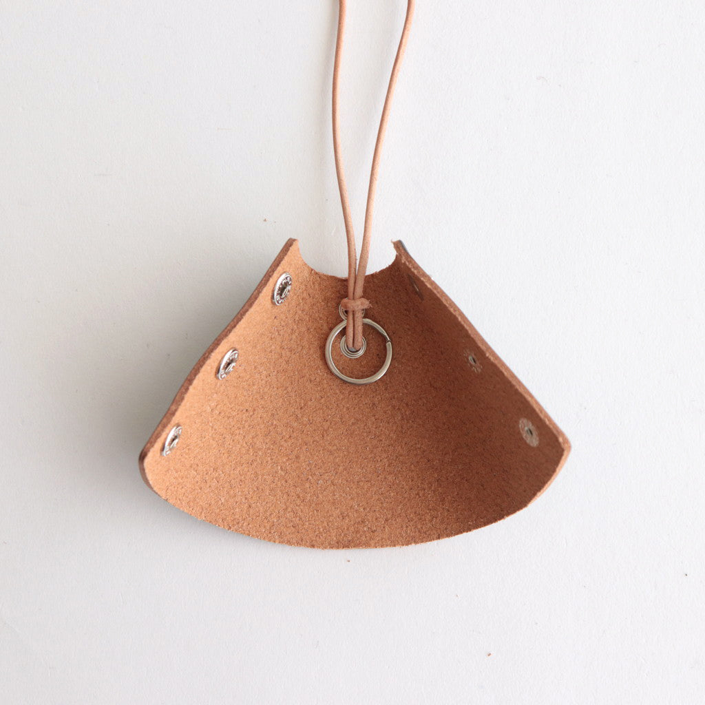 キーリングを中心にして円錐型にレザーを巻き付けたようなデザインのキーホルダー。キーホルダーとしての使用はもちろんのことお好きなものをつけたりアクセサリーとしての使用もおすすめです。