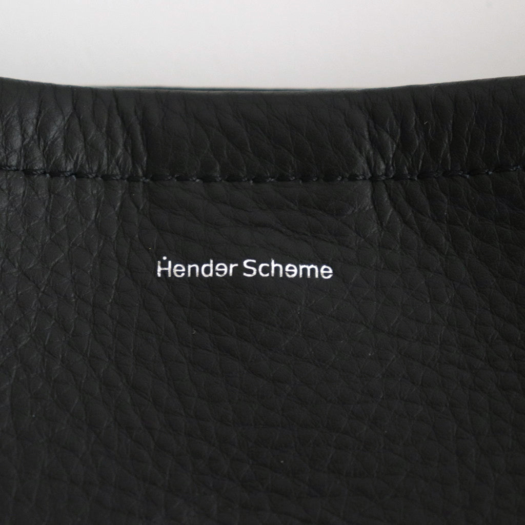 本体の革にはシボ感の強い上質なカウレザー素材を使用しています。しなやかで柔らかくレザー特有のしっかりとした厚みが特徴です。ストラップにはシュリンクカウレザーを使用、ライニングはつけずに床面にマチを持たせた台形の作り。ストラップは長さの調節幅も広くショルダーとしても手持ちとしても使用が可能なバックル調整型のデザイン。入り口に留めボタン付き。シンプルな構造で使い勝手も良い一品。Hender Schemeの箔押し入り。
