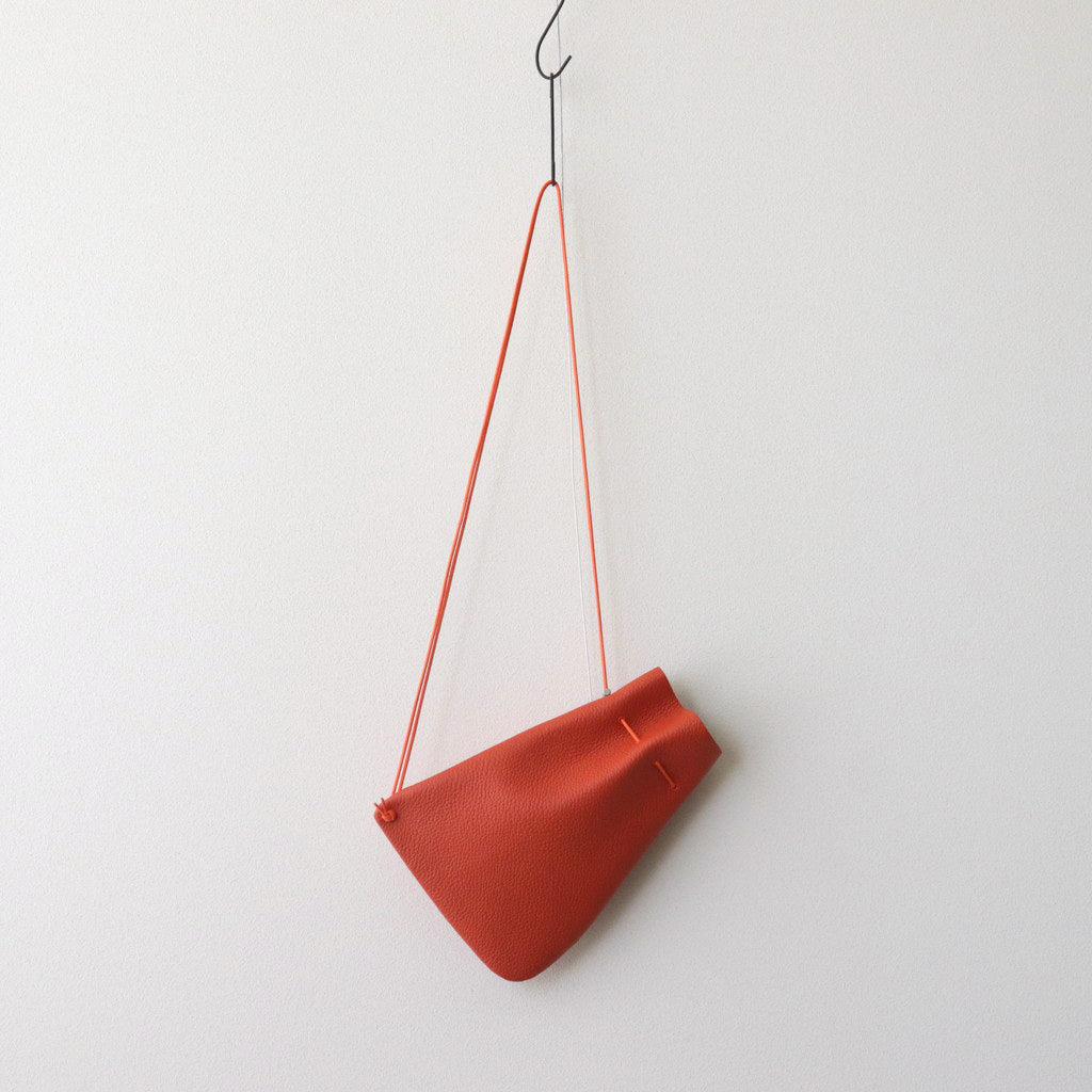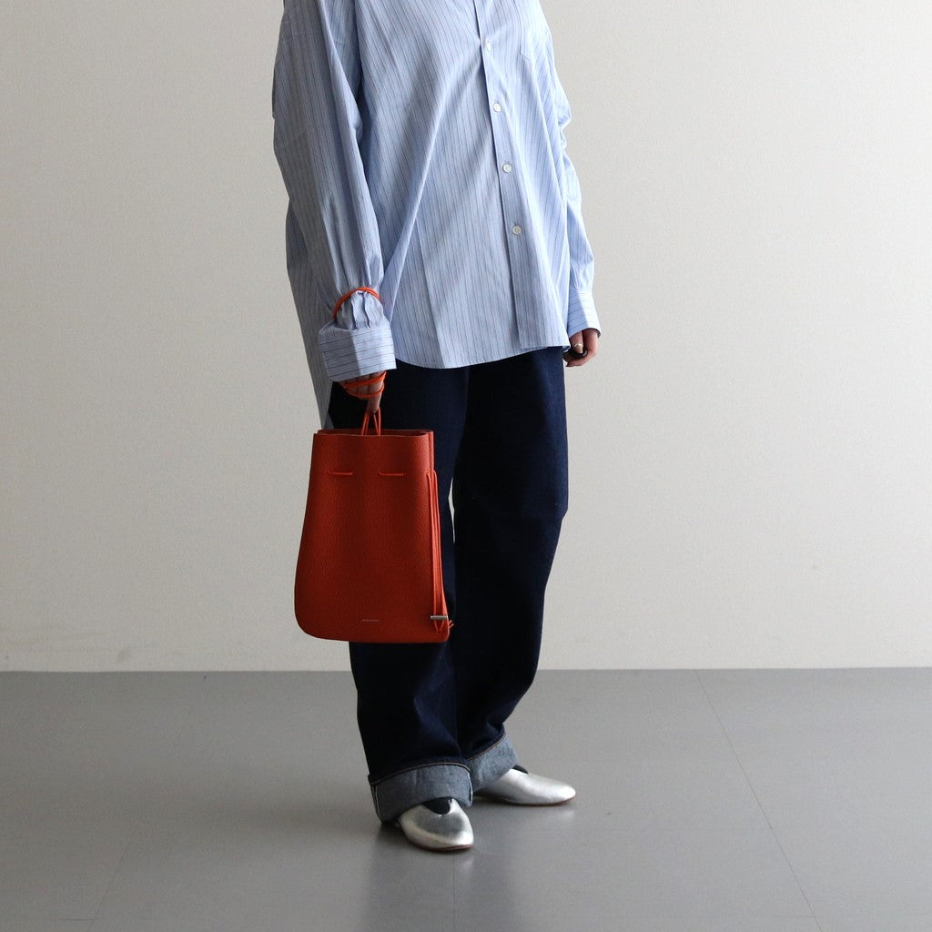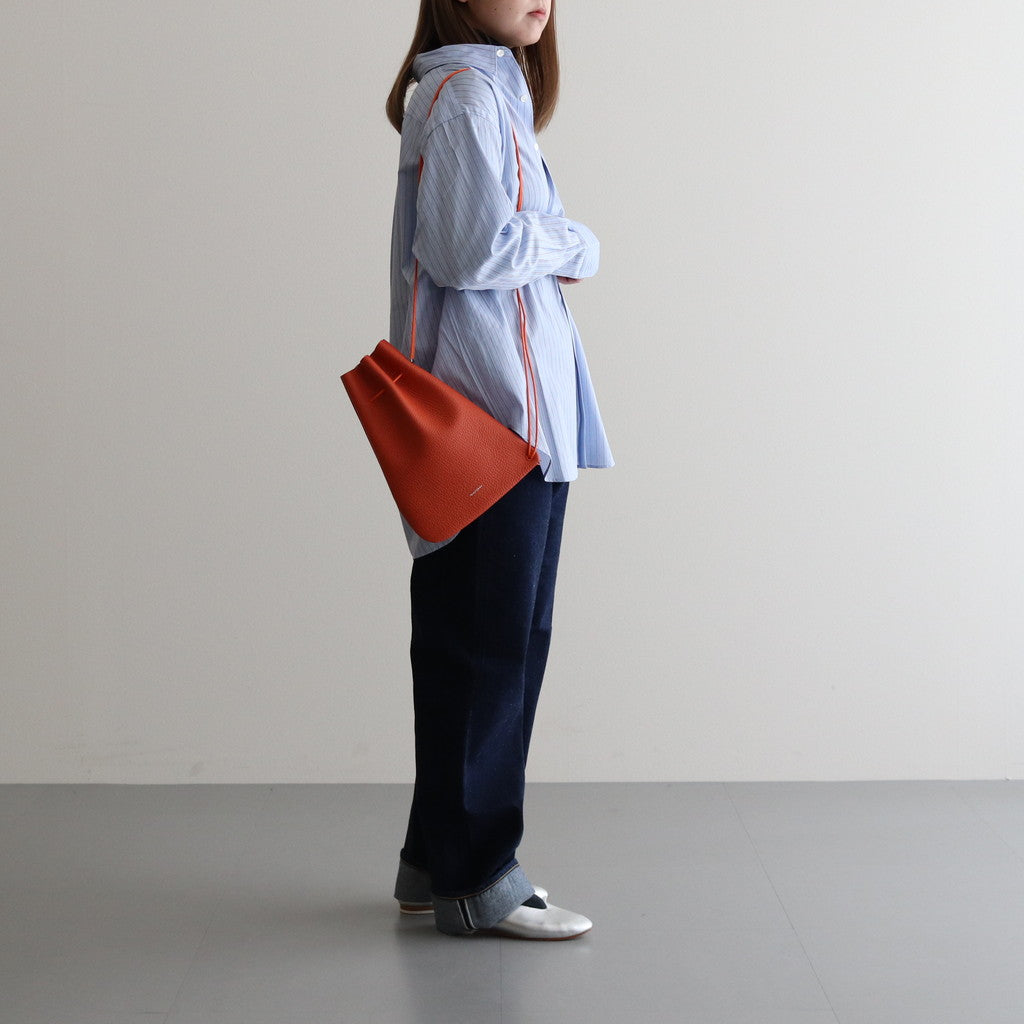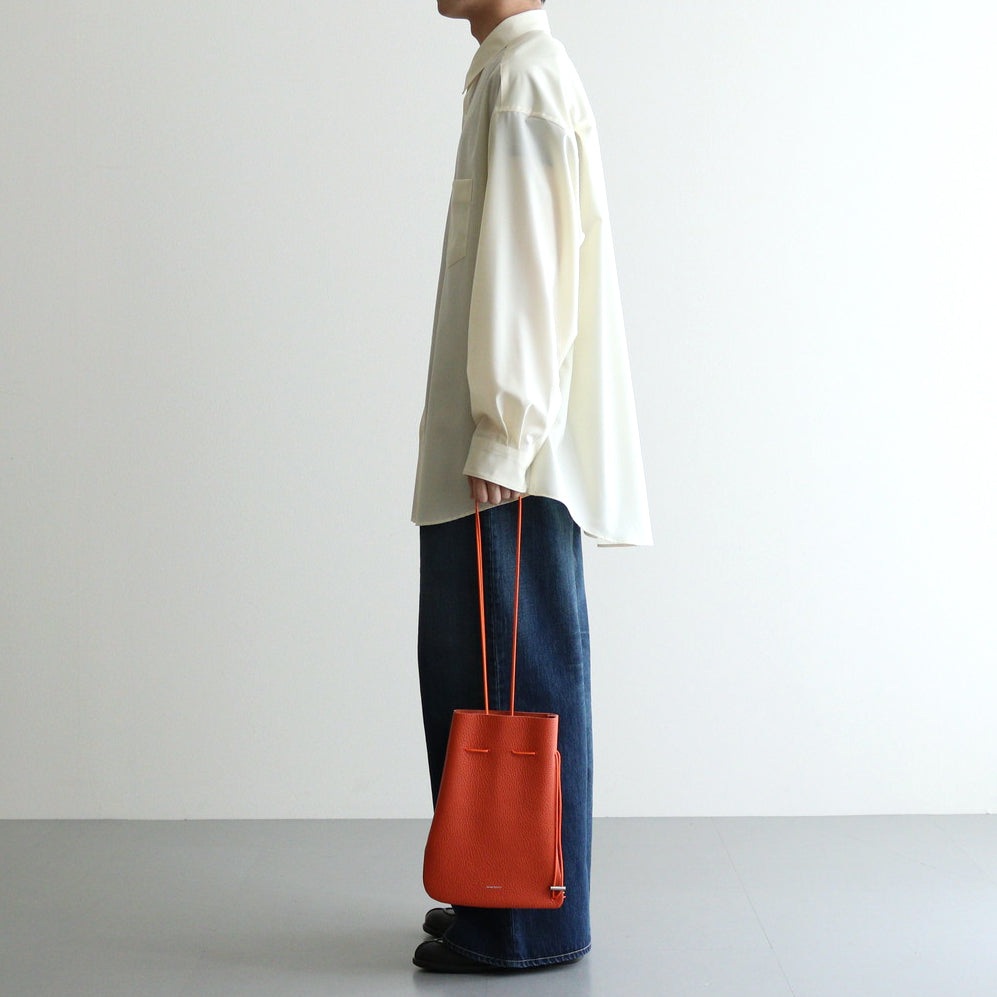 Hender Schemeの巾着ショルダーバッグ。シボ型押しの牛革を使用しています。内側から紐を引き抜くと手提げバッグとしても使える2way仕様。本体下部に通してある紐の結び目をずらすことで、長さを変更することができます。真鍮製のアジャスターがシボ革の重厚な雰囲気とマッチし、程よい高級感を演出しています。Hender Schemeの箔押し入り。