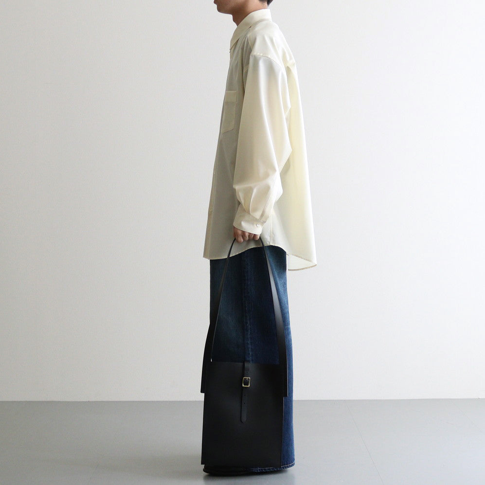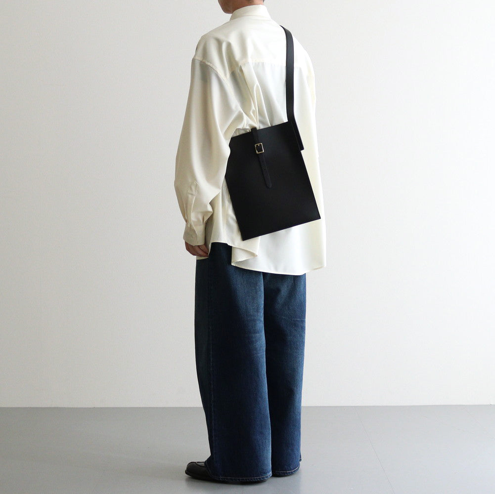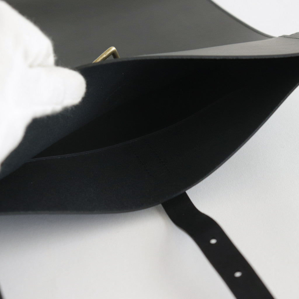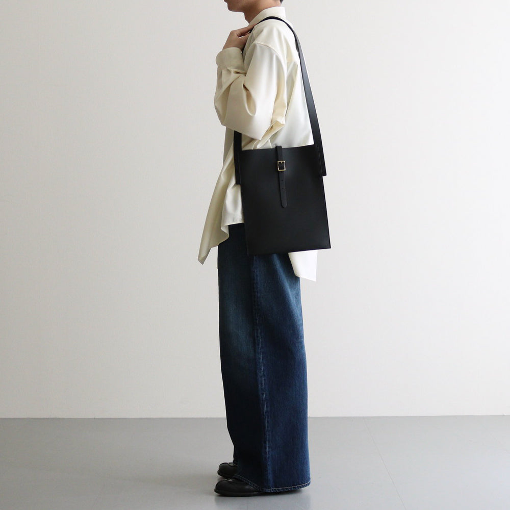 厚みを持たせたカウレザーにはしっかりとした張り感があり、落ち着いた雰囲気でありながら重厚な雰囲気も感じることもできる仕上がり。バッグの裏面から表に向かってベルトが走り、バッグを開閉できるような仕様に。使用されているパーツなどは武骨でありながら上品な印象を感じる一品です。