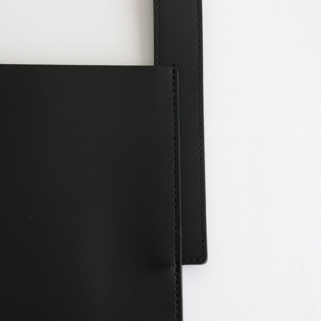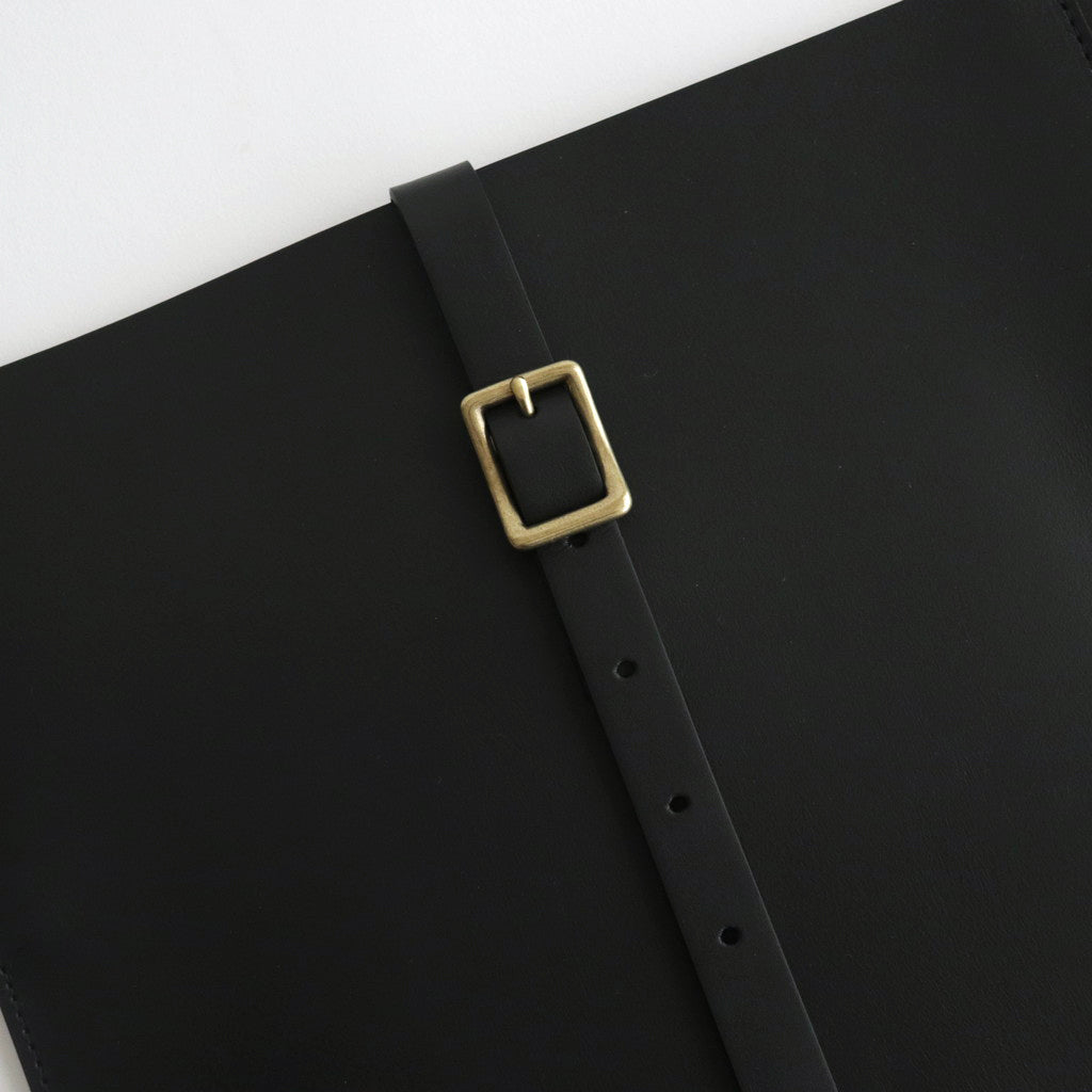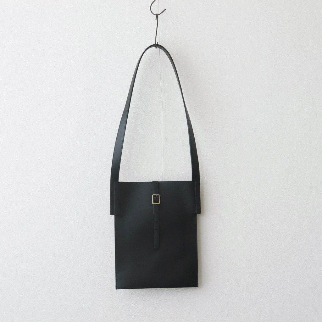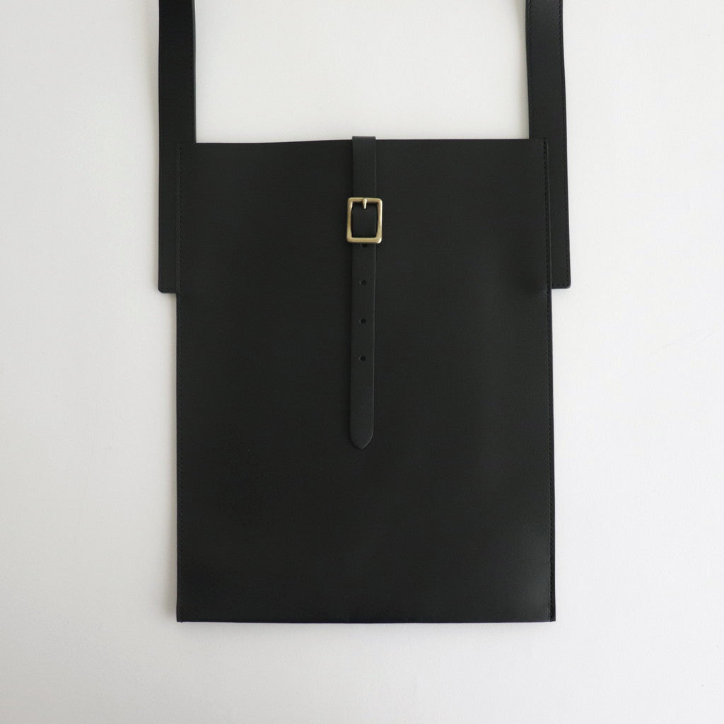厚みを持たせたカウレザーにはしっかりとした張り感があり、落ち着いた雰囲気でありながら重厚な雰囲気も感じることもできる仕上がり。バッグの裏面から表に向かってベルトが走り、バッグを開閉できるような仕様に。使用されているパーツなどは武骨でありながら上品な印象を感じる一品です。