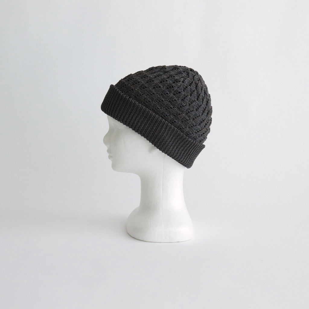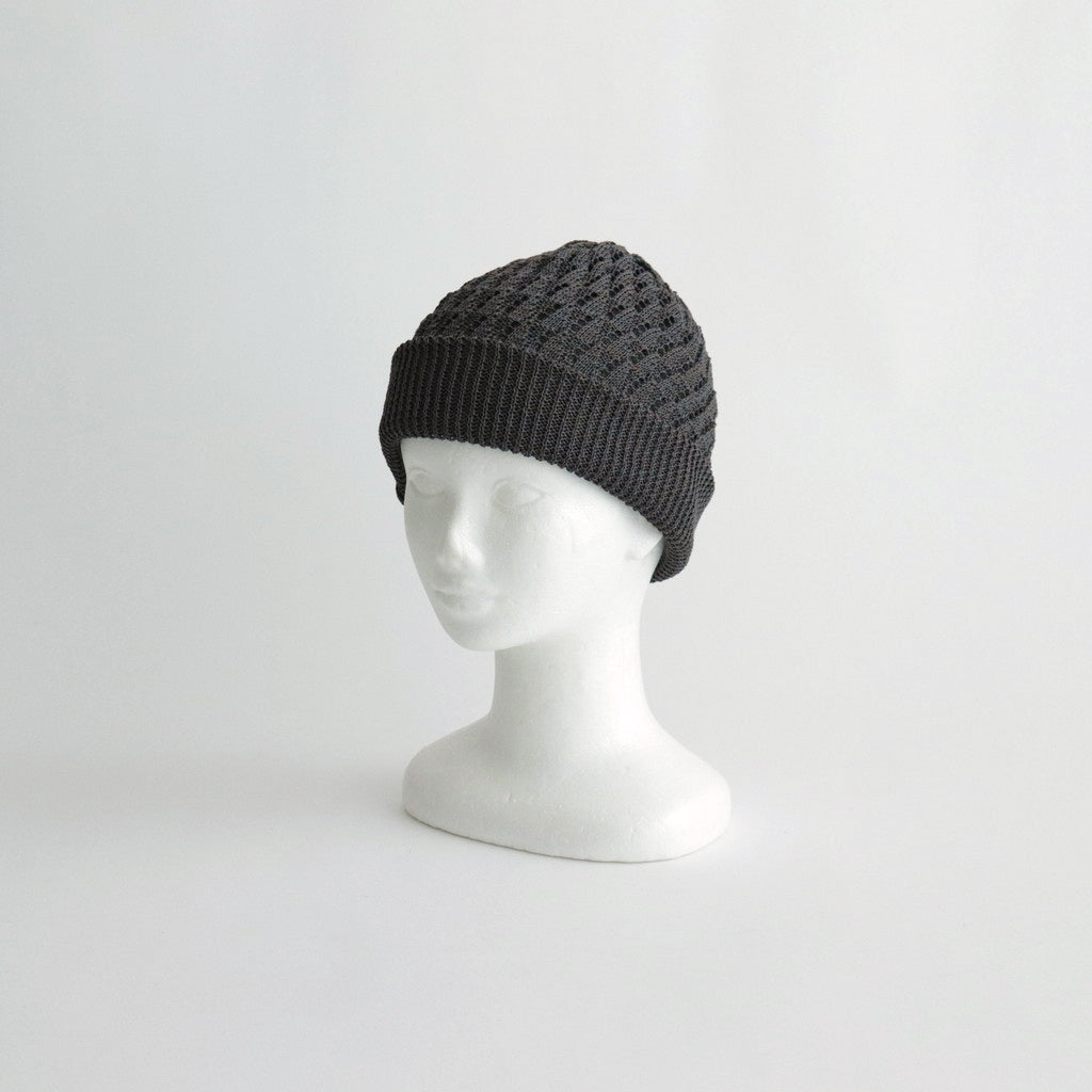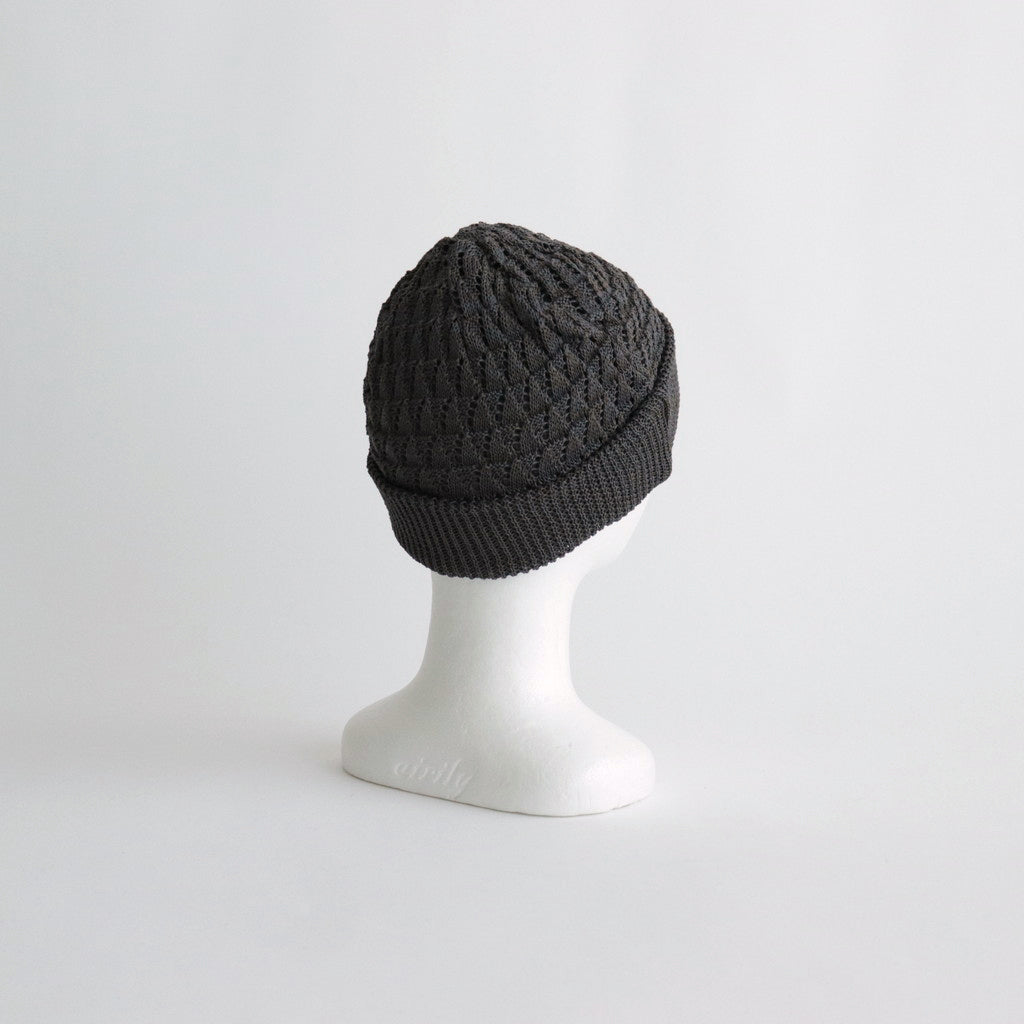 麻のようなドライなタッチで清涼感とシャリ感のあるコットン製リバーシブルニット帽。表面は凹凸のある幾何学柄の編み、裏面はシンプルに1×1のリブ編みで仕上げています。被り口はどちらもリブ編みに切換え、フィット性を向上。見た目も肌触りも清涼感があるため年中着用も可能。
