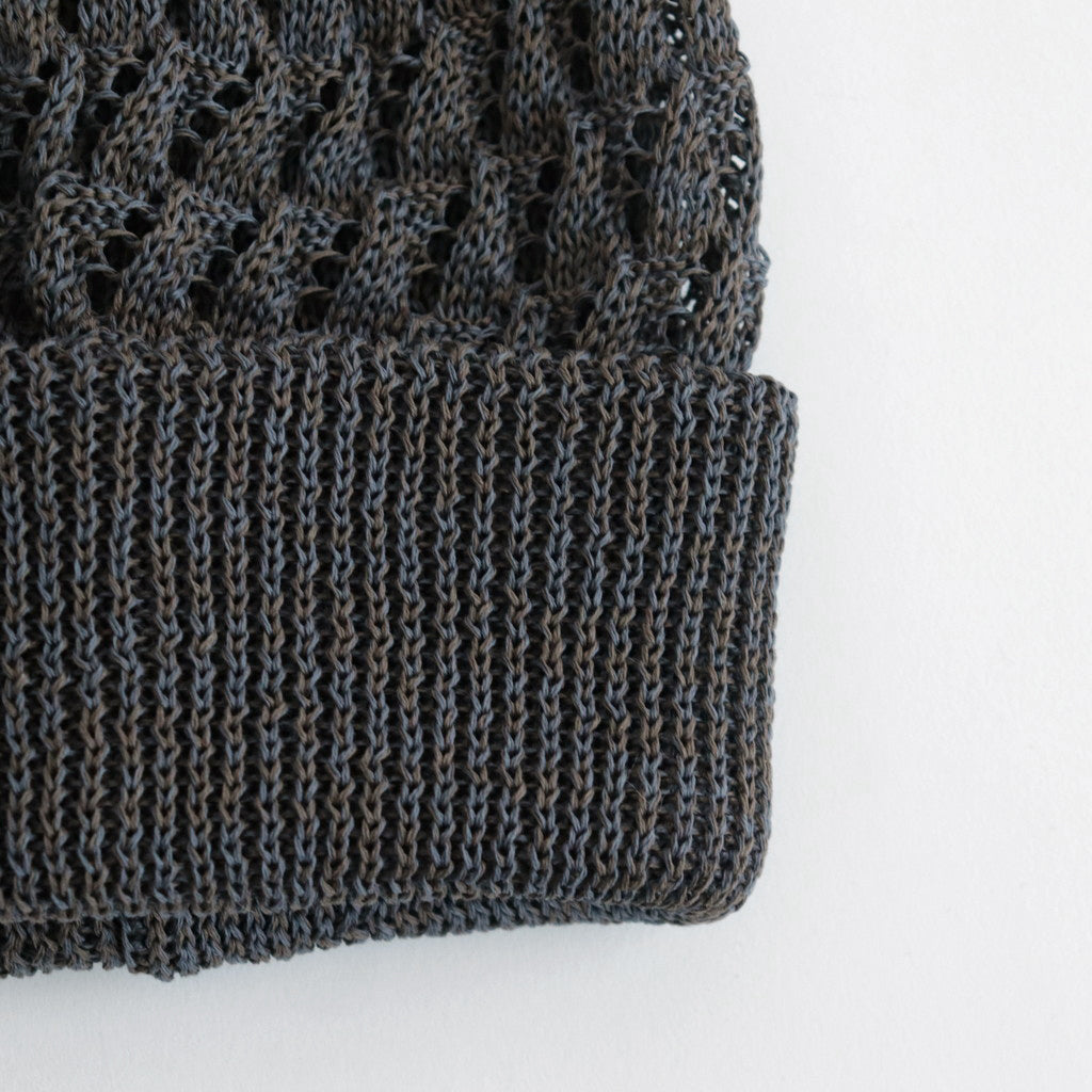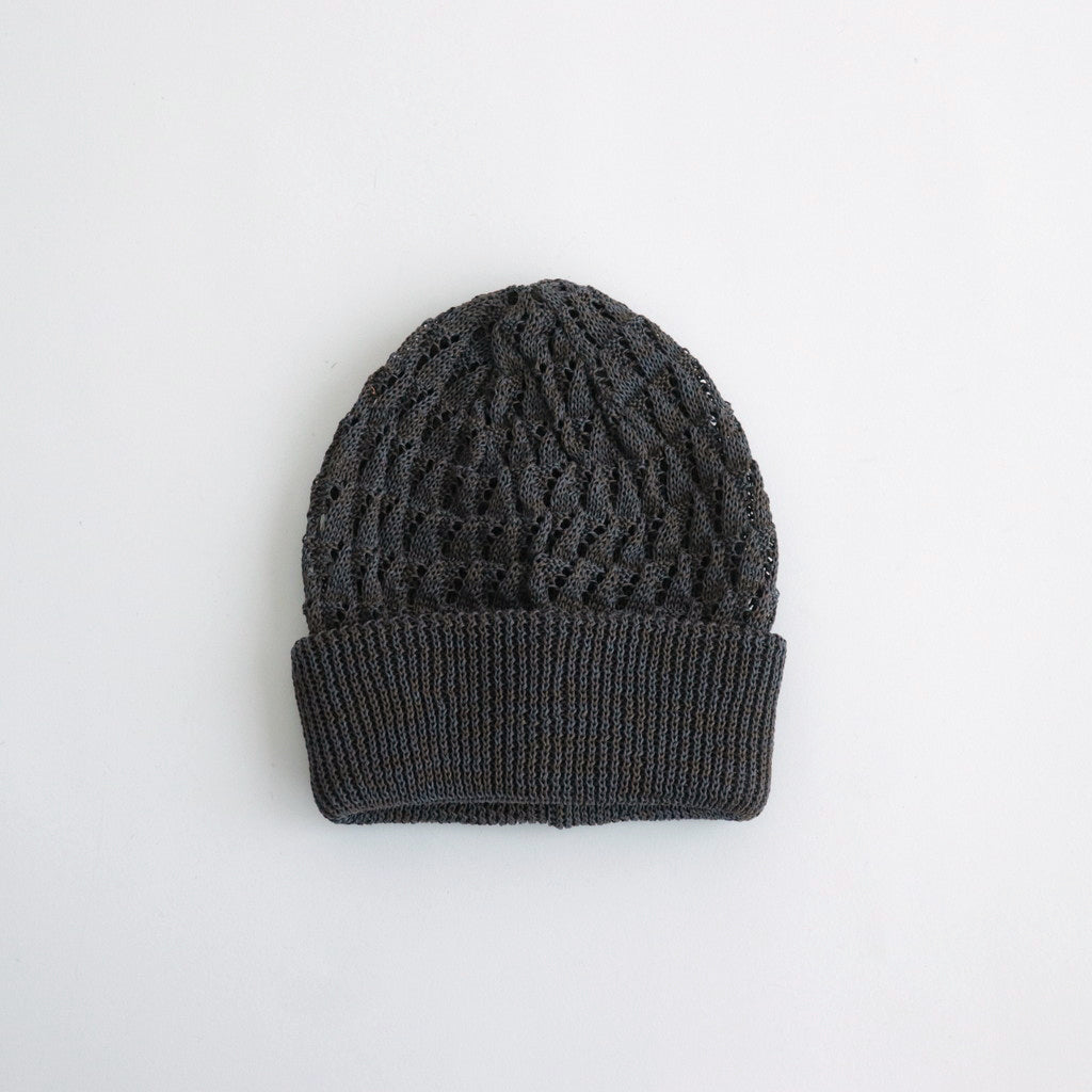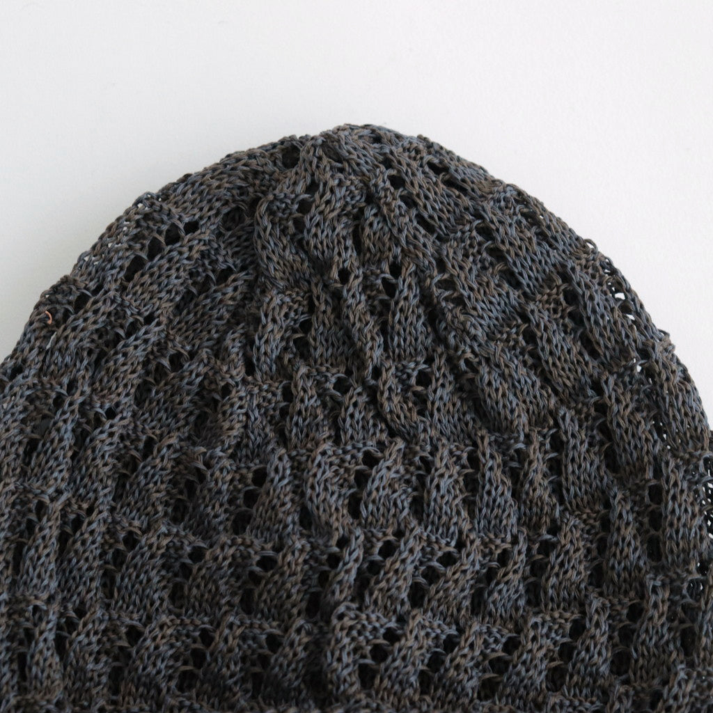 麻のようなドライなタッチで清涼感とシャリ感のあるコットン製リバーシブルニット帽。表面は凹凸のある幾何学柄の編み、裏面はシンプルに1×1のリブ編みで仕上げています。被り口はどちらもリブ編みに切換え、フィット性を向上。見た目も肌触りも清涼感があるため年中着用も可能。