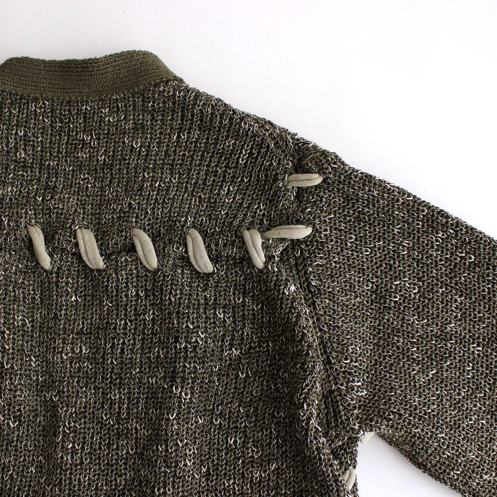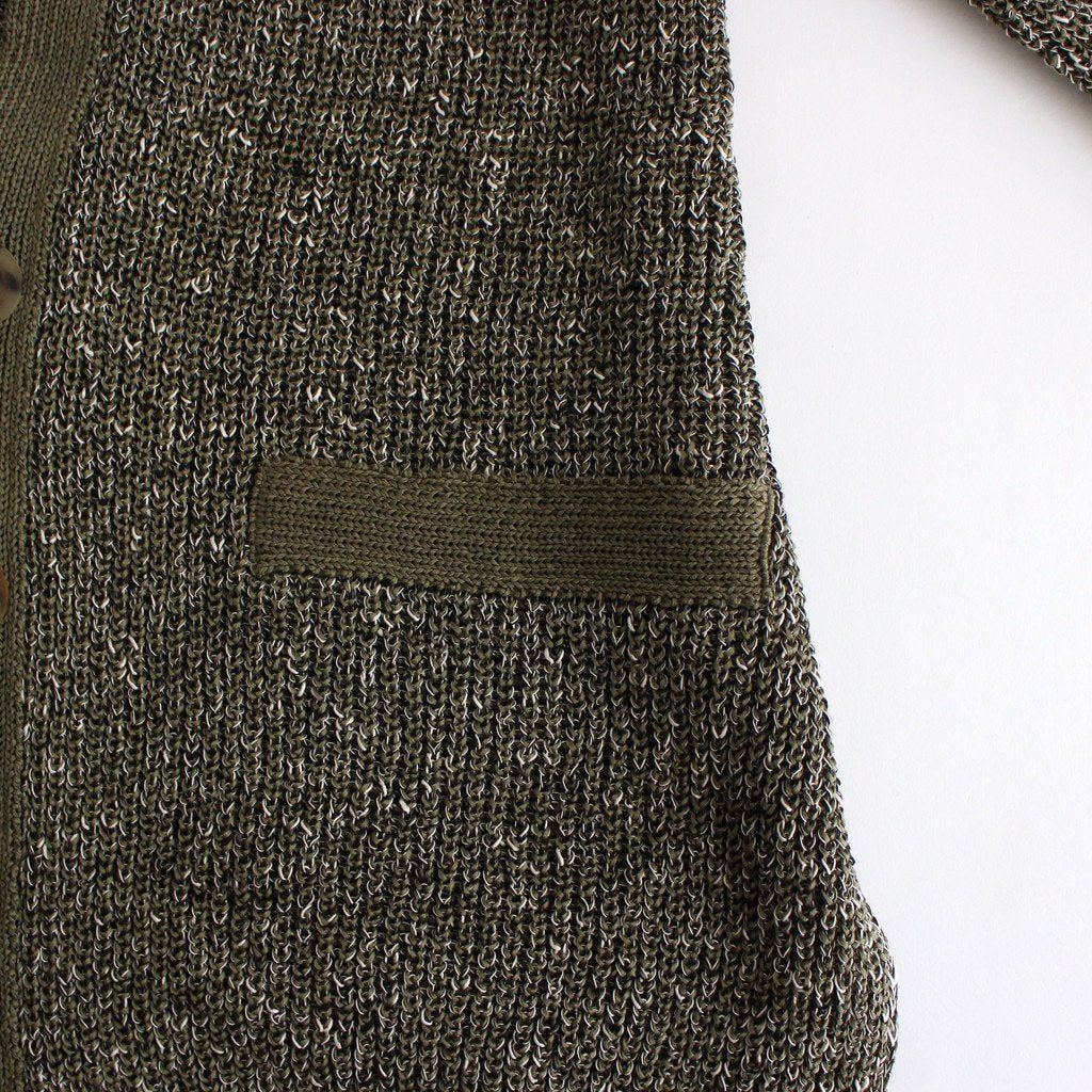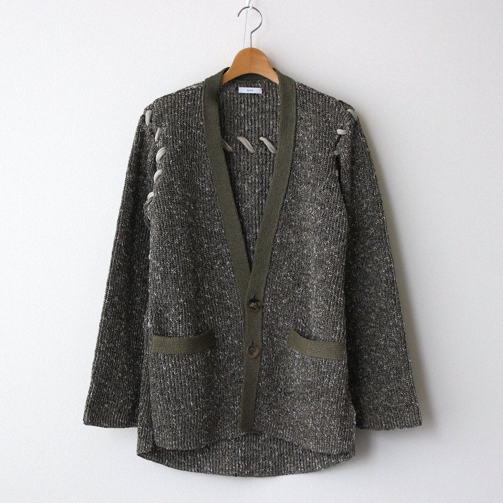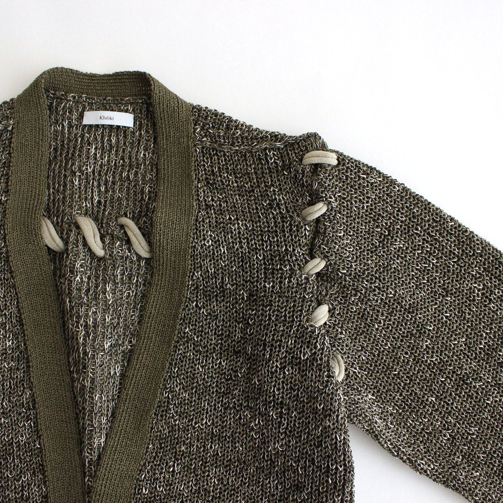 kheikiのブレイドカーディガン。リネンのテープでパーツを継いだオーバーサイズカーディガンです。メインにリネンのようなドライな質感を樹脂のコーティングによって表現した素材を使用。陶器の不規則な凹凸や、奥行きある色合いを表現する為、テープ状の糸と、糸の太さにムラのある糸を、それぞれ異なる色の組み合わせで編成しております。素材に厚みがあるが糸の特性により軽く、ドライな質感が特徴。夏らしいシアー感がありドライでありながらも、柔らかな着心地になっております。シルエットは肩周りや身幅、アーム部分にたっぷりとゆとりを持たせた、ゆったりとしたオーバーサイズシルエット。テープを緩めた箇所はパーツ同士に隙間が出来、インナーが見える仕様となっております。素材感やシルエット、細部に至るまでを徹底してこだわったkheikiならではのプロダクトです。