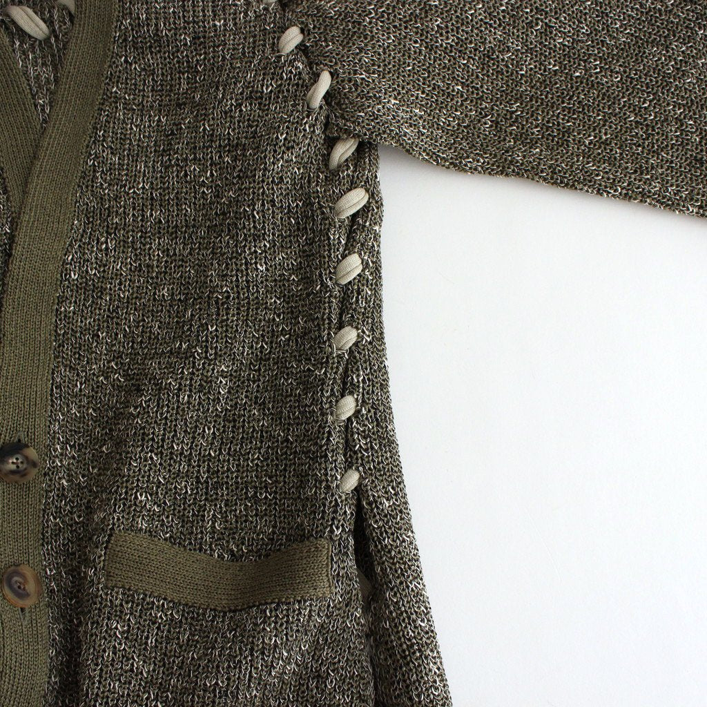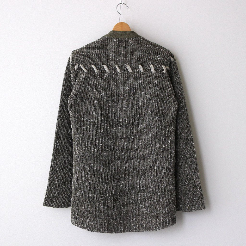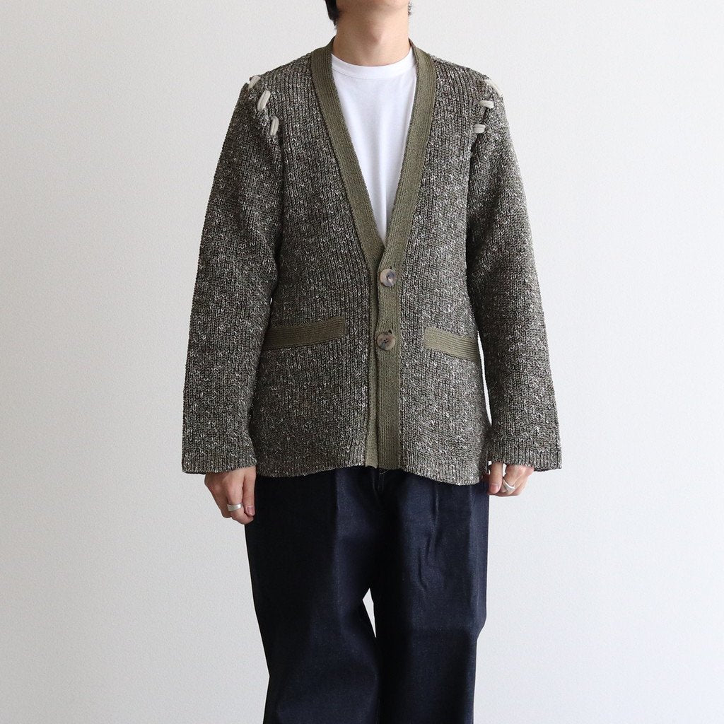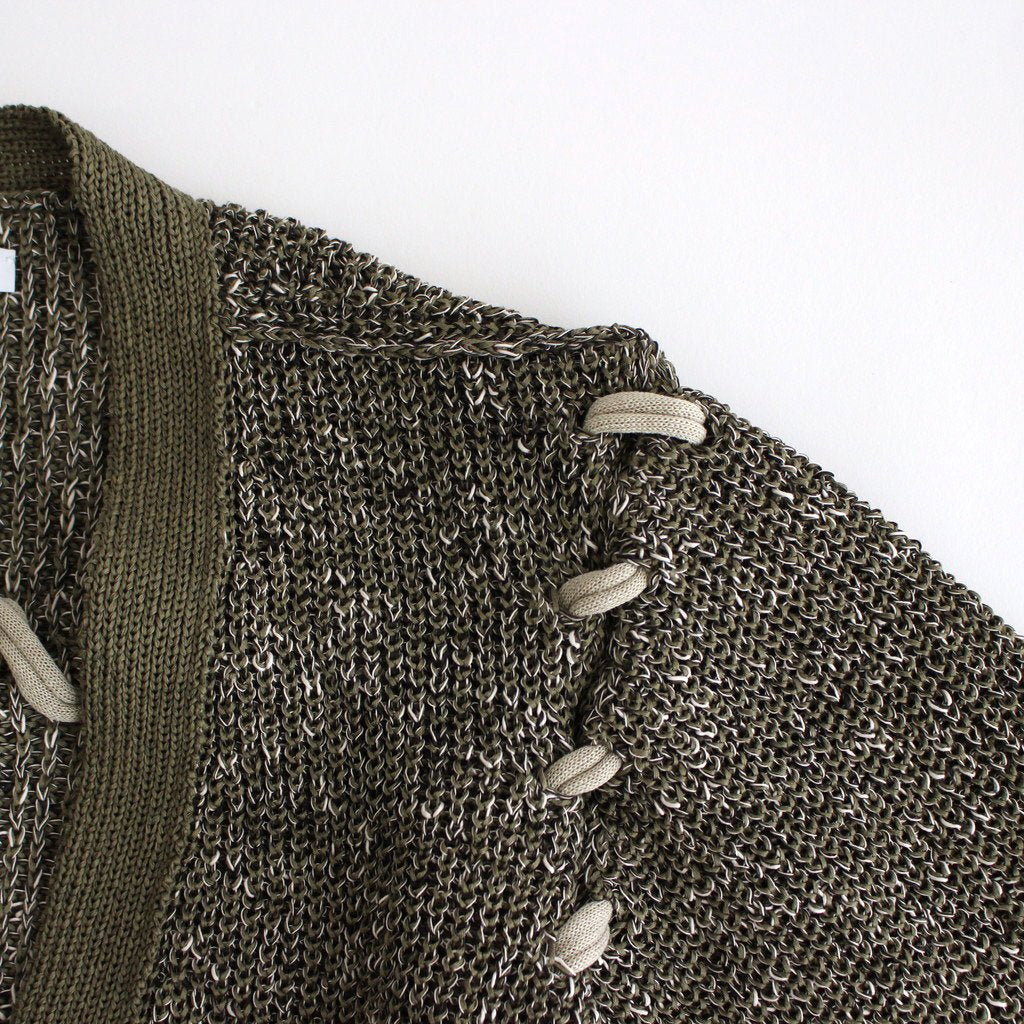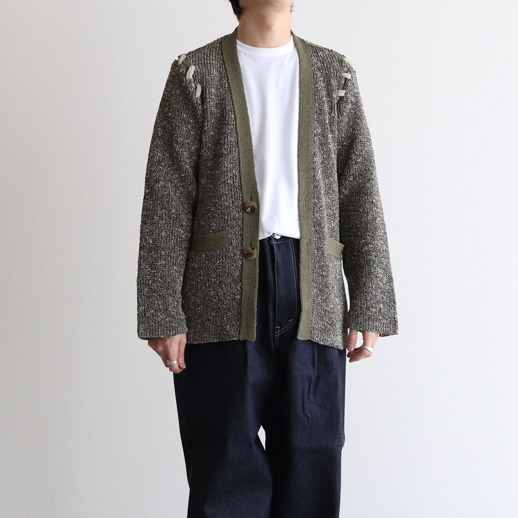 kheikiのブレイドカーディガン。リネンのテープでパーツを継いだオーバーサイズカーディガンです。メインにリネンのようなドライな質感を樹脂のコーティングによって表現した素材を使用。陶器の不規則な凹凸や、奥行きある色合いを表現する為、テープ状の糸と、糸の太さにムラのある糸を、それぞれ異なる色の組み合わせで編成しております。素材に厚みがあるが糸の特性により軽く、ドライな質感が特徴。夏らしいシアー感がありドライでありながらも、柔らかな着心地になっております。シルエットは肩周りや身幅、アーム部分にたっぷりとゆとりを持たせた、ゆったりとしたオーバーサイズシルエット。テープを緩めた箇所はパーツ同士に隙間が出来、インナーが見える仕様となっております。素材感やシルエット、細部に至るまでを徹底してこだわったkheikiならではのプロダクトです。