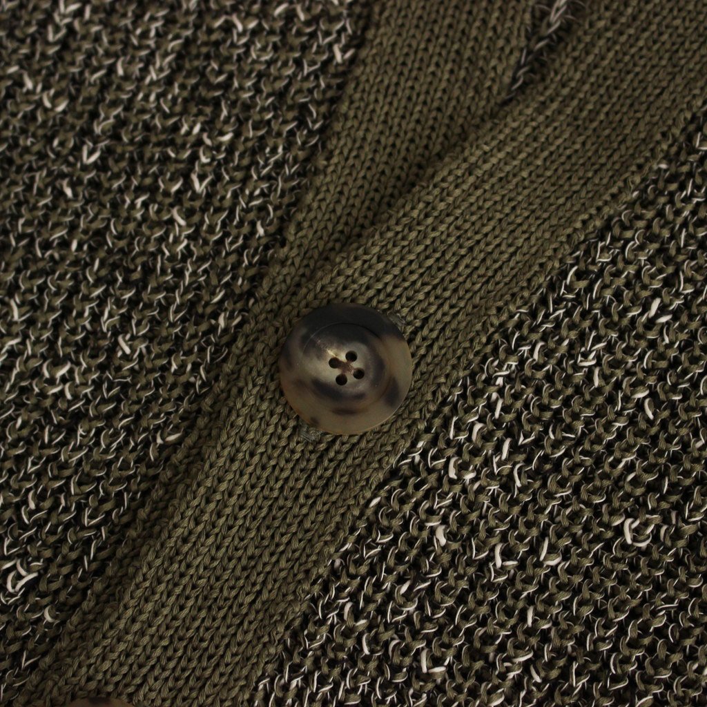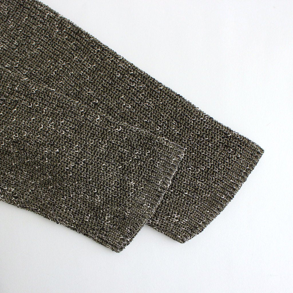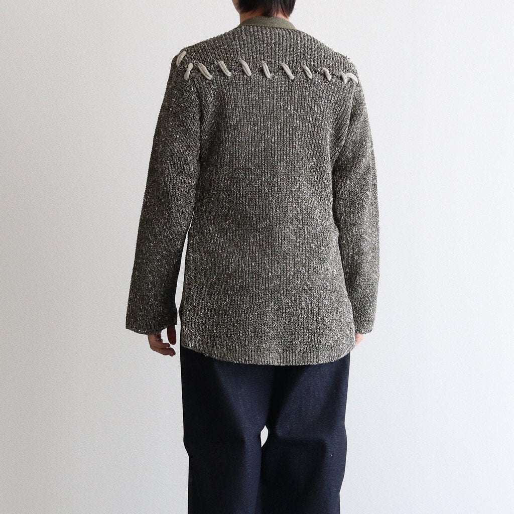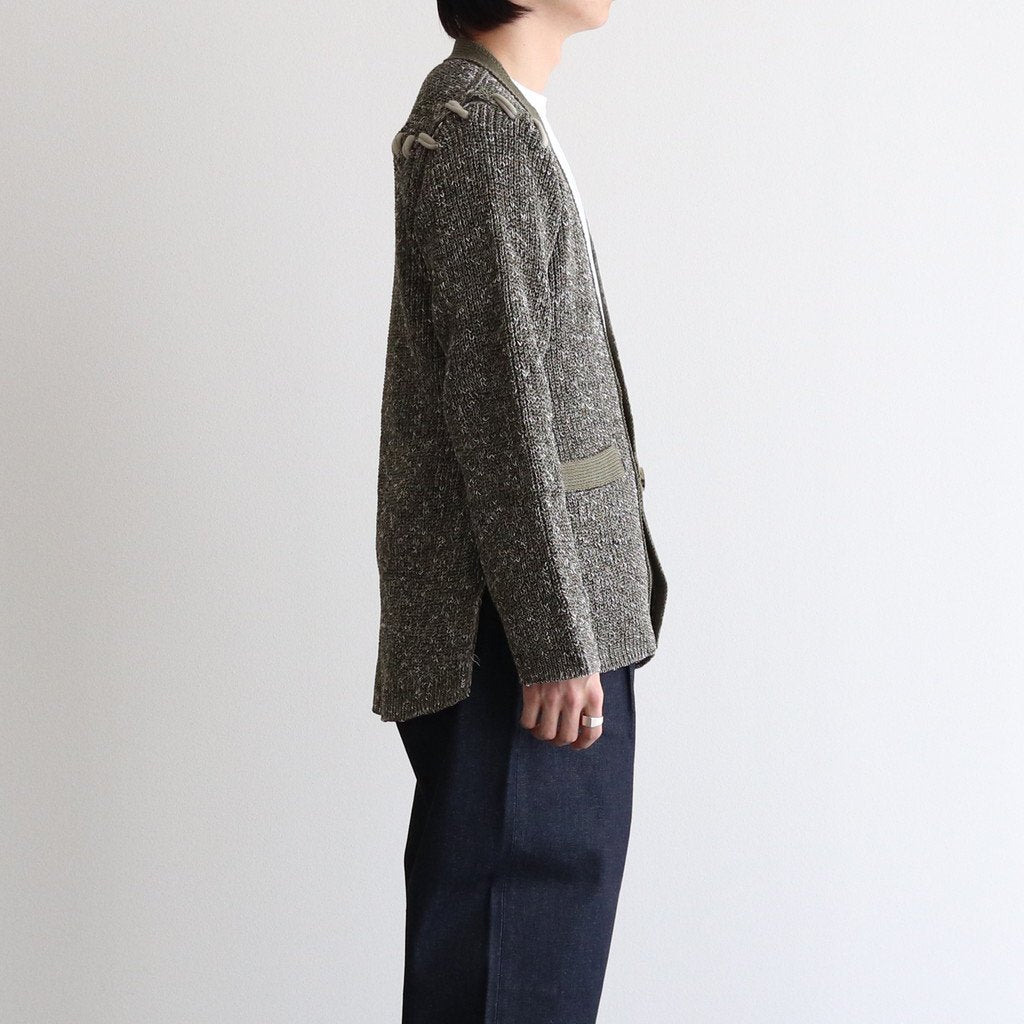kheikiのブレイドカーディガン。リネンのテープでパーツを継いだオーバーサイズカーディガンです。メインにリネンのようなドライな質感を樹脂のコーティングによって表現した素材を使用。陶器の不規則な凹凸や、奥行きある色合いを表現する為、テープ状の糸と、糸の太さにムラのある糸を、それぞれ異なる色の組み合わせで編成しております。素材に厚みがあるが糸の特性により軽く、ドライな質感が特徴。夏らしいシアー感がありドライでありながらも、柔らかな着心地になっております。シルエットは肩周りや身幅、アーム部分にたっぷりとゆとりを持たせた、ゆったりとしたオーバーサイズシルエット。テープを緩めた箇所はパーツ同士に隙間が出来、インナーが見える仕様となっております。素材感やシルエット、細部に至るまでを徹底してこだわったkheikiならではのプロダクトです。